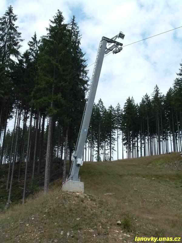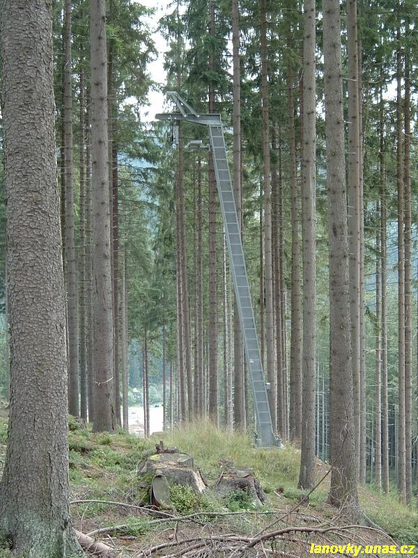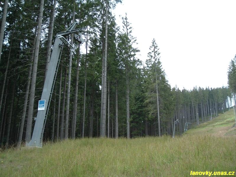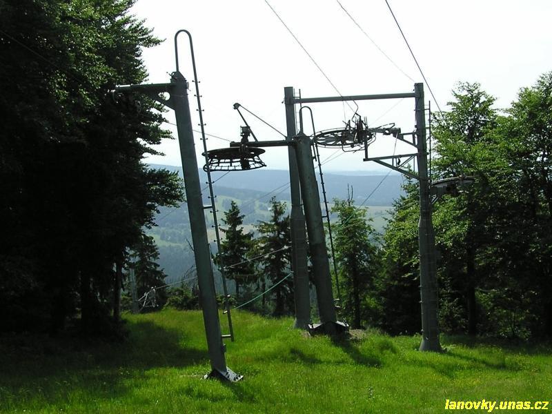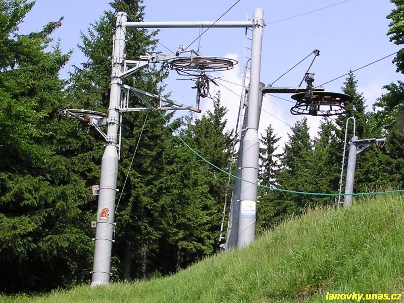 vodorovným lanáčem. Vratná větev s délkou 1039 m vedla ovšem lesem v přímé trase. Trasu tvořily jednovětvové podpěry odvozené od podpěr sedačkových lanovek Transporta.