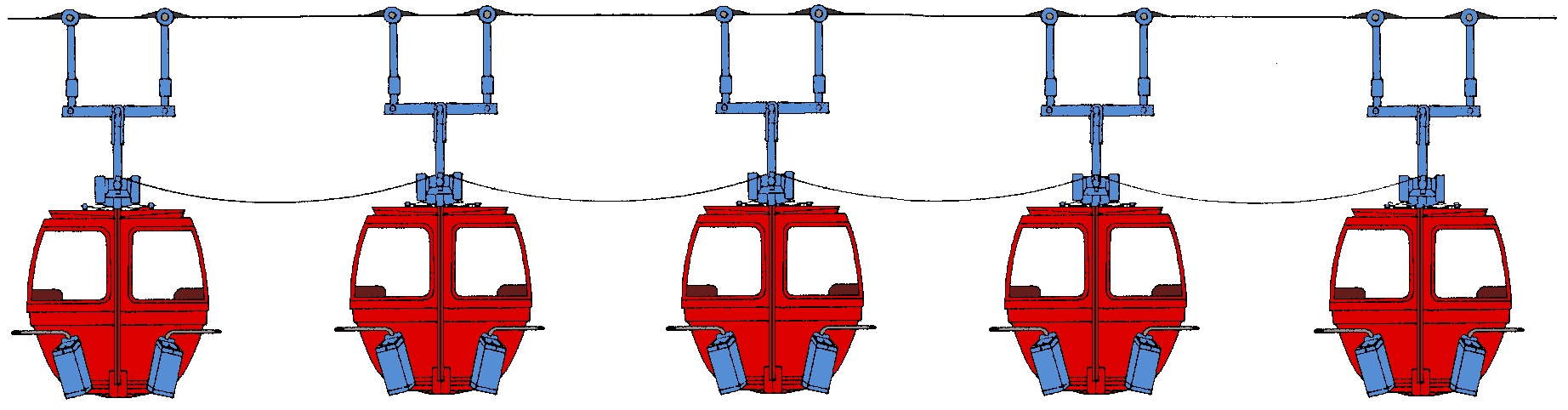 a taktéž v seskupení kabinek pevně uchycených k dopravnímu lanu do několika