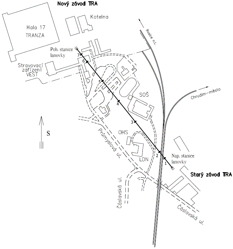 dopravní výšku 16m. Trasa byla vedena ze starého závodu přes železniční trať –