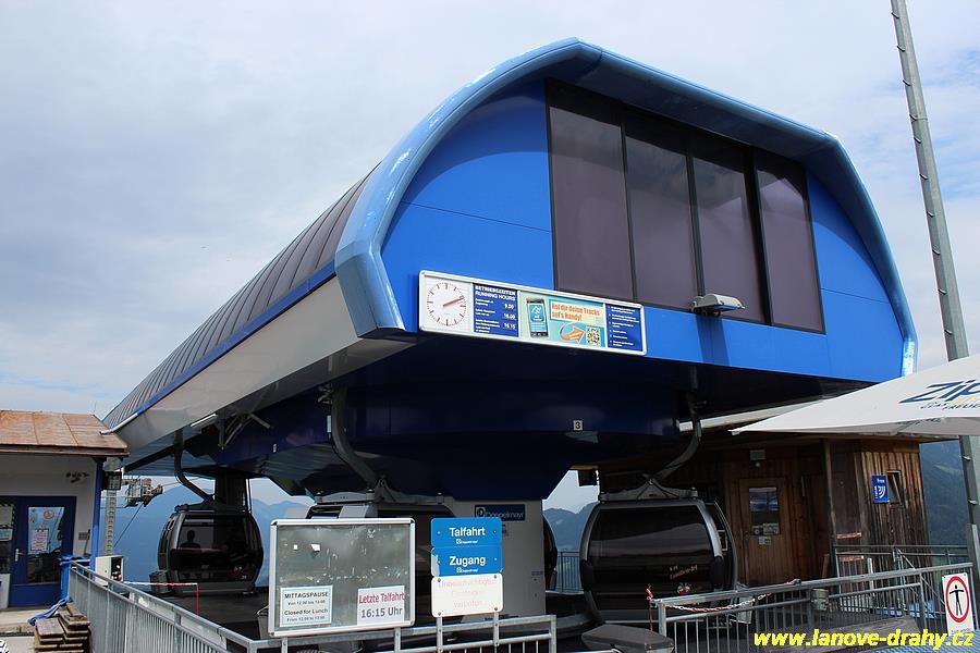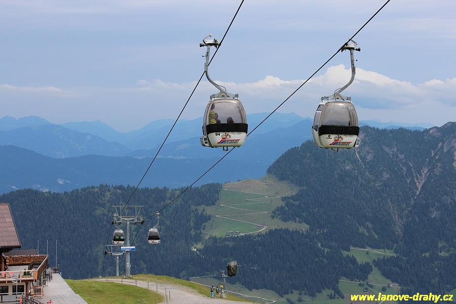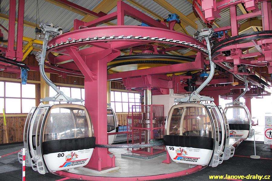 kabinky Ultra 6 firmy Swoboda. Wiedersbergerhornbahn je vybavena mezistanicí, ve