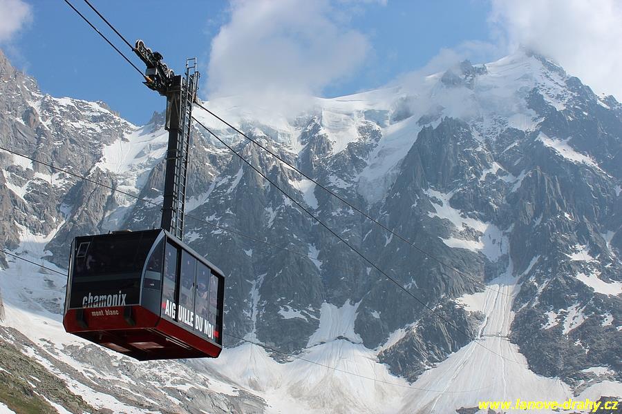 je jízda dvěma úseky kyvadlových lanovek na Aiguille du Midi do nadmořské výšky