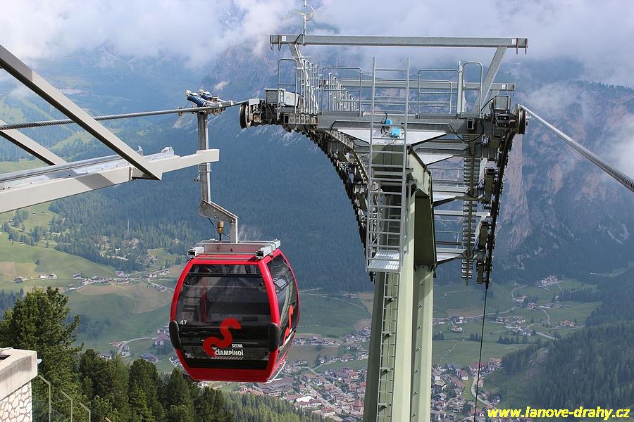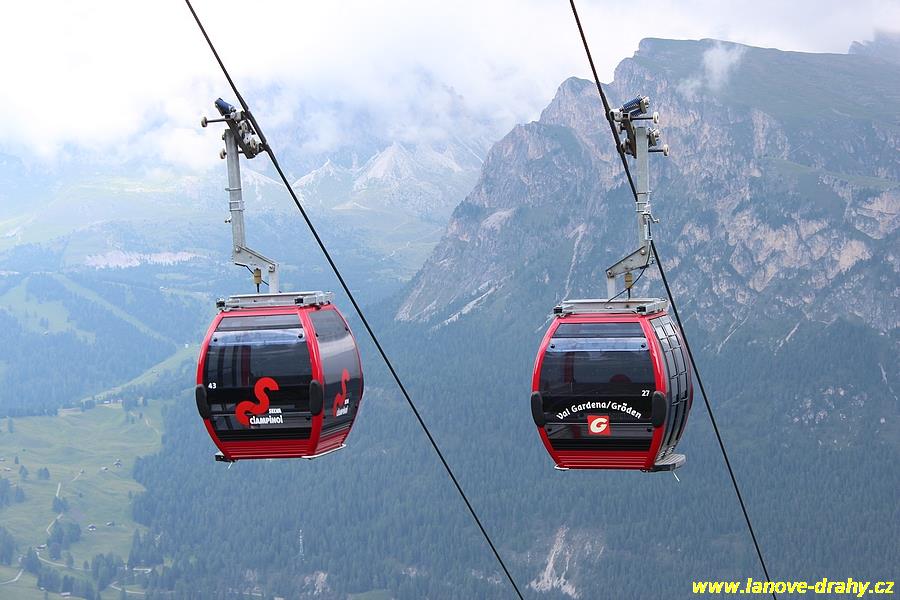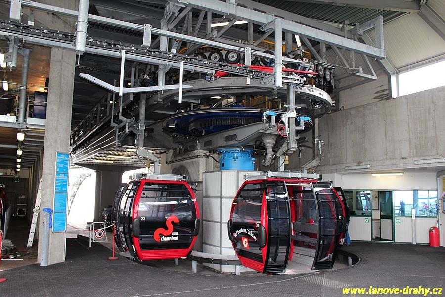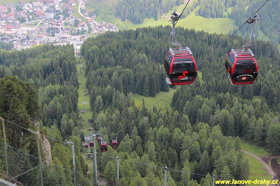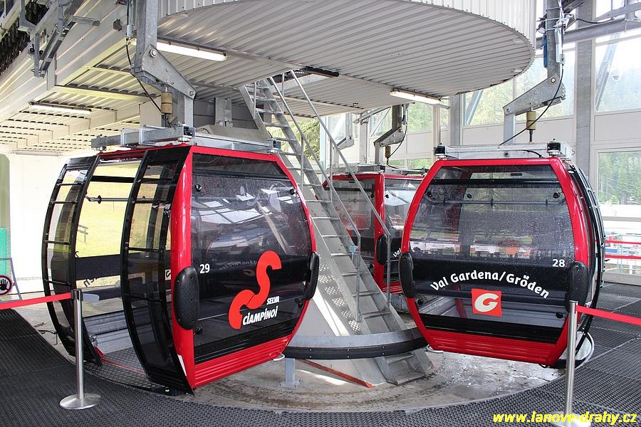 dvanáctimístná kabinková lanovka na Ciampinoi. Tato lanová dráha od firmy