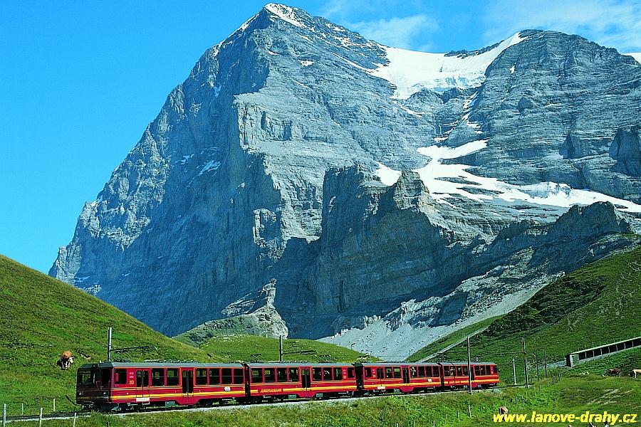 roku otevřené ozubnicové dráhy Wengernalpbahn, supící směrem do sedla Kleine
