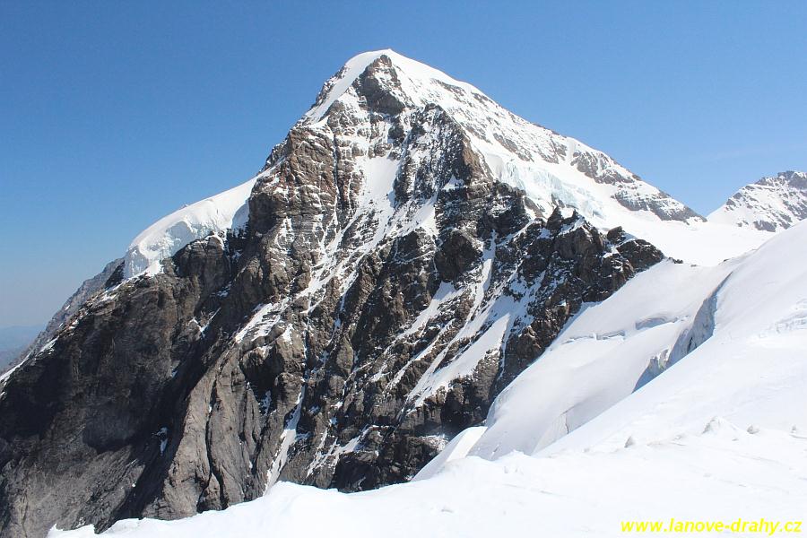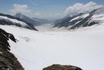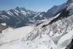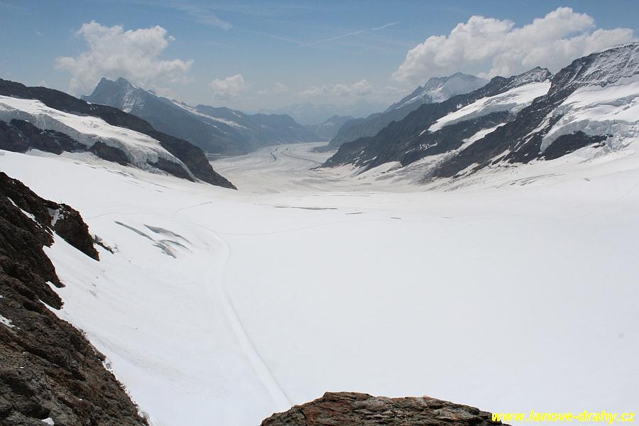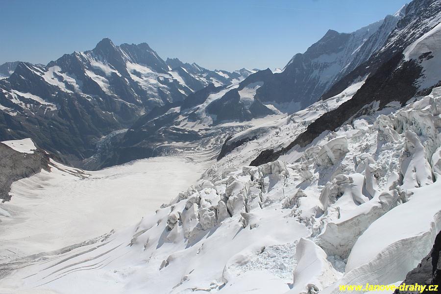 Jungfrau, ale také nejdelšího ledovce Alp - Aletschského ledovce na jedné straně