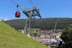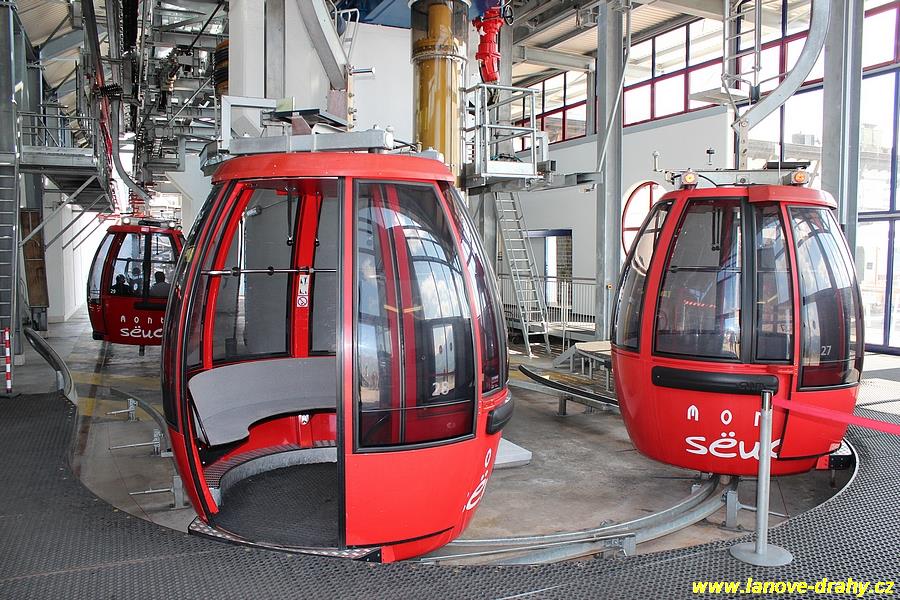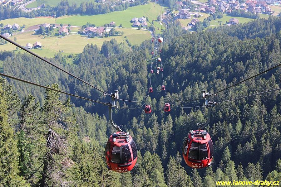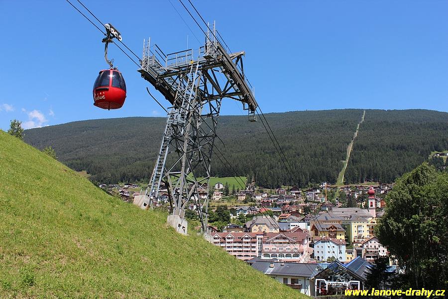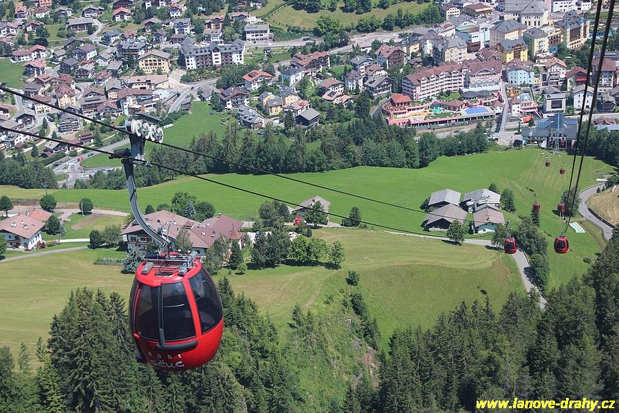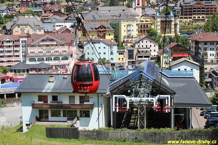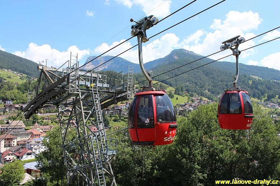 Seiser Alm, 11.7. Kyvadlová lanovka pro 50 osob vedoucí ze St. Ulrichu (Ortisei) na Seiser Alm (Alpe di Siusi), která byla postavena v roce 1935 a v letech 1953, 1969 a 1987 prošla dílčími rekonstrukcemi (což umožnilo dosáhnout konečné přepravní kapacity 550 osob za hodinu), již nemohla stačit potřebám tohoto střediska ve známém údolí Val Gardeny, čekací doby ve frontách již začaly dosahovat neúnosné délky. Po dlouhém období příprav rekonstrukce, které zabraly 6 let, se provozovatel nakonec rozhodl pro dvoulanový oběžný systém, samozřejmě v nejmodernějším provedení od firmy Leitner. Po rakouské lanovce Penkenbahn šlo o druhou moderní kabinkovou lanovku dvoulanového systému a mezi výhody tohoto systému oproti jednolanovému patří především větší odolnost proti větru, menší spotřeba energie, možnost vytvářet velká rozpětí lana bez podpěry a také naprosto klidné přejíždění kabin přes podpěry. Části obou dvou podpěry původní kyvadlové lanovky byly využity i pro novou lanovku. Před horní stanicí se nachází navíc i lanový přechod, protože horní části trasy dosahuje sklonu až 70 %. Celkem 35 patnáctimístných kabinek typu Conus od firmy CWA zajišťuje přepravní kapacitu lanovky 2400 osob/hod, v letním období je jich na trati samozřejmě méně. Poprvé byly na této lanovce použity nově vyvinuté spínací aparáty vycházející z osvědčených jednolanových systémů, svěrná síla čelistí je vyvíjena prostřednictvím dvojice klasických vinutých pružin. Pod novou dolní stanicí, která musela být kvůli napínacímu systému založena až do hloubky 9,75 m, vznikla i nová podzemní tříposchoďová garáž s kapacitou 240 vozidel, což vyřešilo problémy s parkováním. (Radim Polcer) |