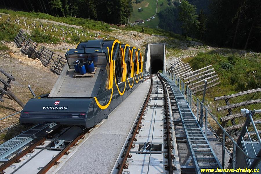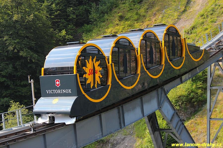 byla uvedena do provozu v posle dní době, je bezesporu nová pozemní lanovka na Stoos v kantonu Schwyz. Horská osada Stoos se 150 stálými obyvateli zpřístupněná
