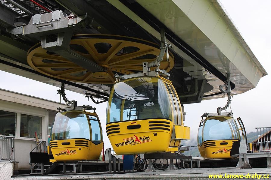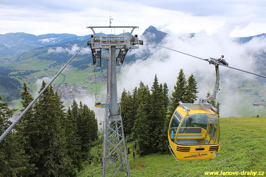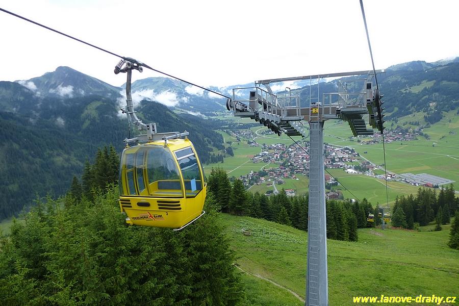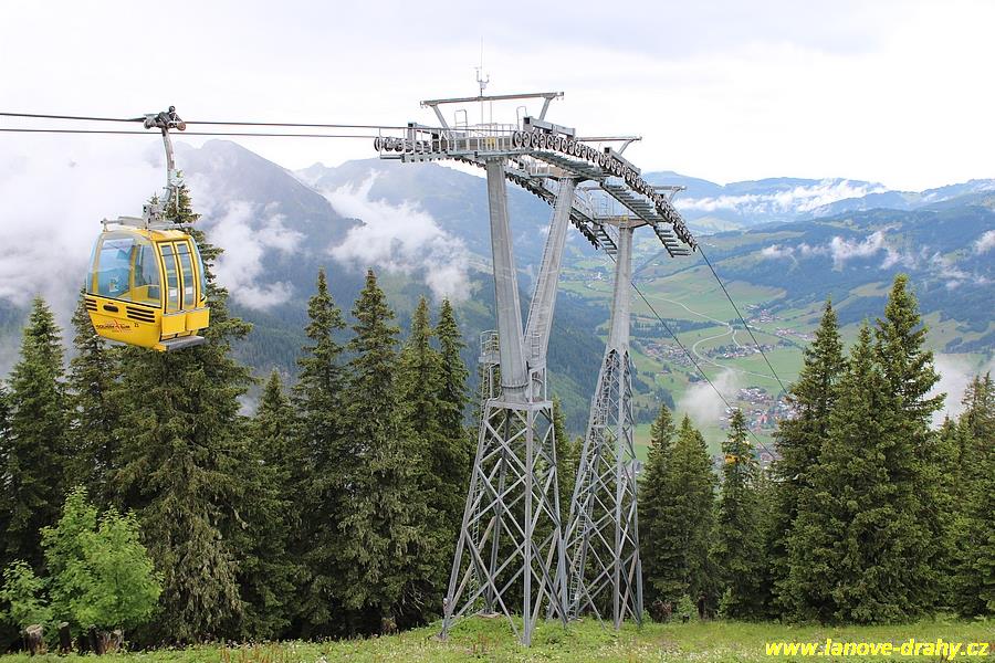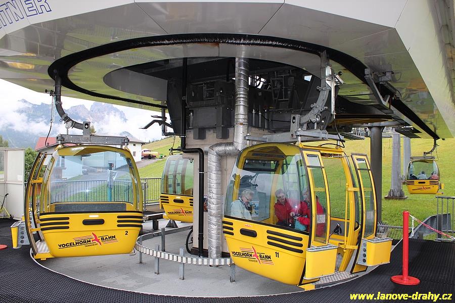 Leitner v trase vedoucí odspodu až nahoru. Zajímavostí je použití kabin od firmy