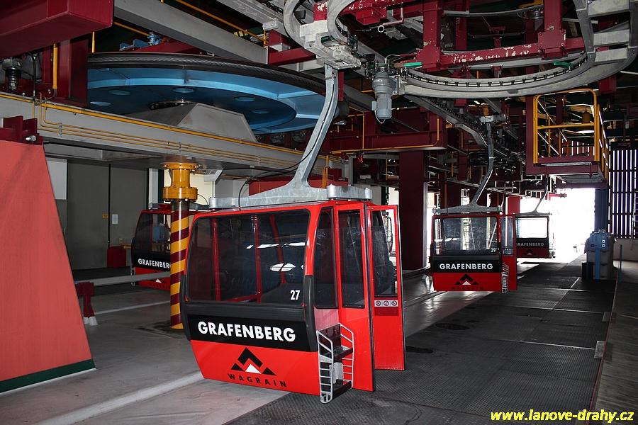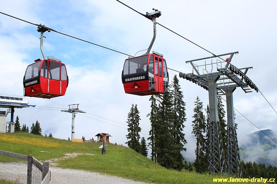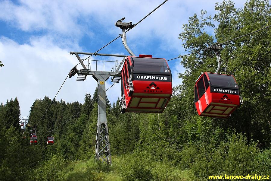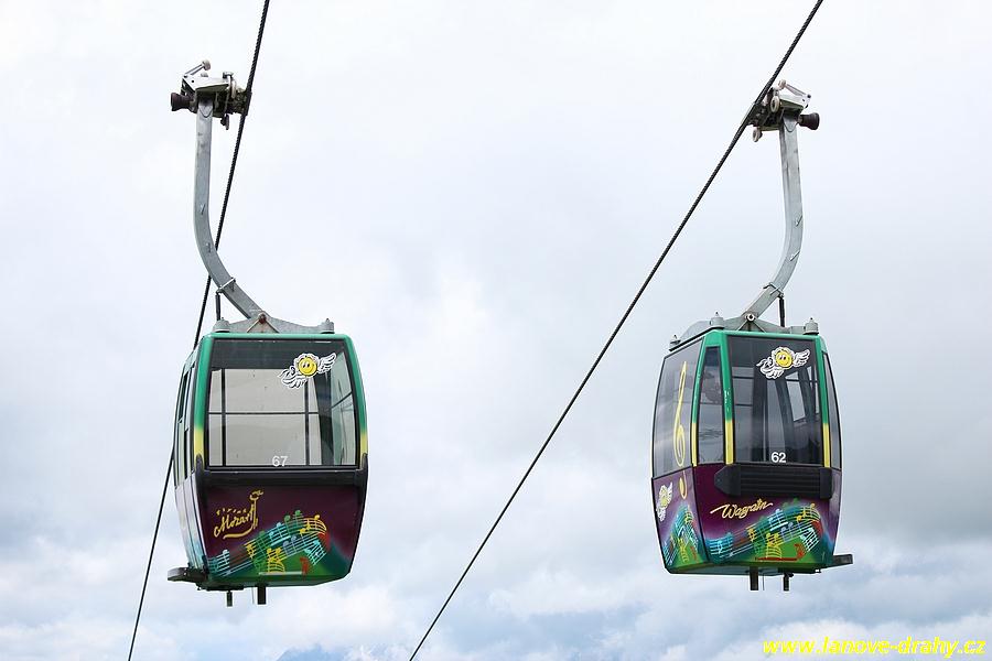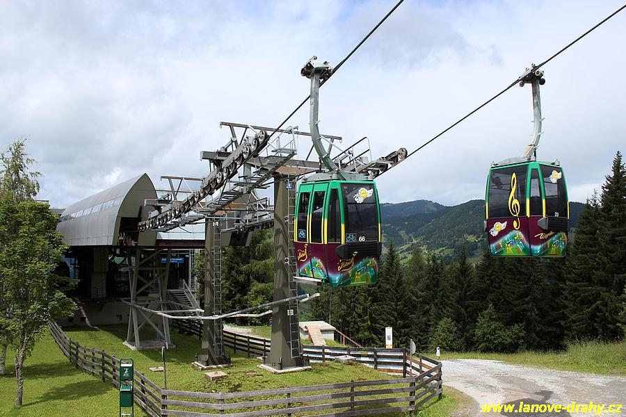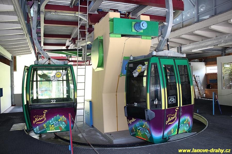 v létě turisty dvoúseková 10-místná kabinková lanovka Doppelmayr s průběžným