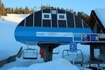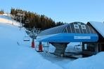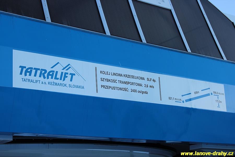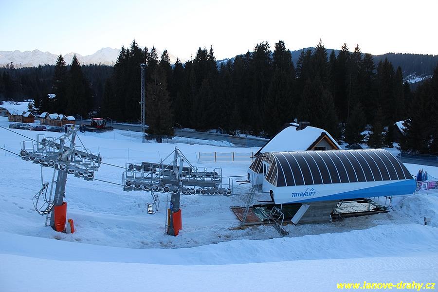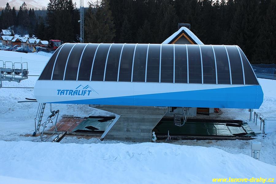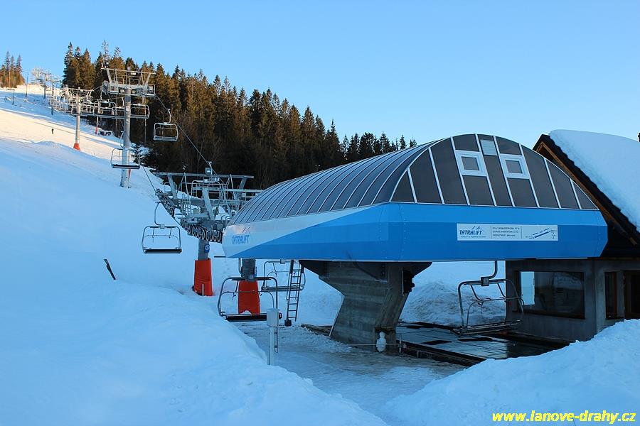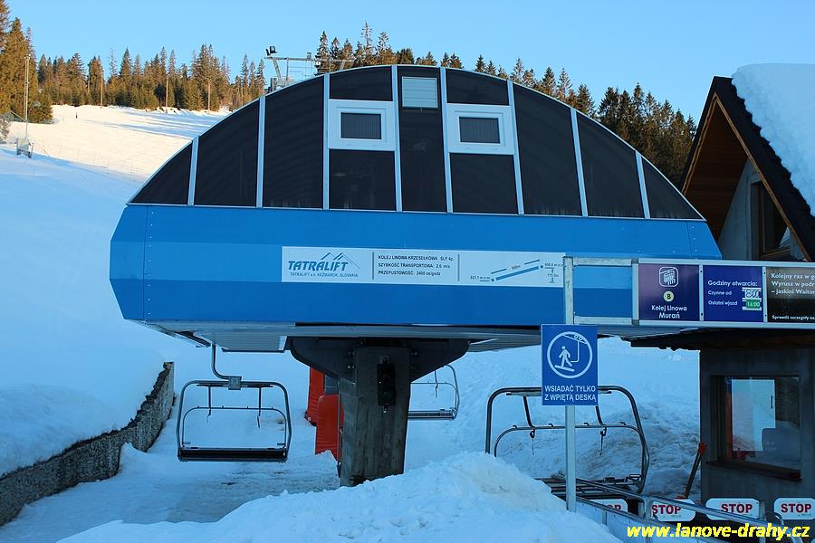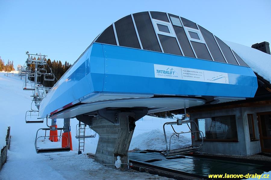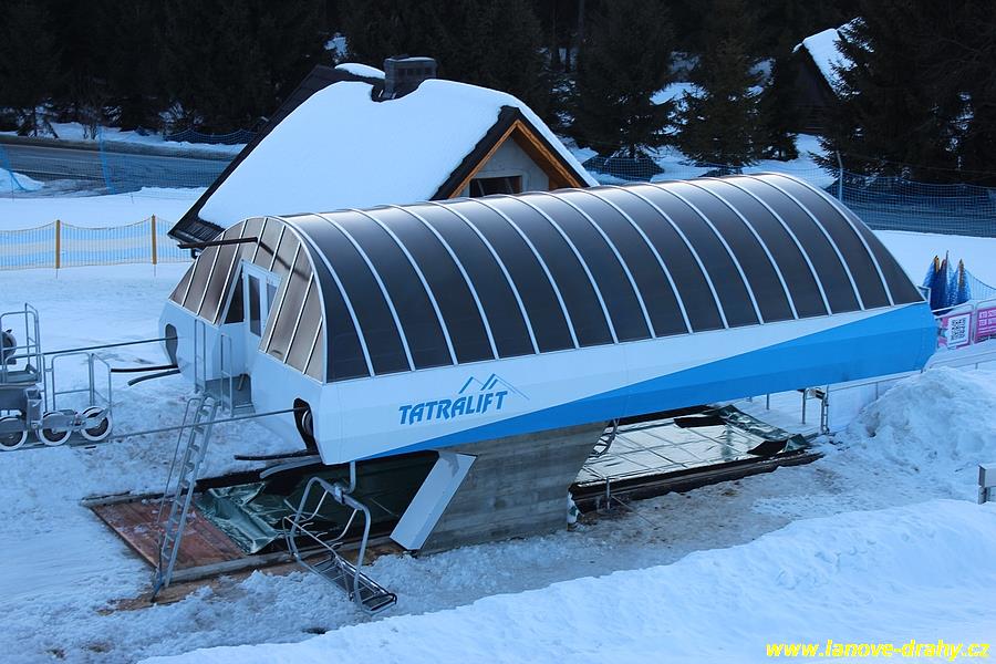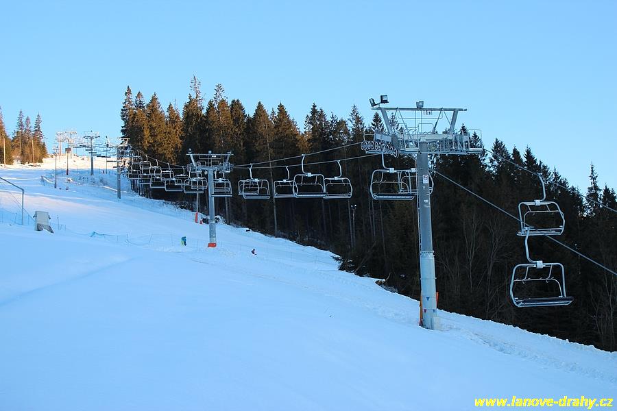 osobní visutá jednolanová dráha oběžného systému s pevným uchycením čtyřmístných sedaček a rozběhovým pásem |