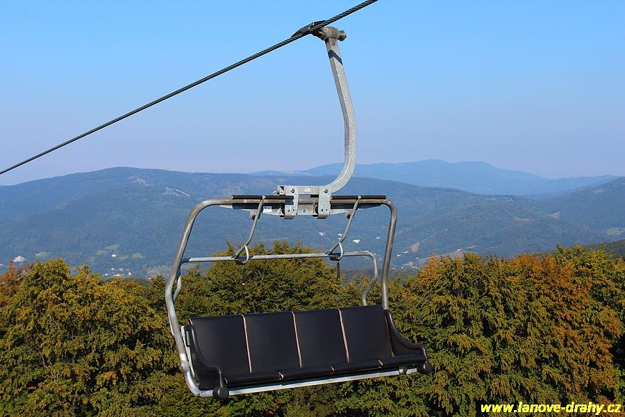 osobní visutá jednolanová dráha oběžného systému s pevným uchycením čtyřmístných sedaček a rozběhovým pásem |