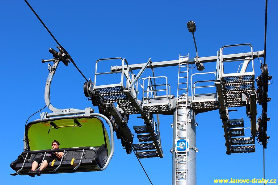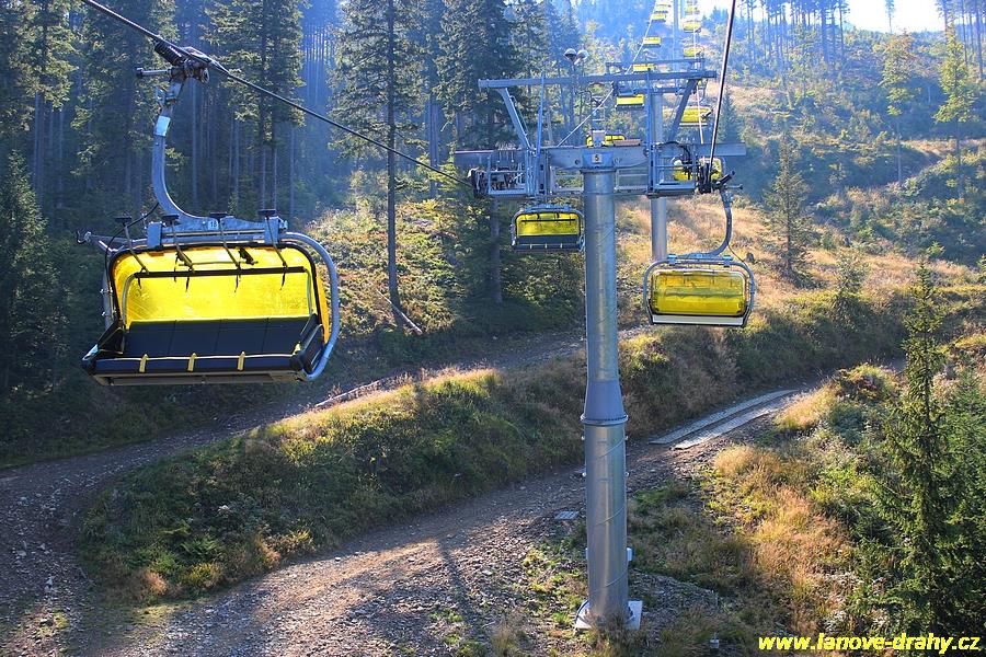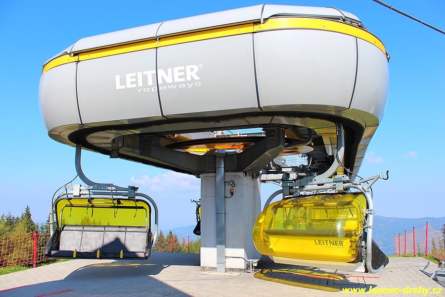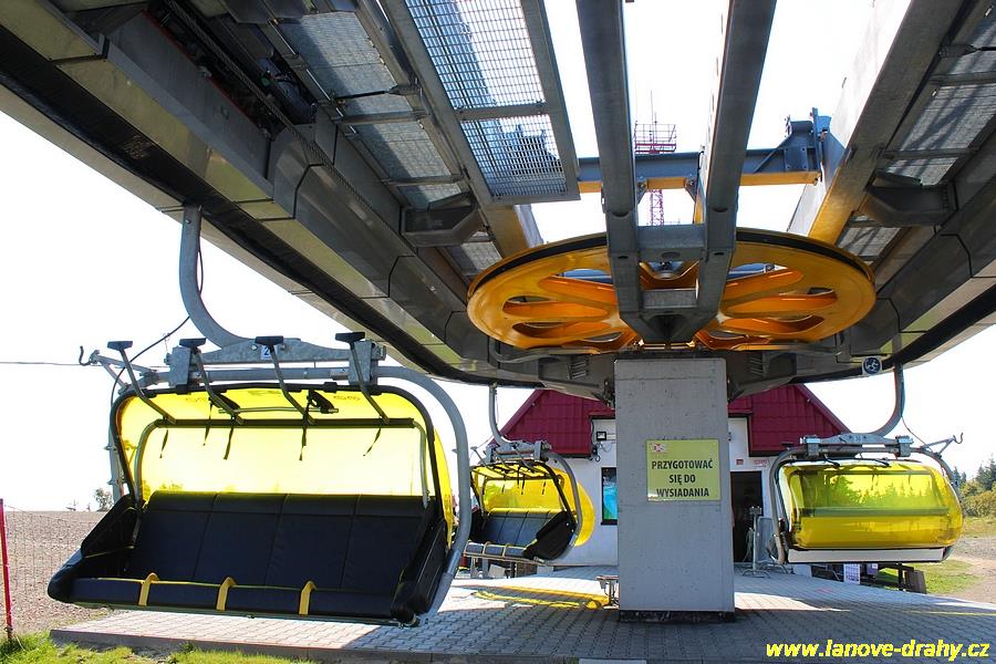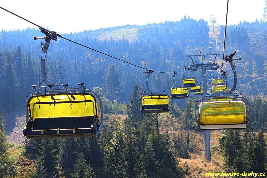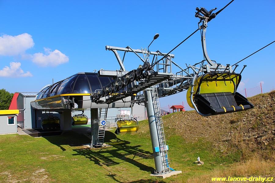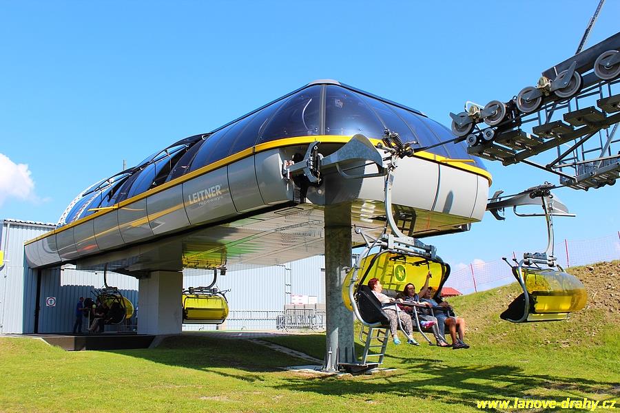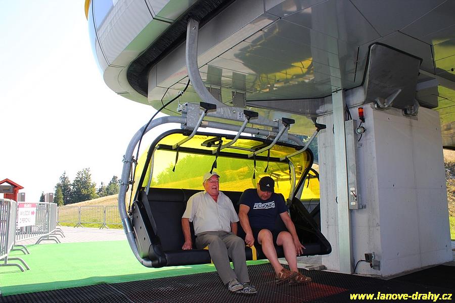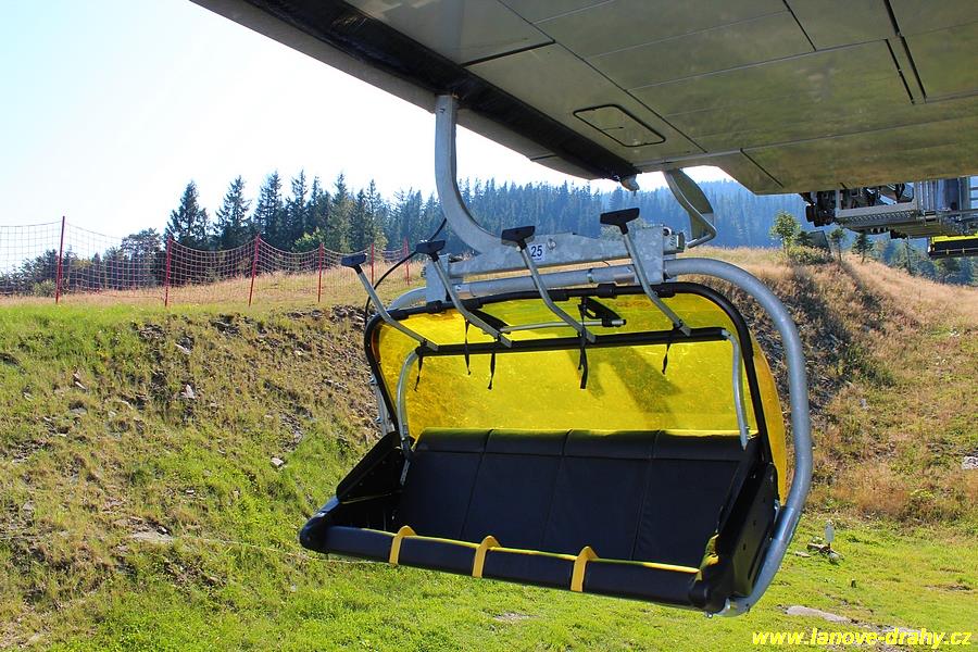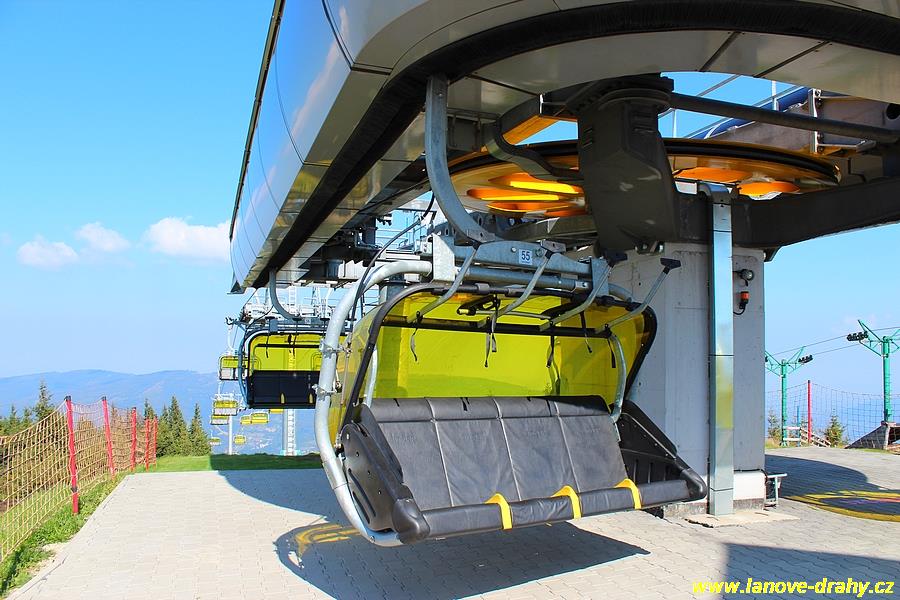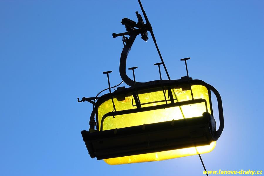 čtyřmístných sedaček se žlutými bublinami, s nástupním pásem