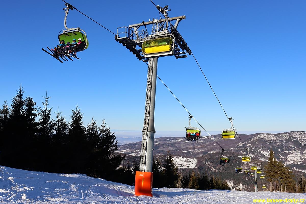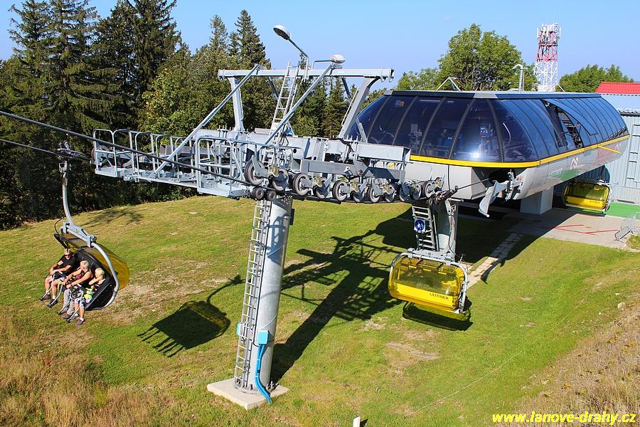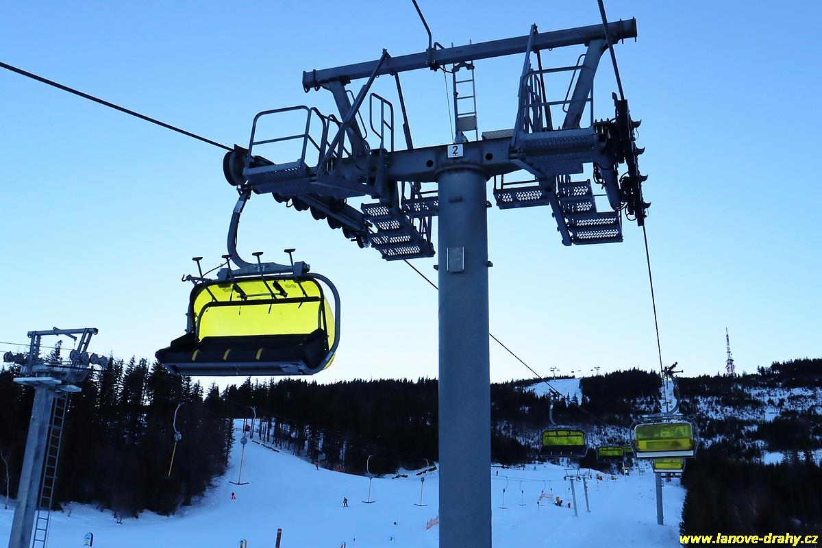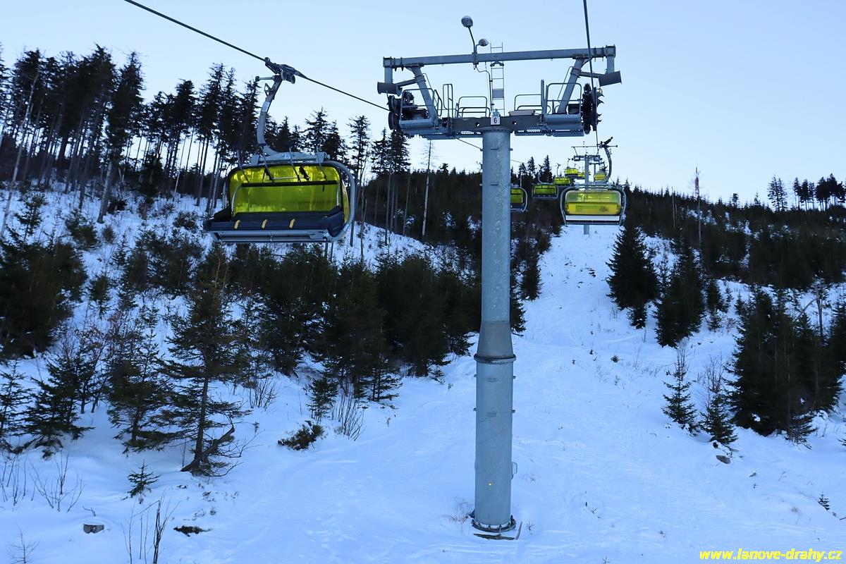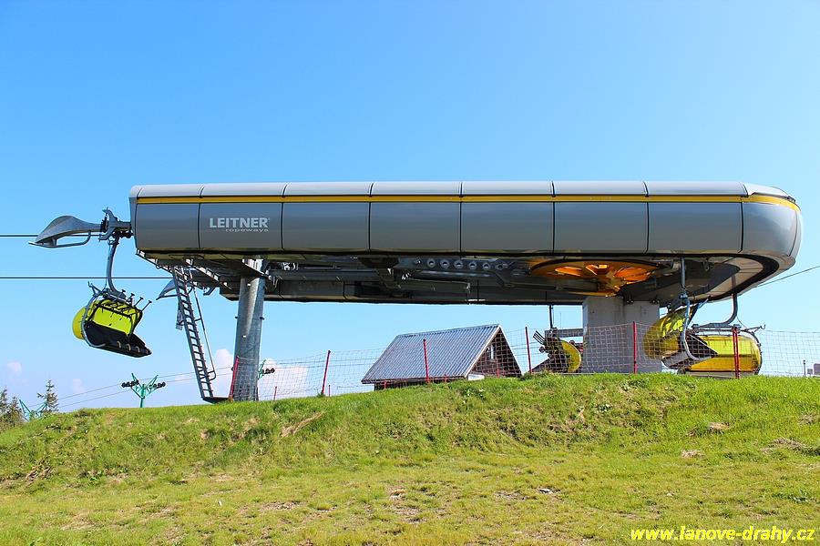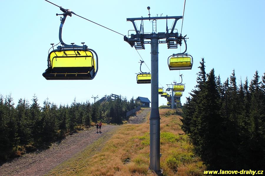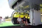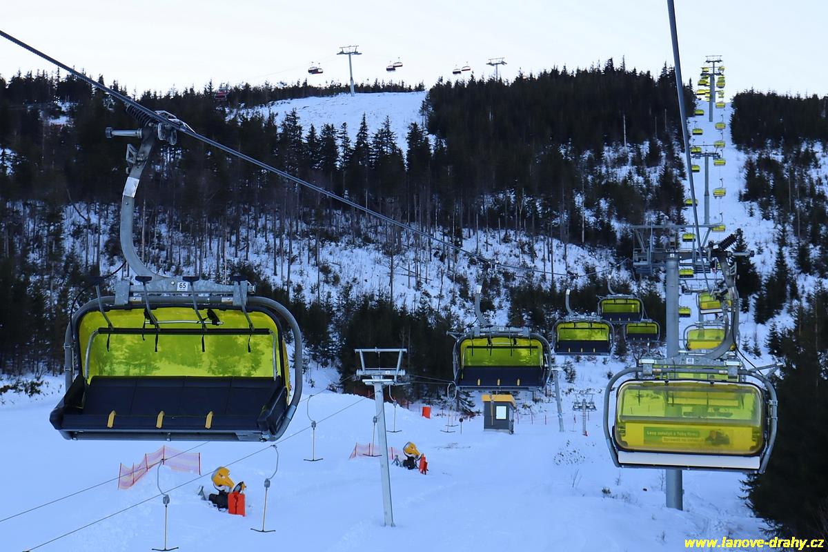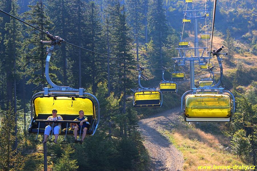 čtyřmístných sedaček se žlutými bublinami, s nástupním pásem