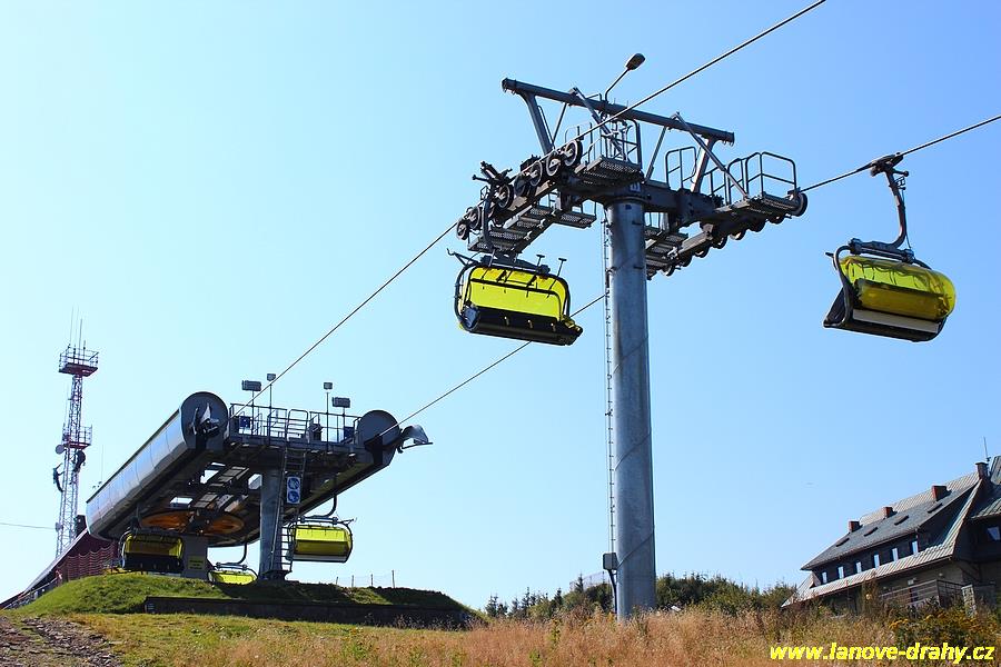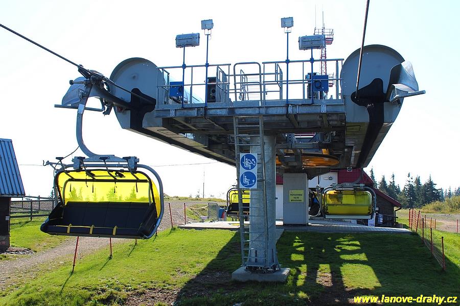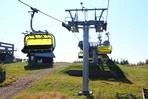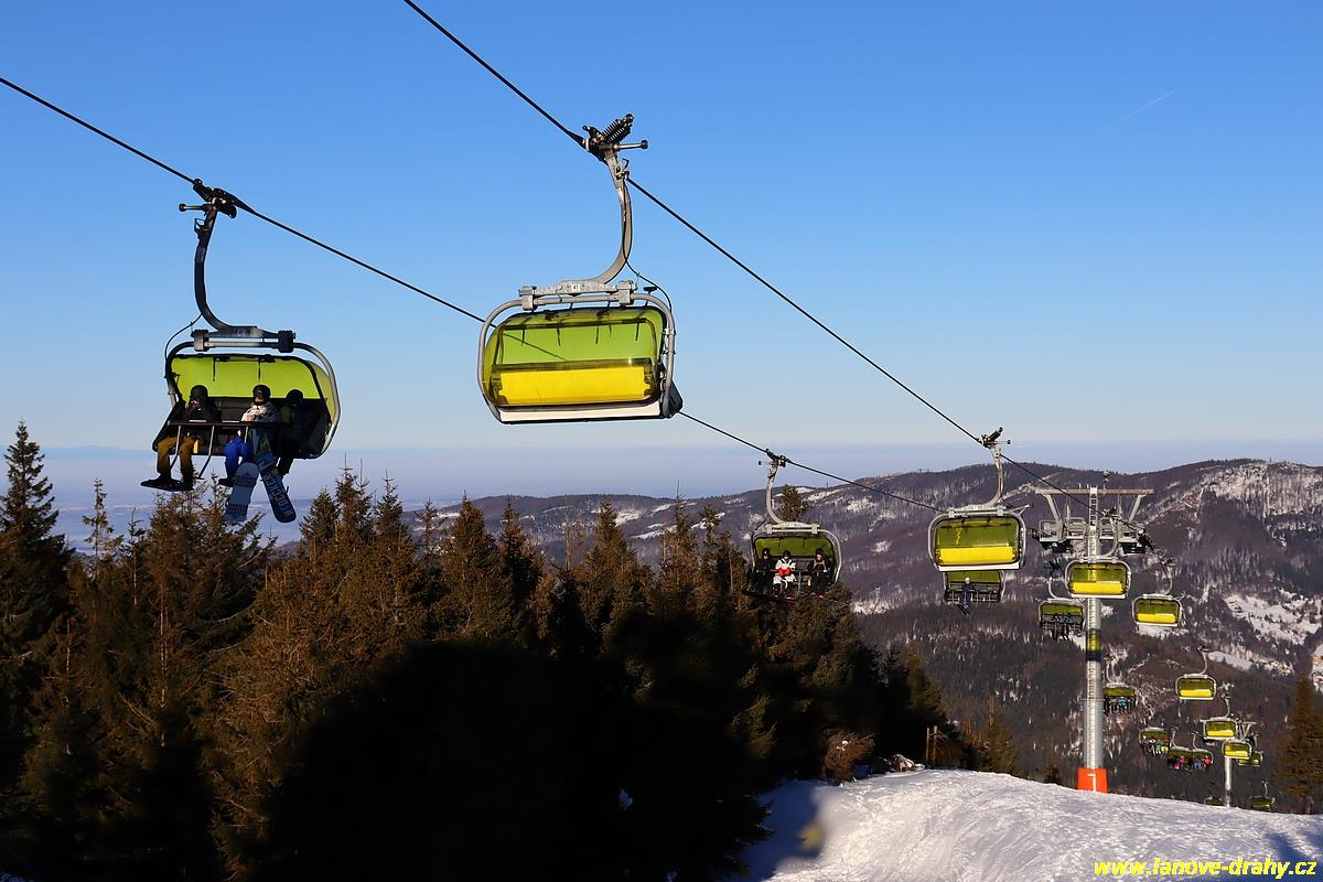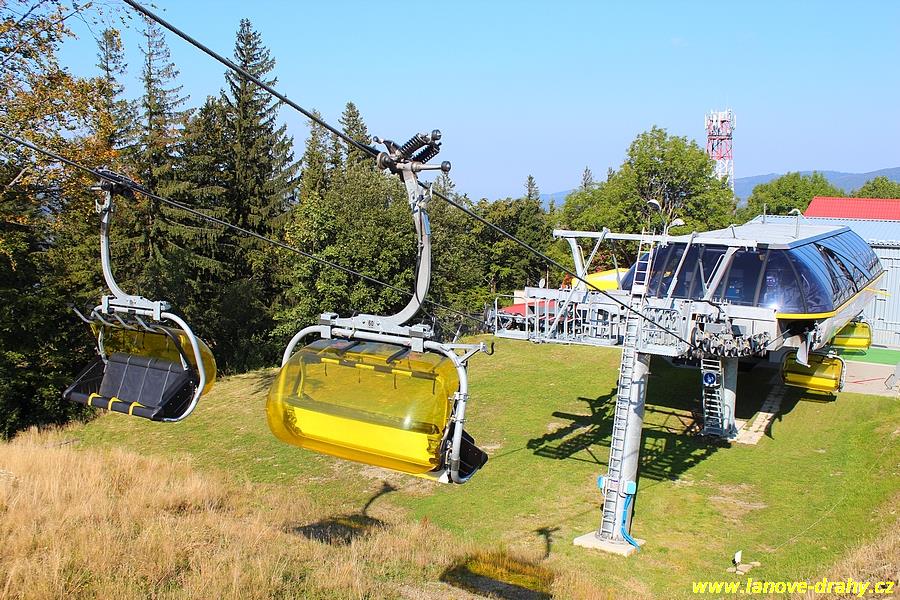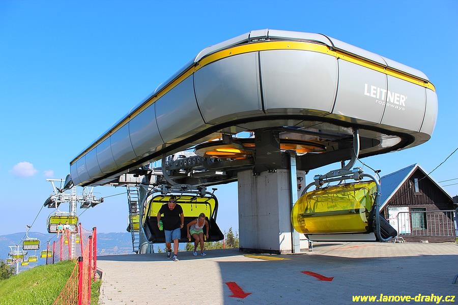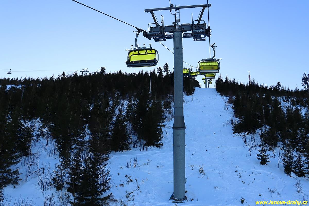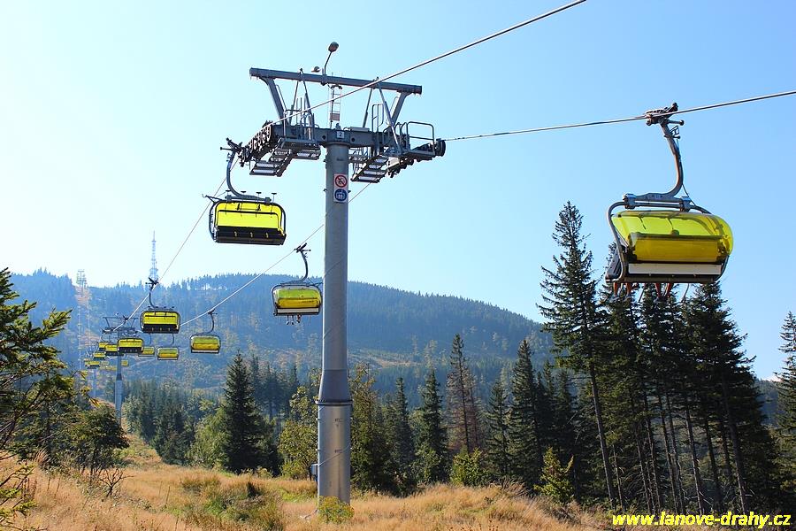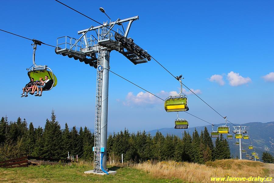 čtyřmístných sedaček se žlutými bublinami, s nástupním pásem
