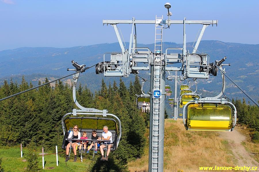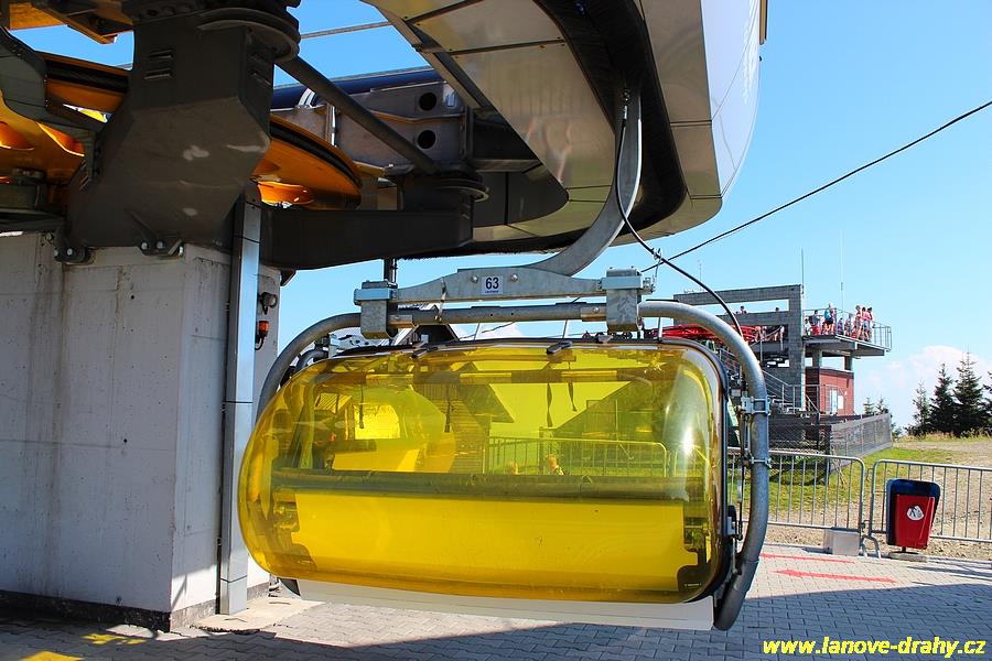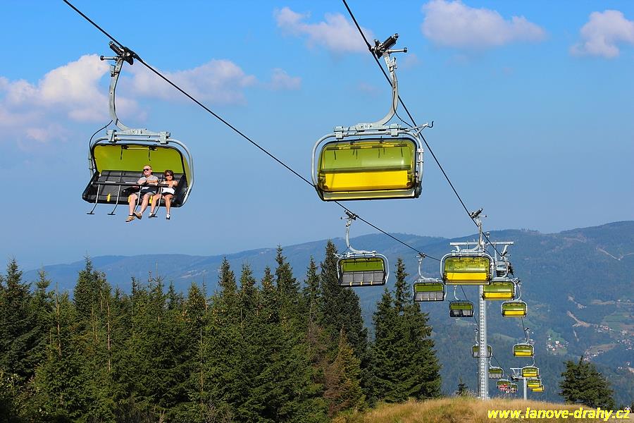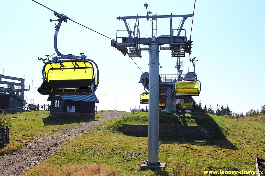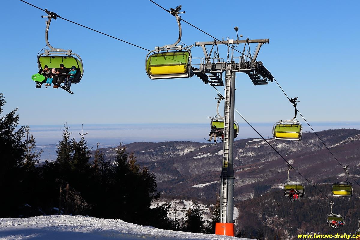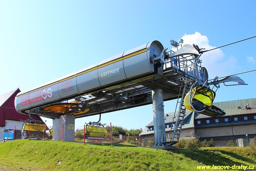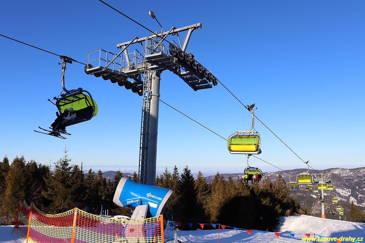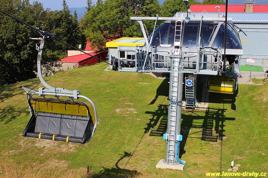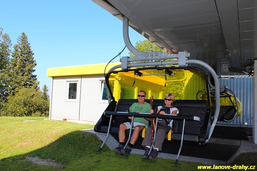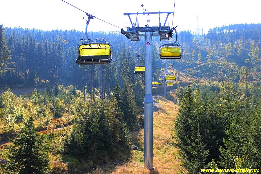 čtyřmístných sedaček se žlutými bublinami, s nástupním pásem