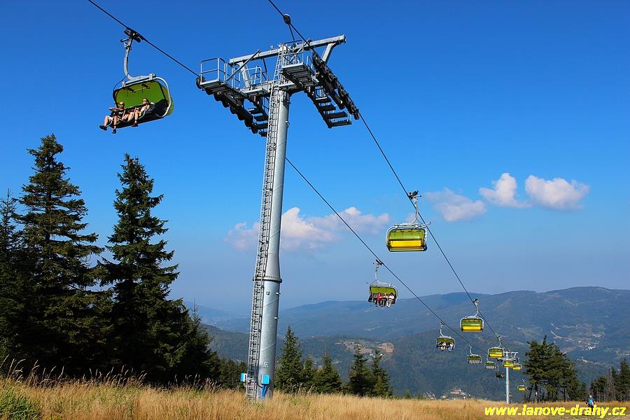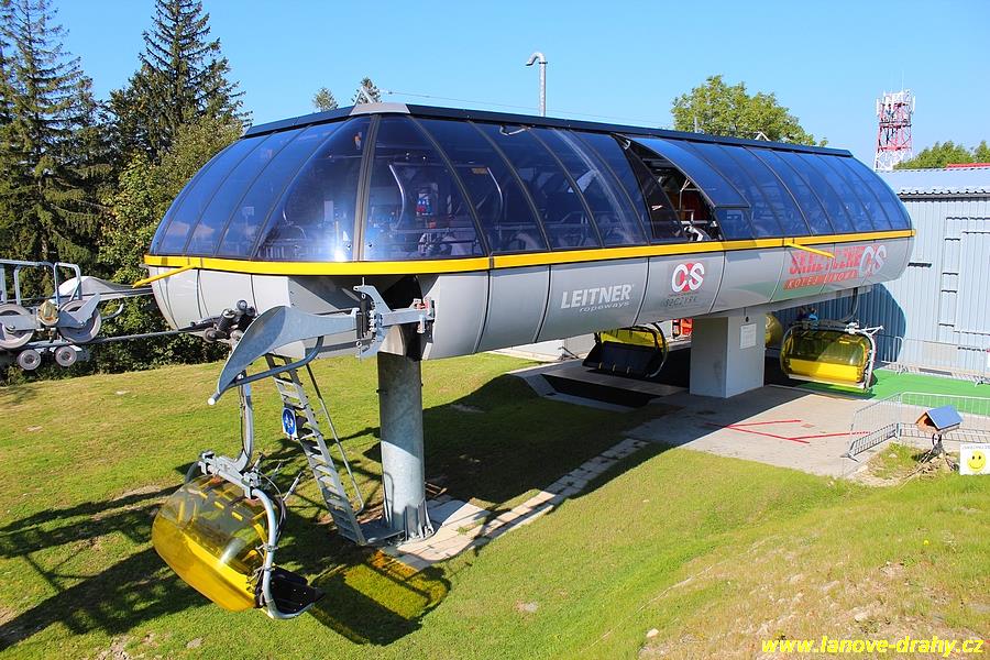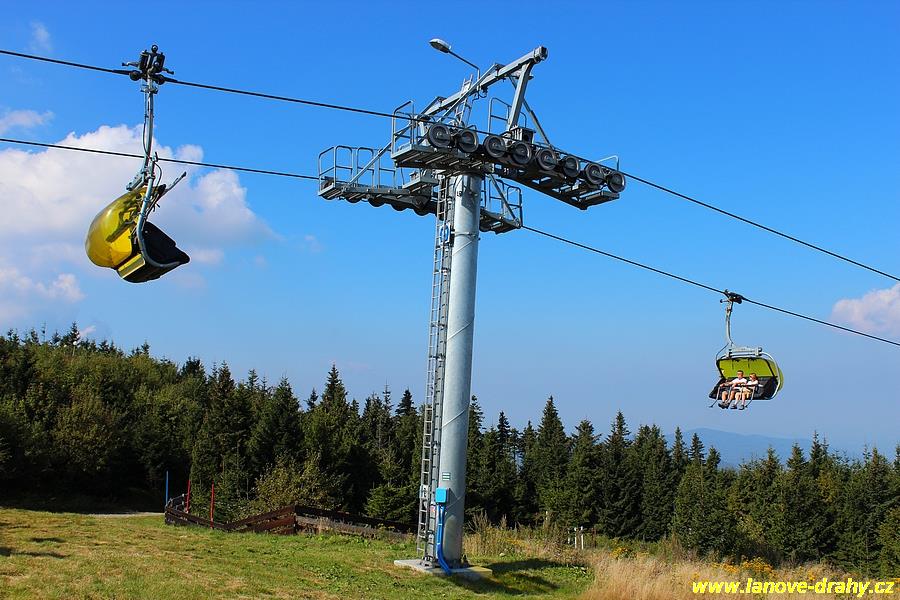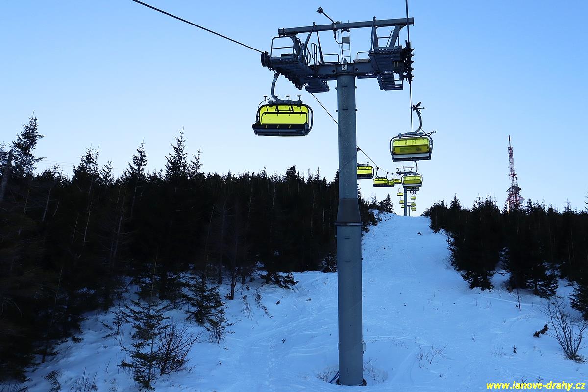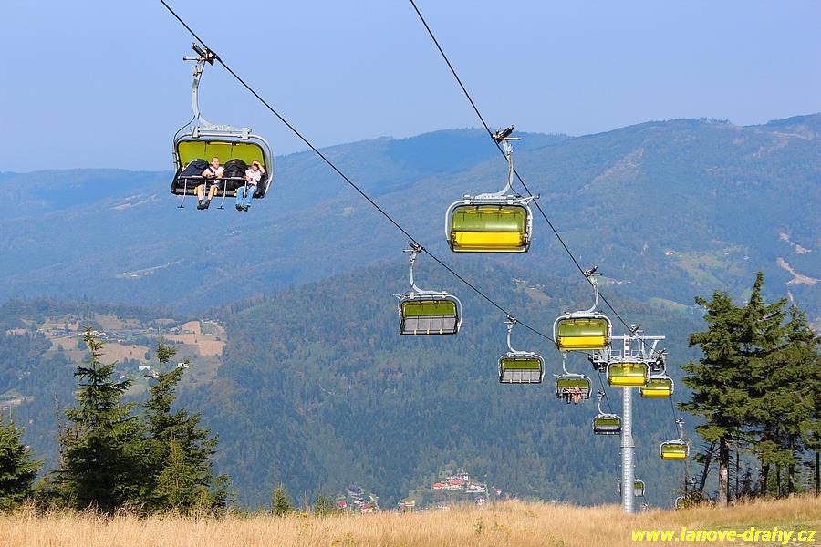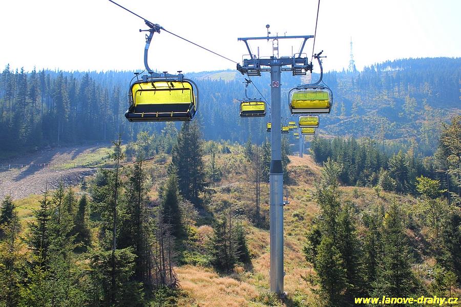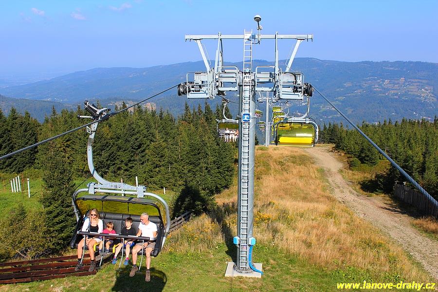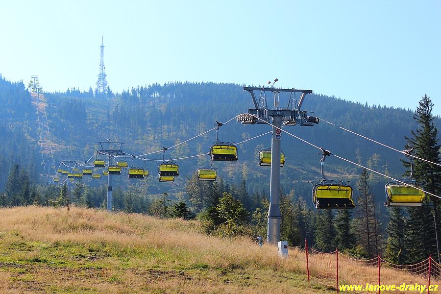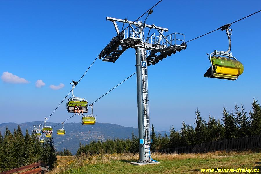 čtyřmístných sedaček se žlutými bublinami, s nástupním pásem
