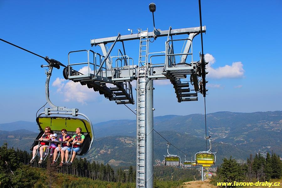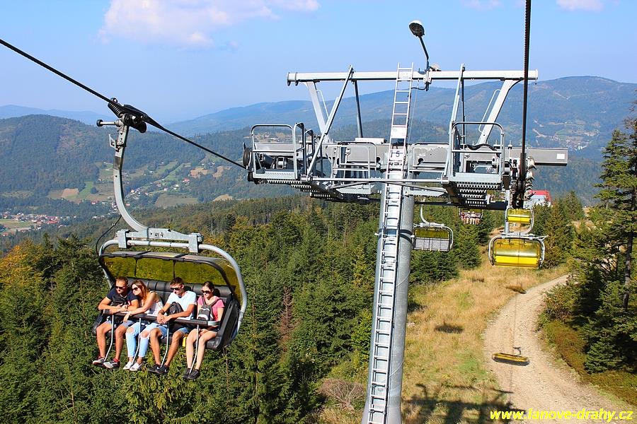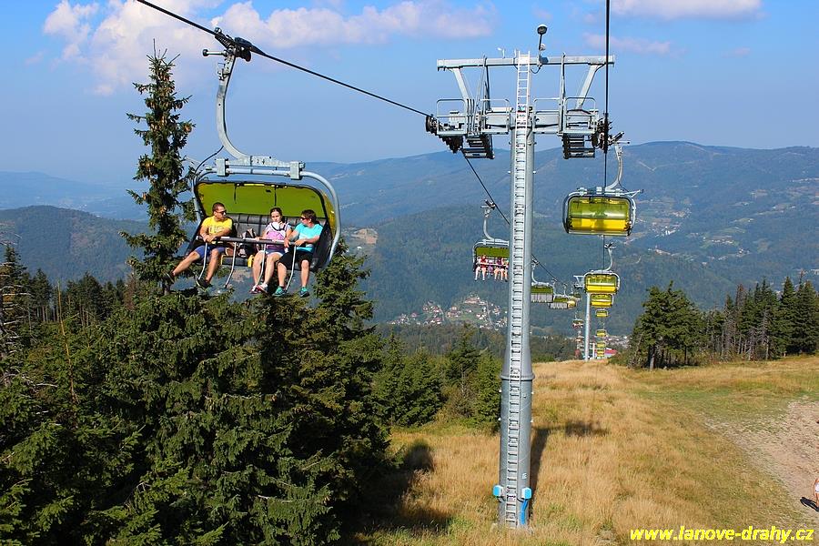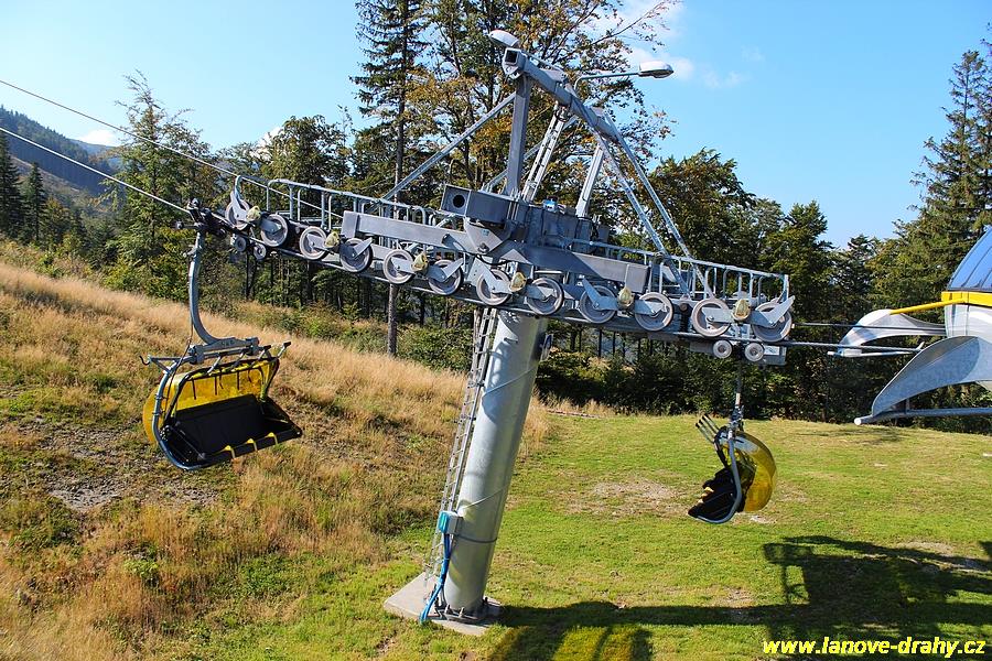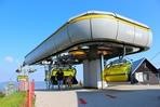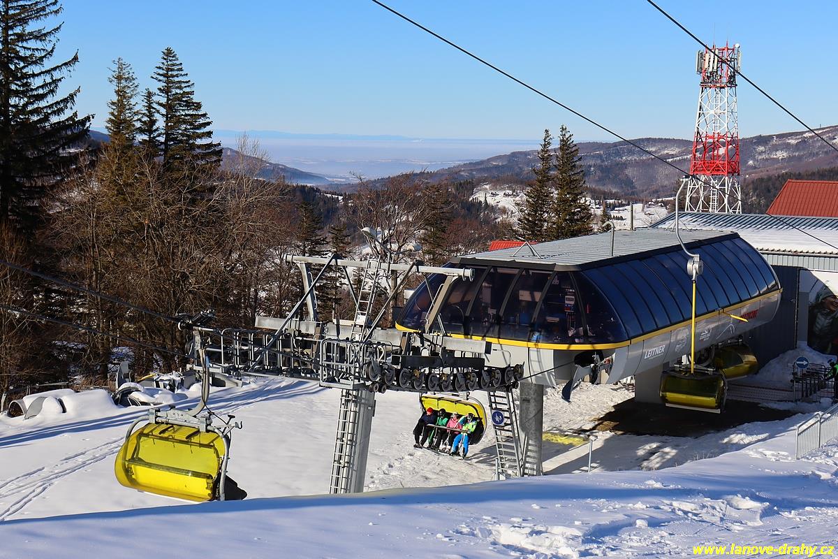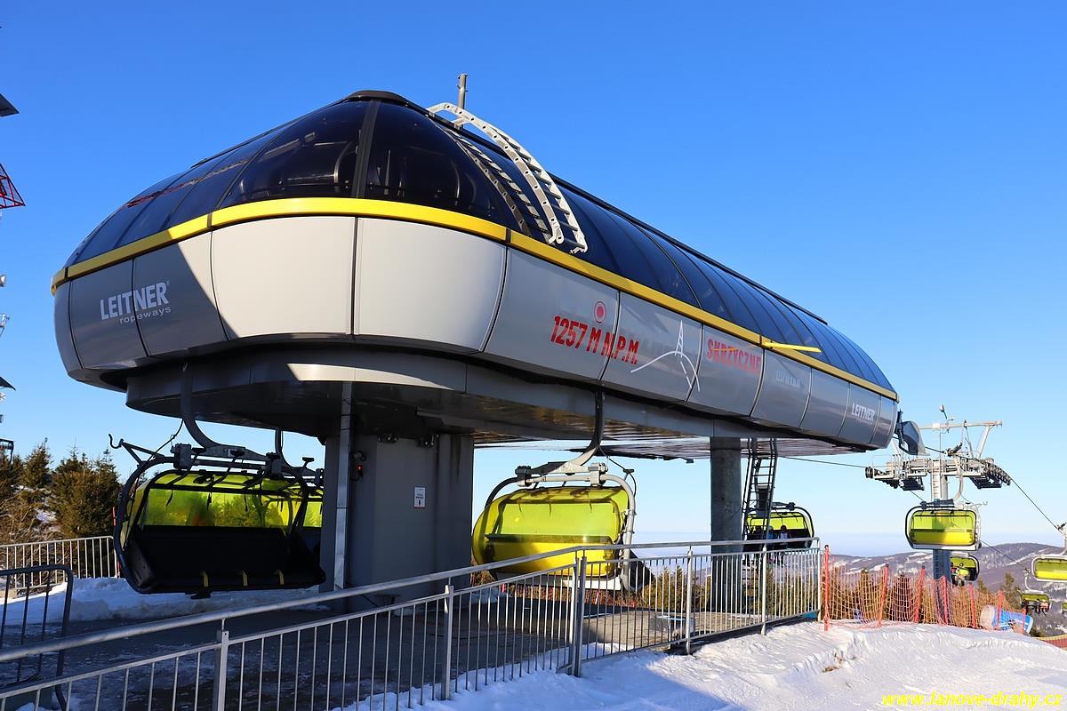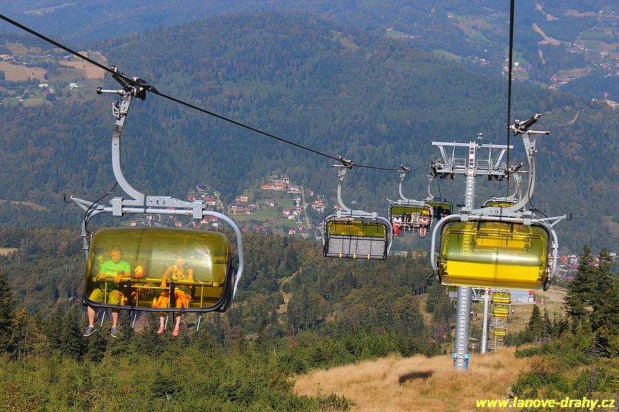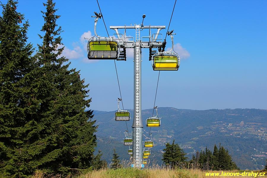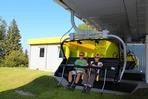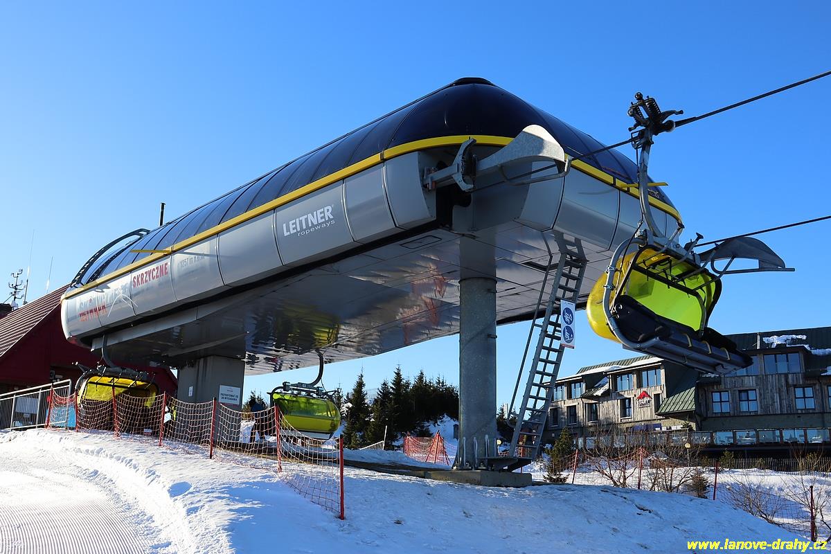čtyřmístných sedaček se žlutými bublinami, s nástupním pásem