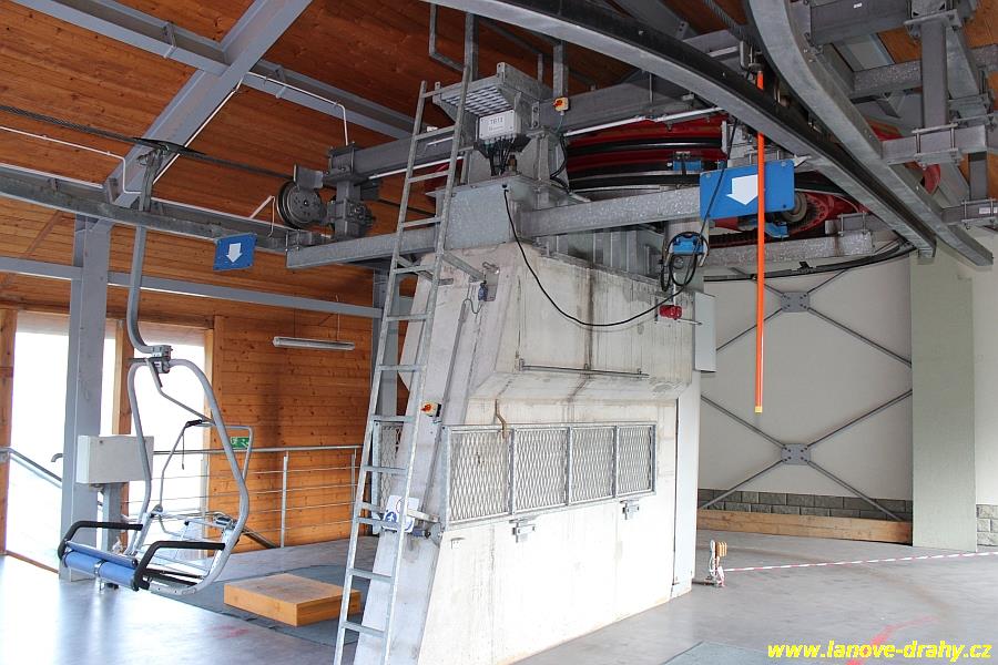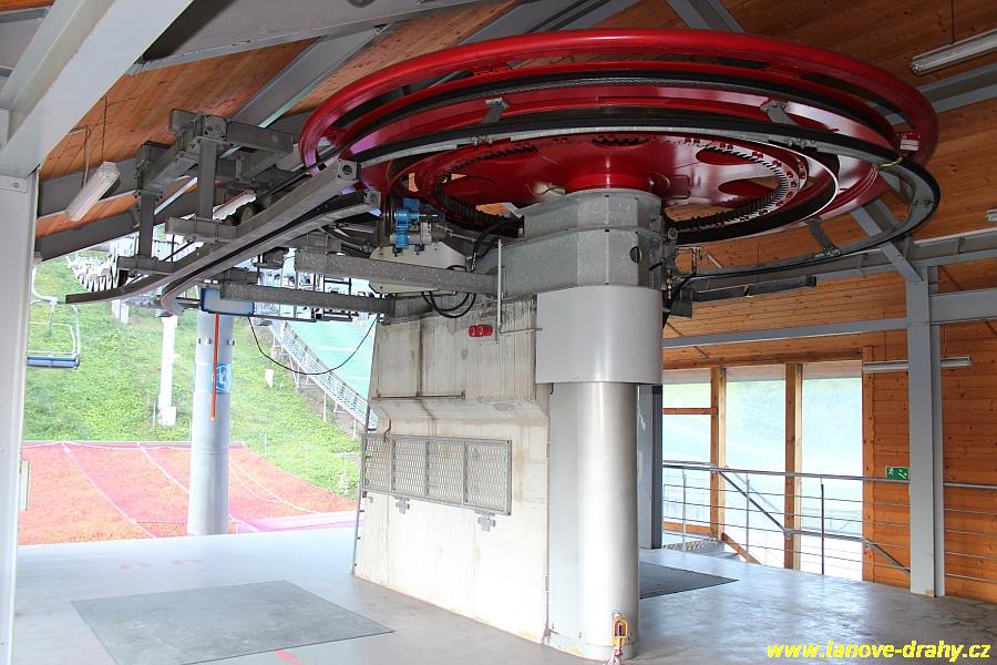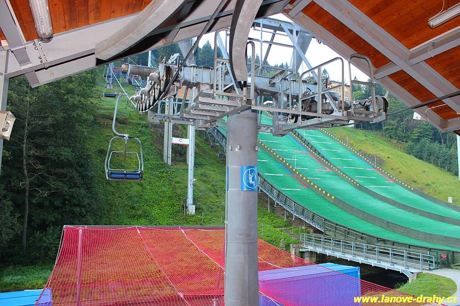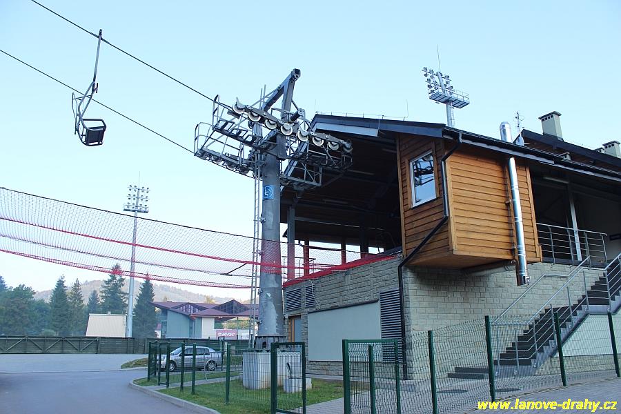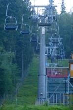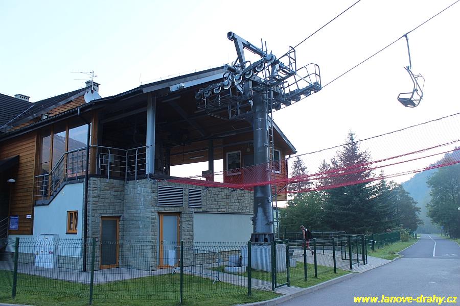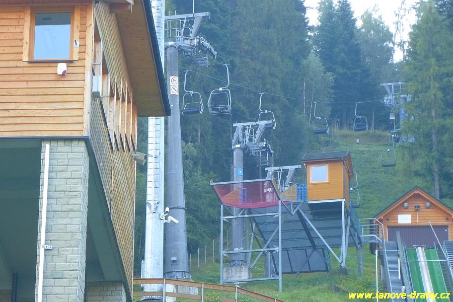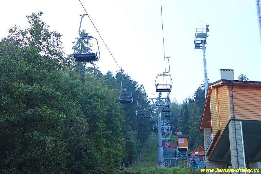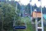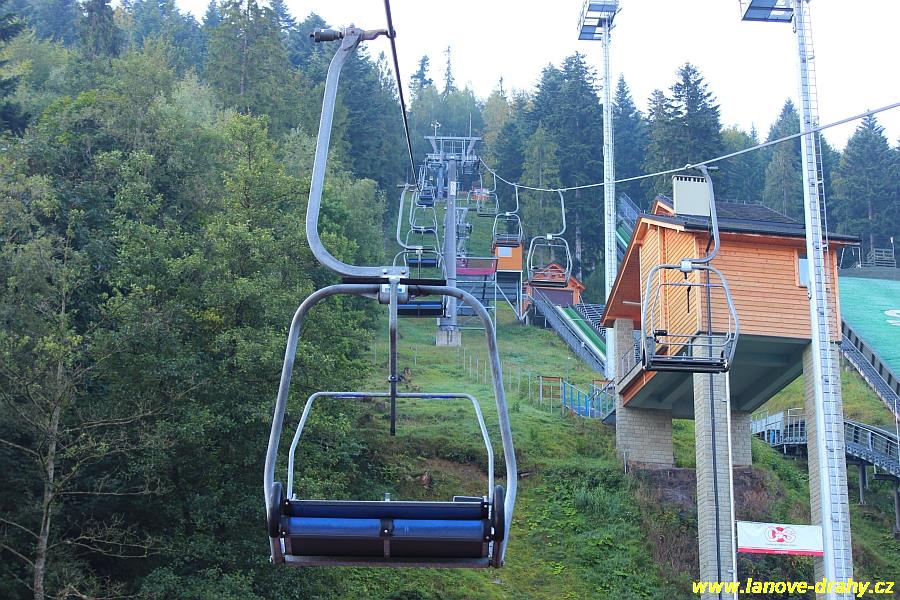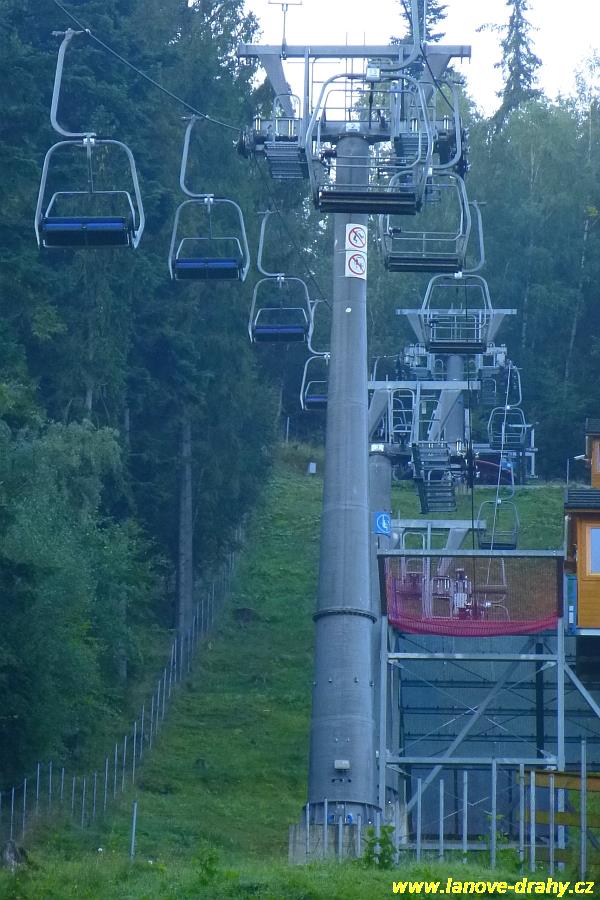 osobní visutá jednolanová dráha oběžného systému s pevným uchycením dvoumístných sedaček |