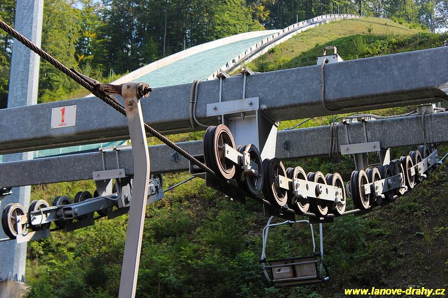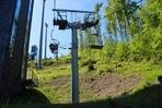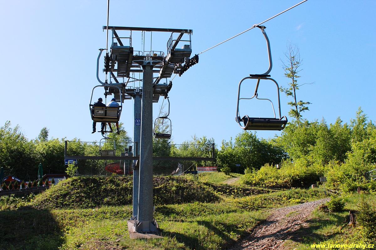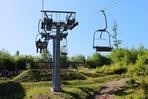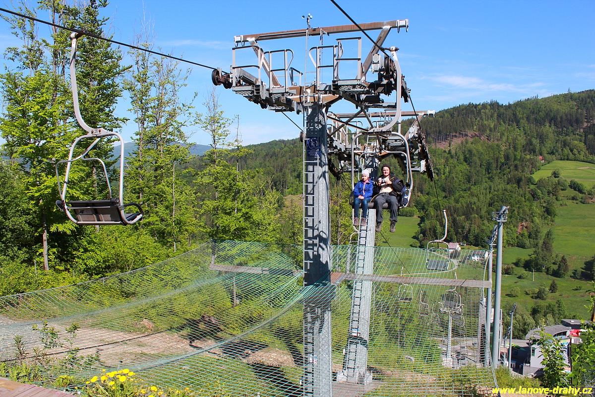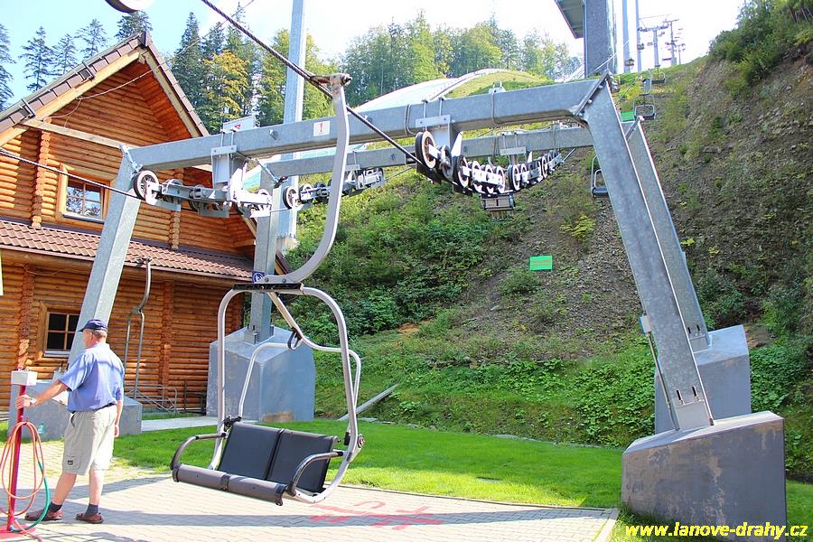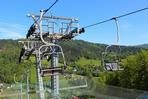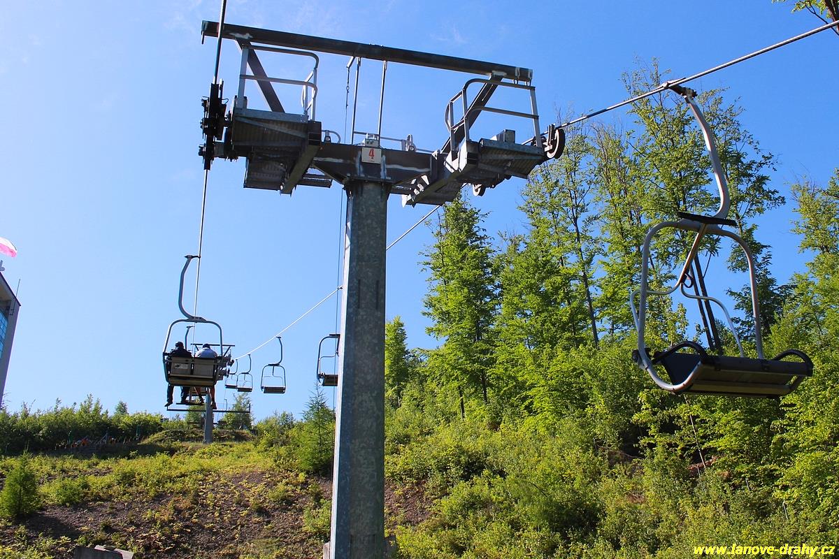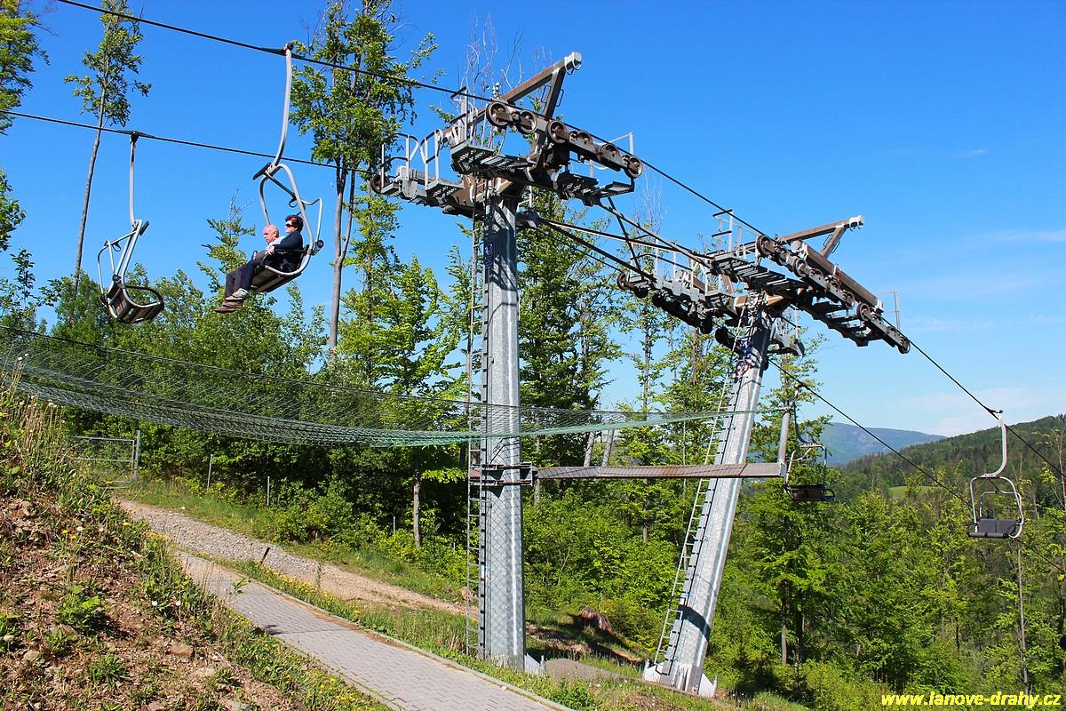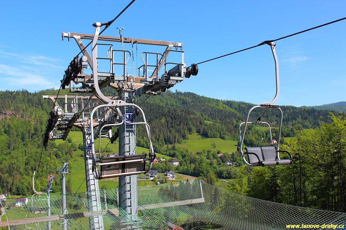 osobní visutá jednolanová dráha oběžného systému s pevným uchycením dvoumístných sedaček |