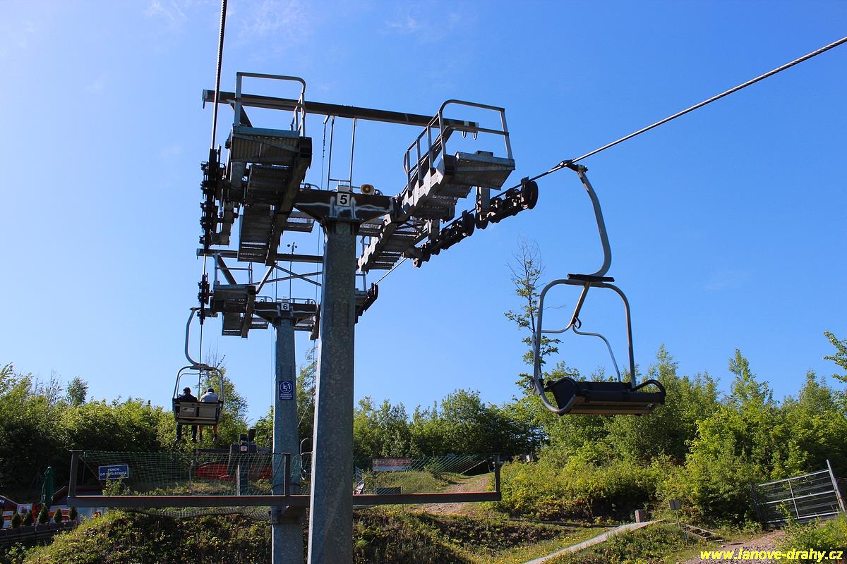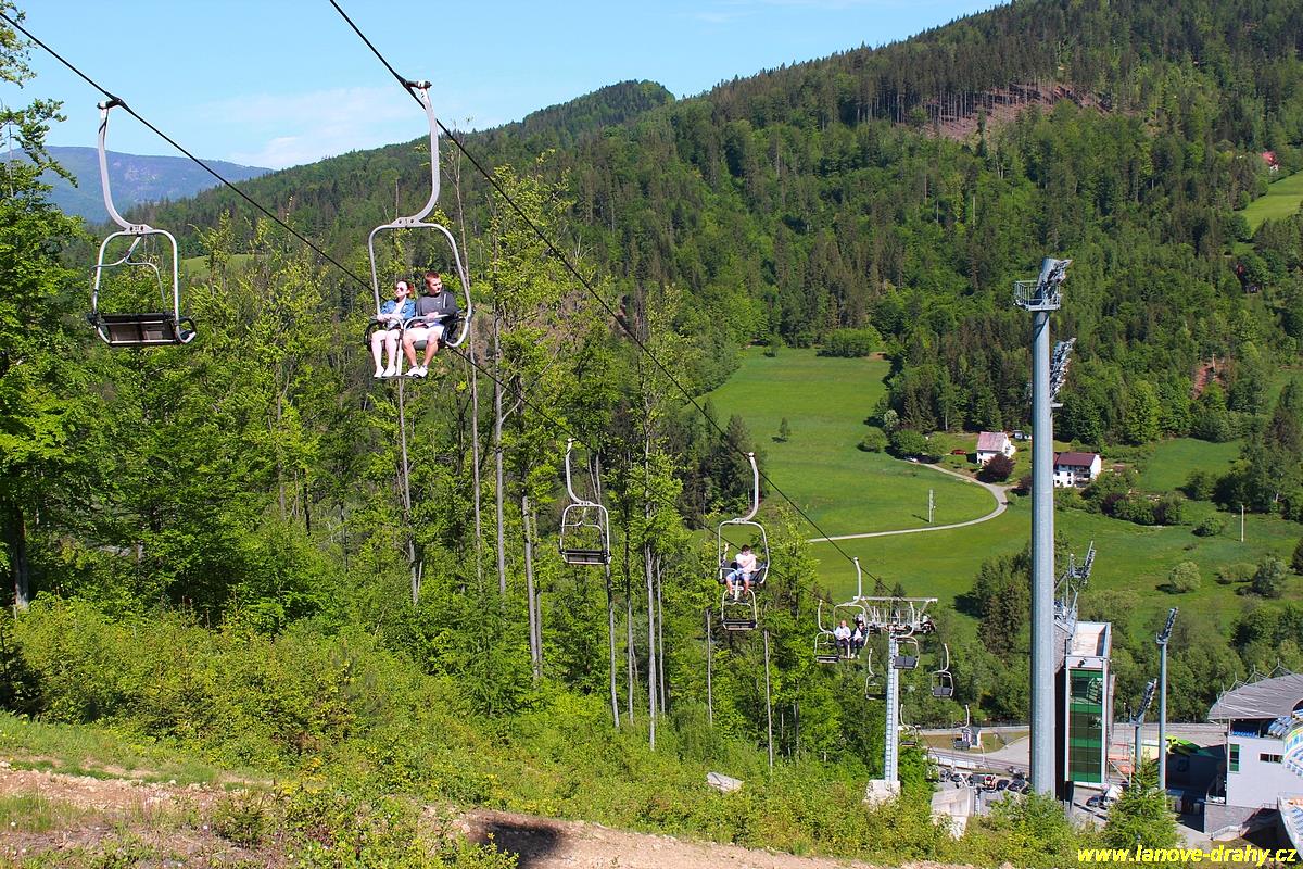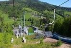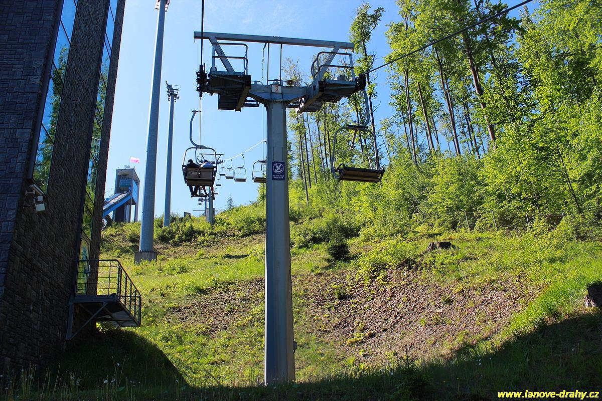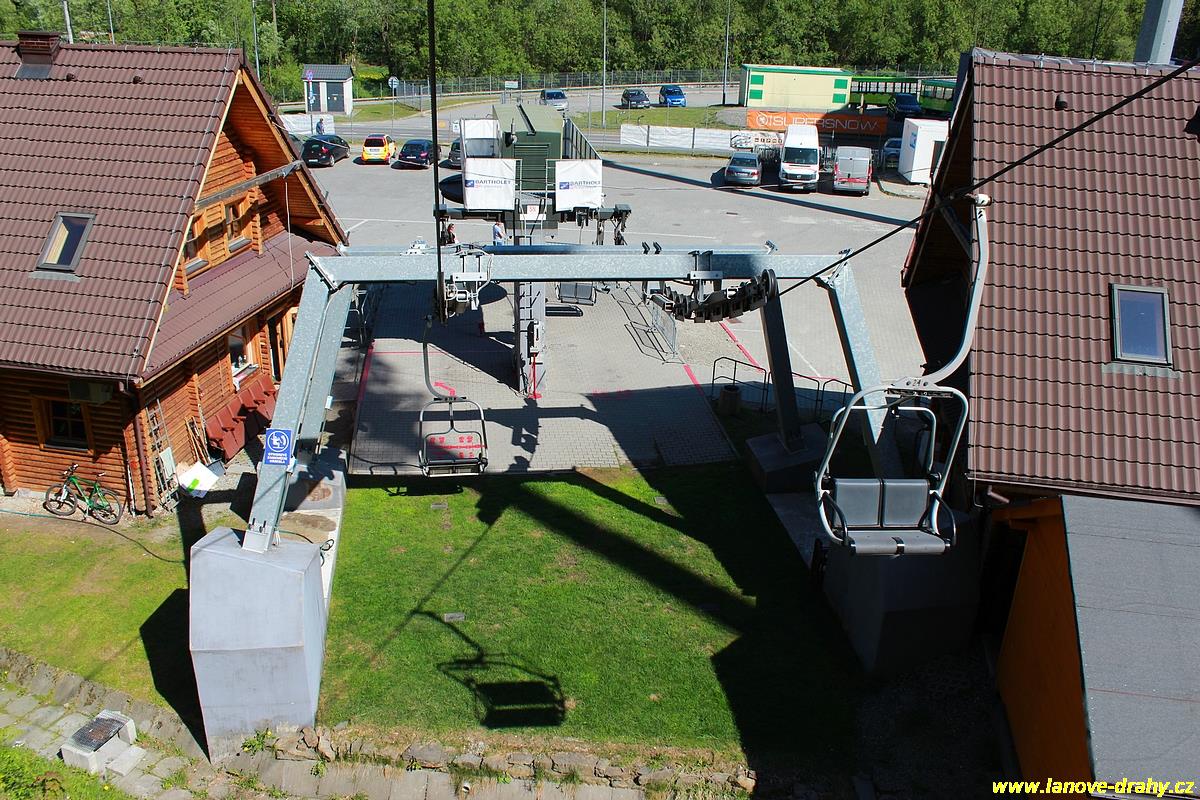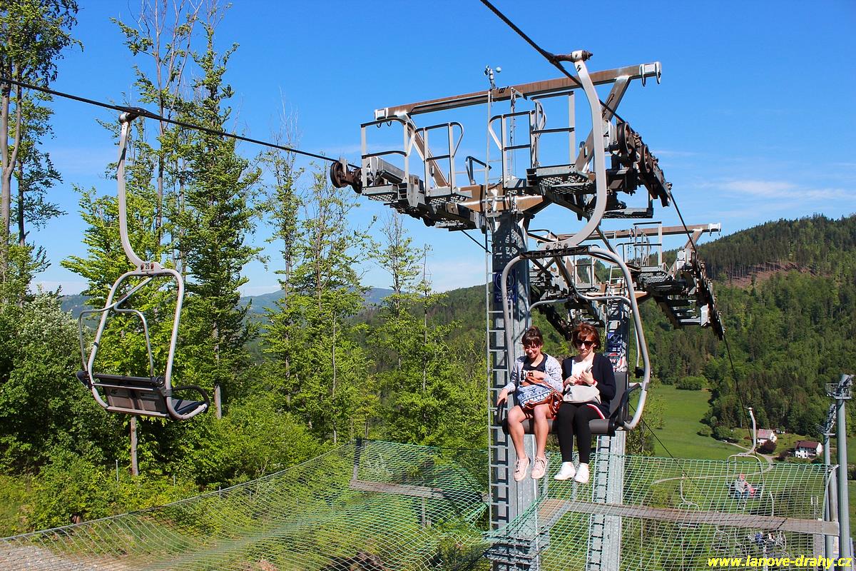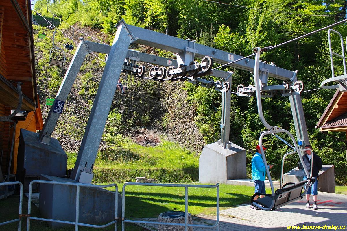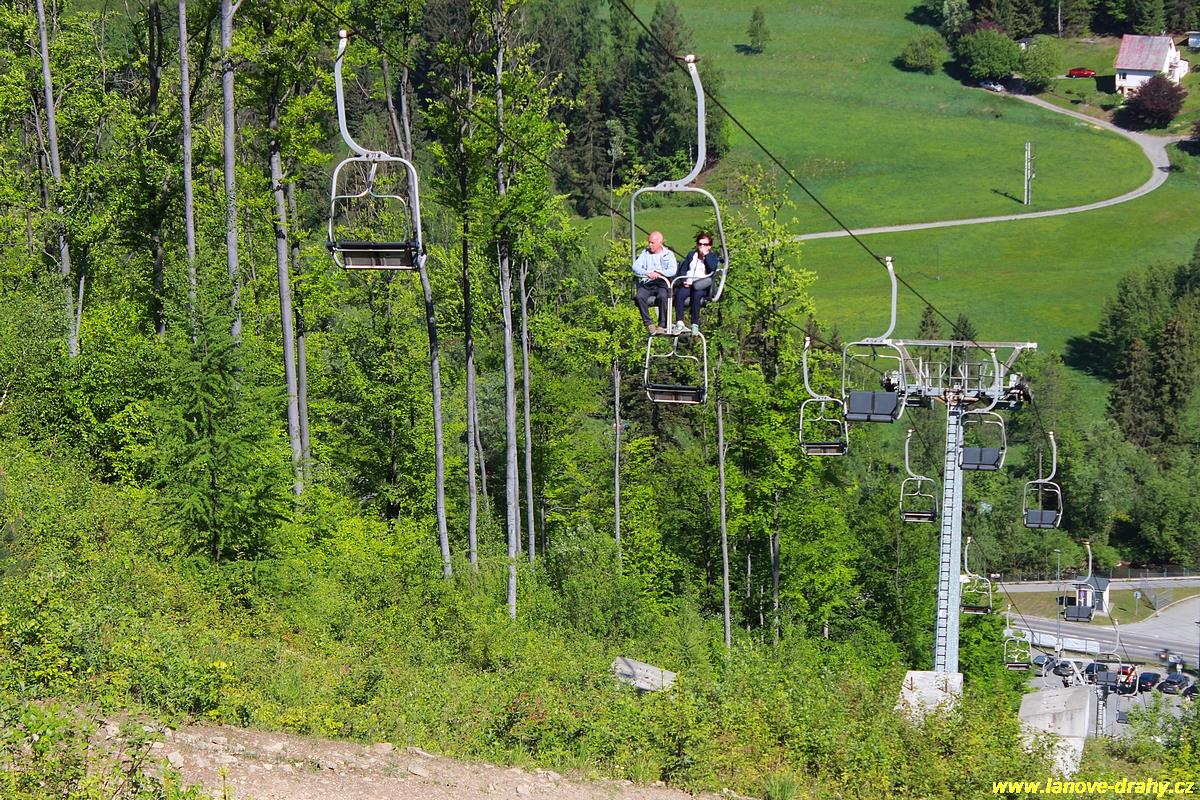 osobní visutá jednolanová dráha oběžného systému s pevným uchycením dvoumístných sedaček |