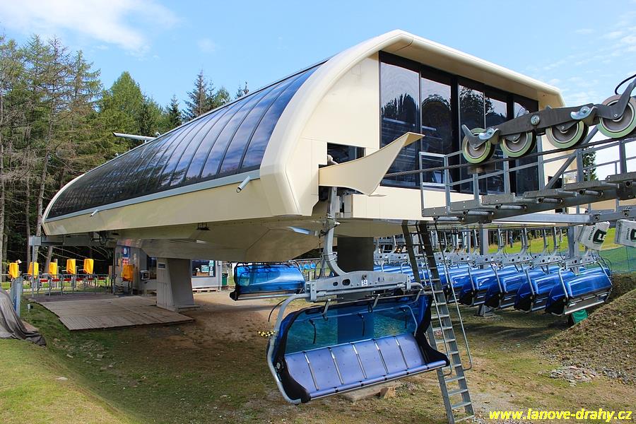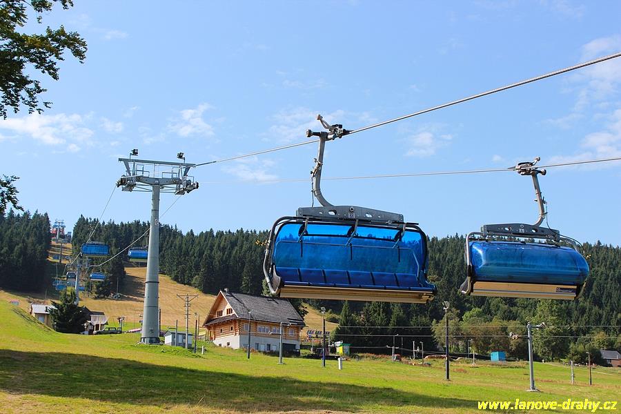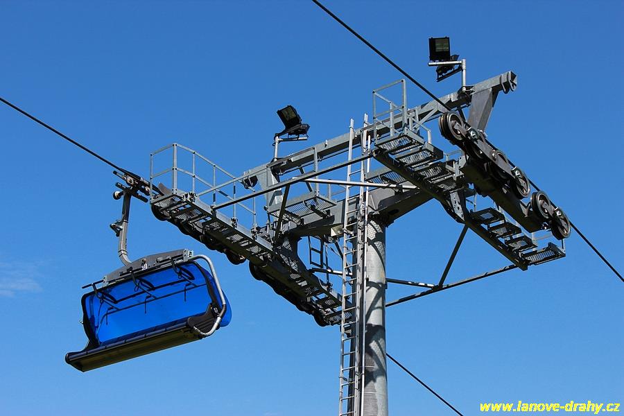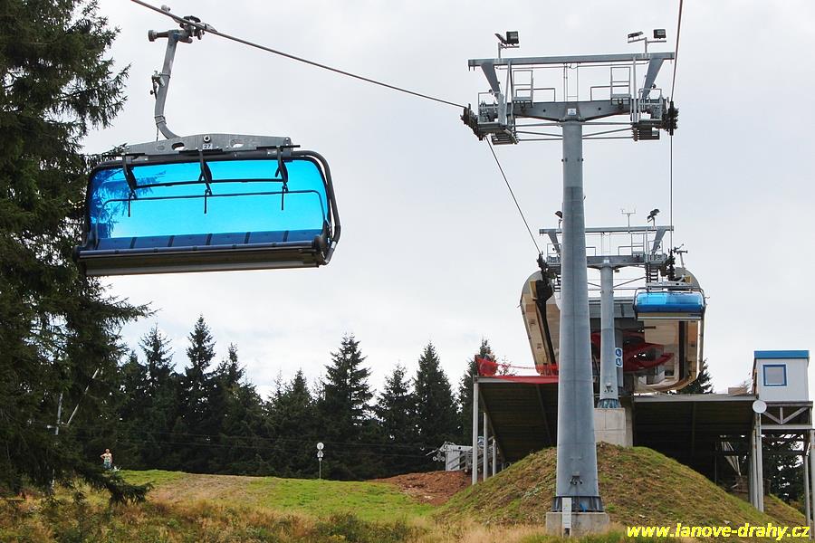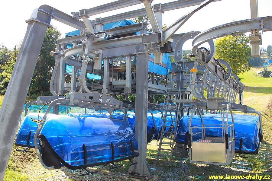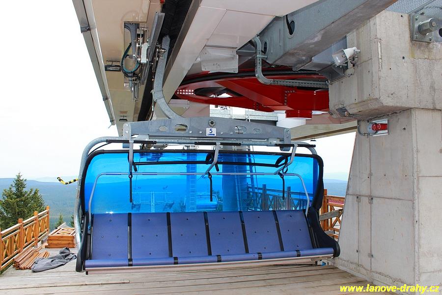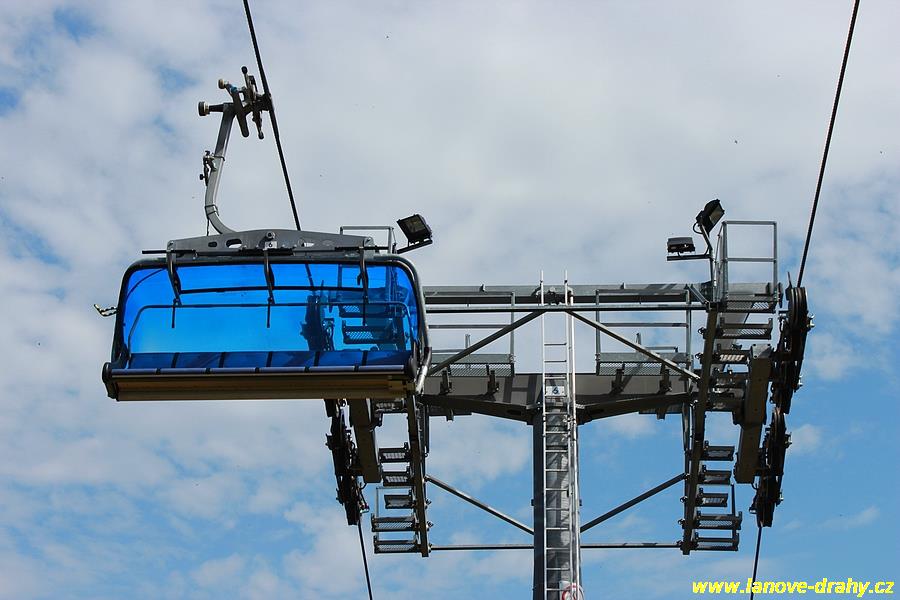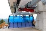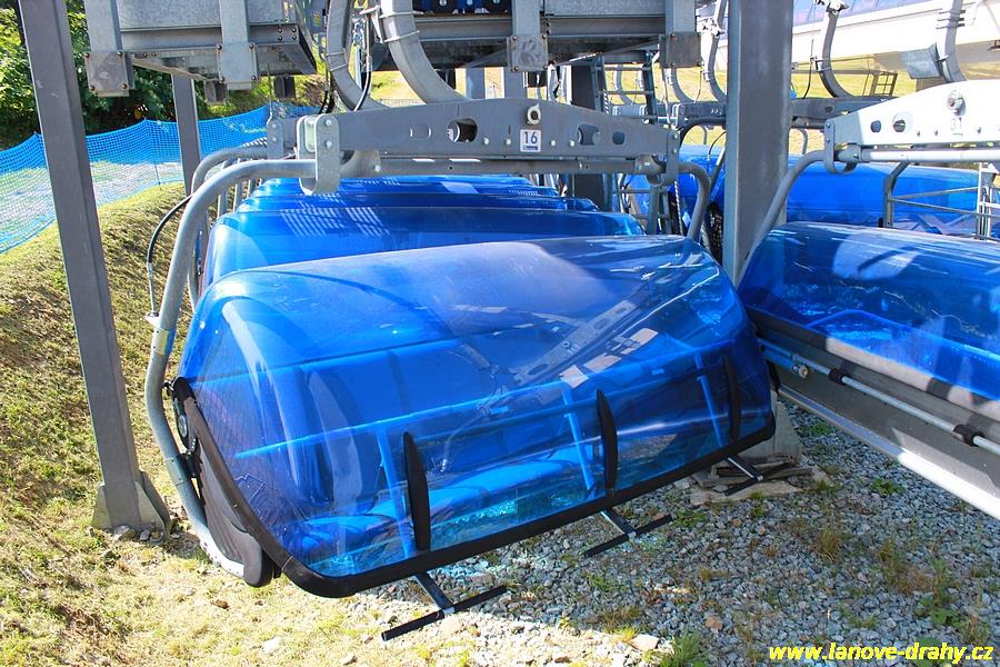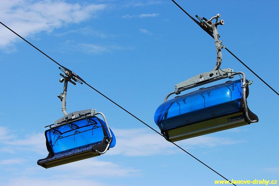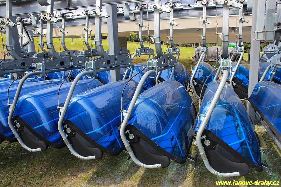 uchycením osmimístných kabinek a šestimístných sedaček s modrými bublinami |