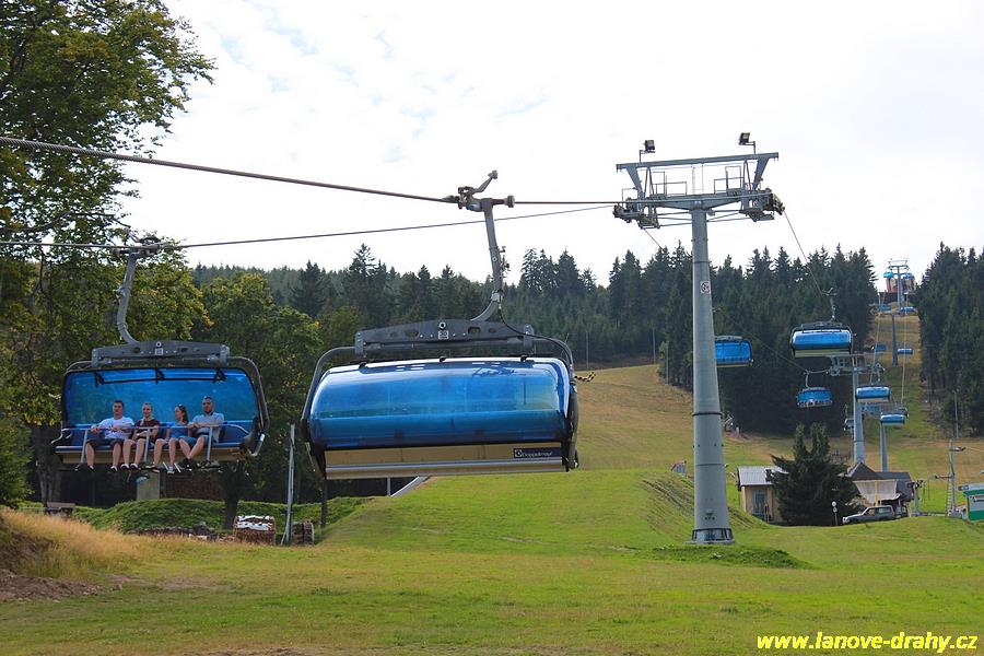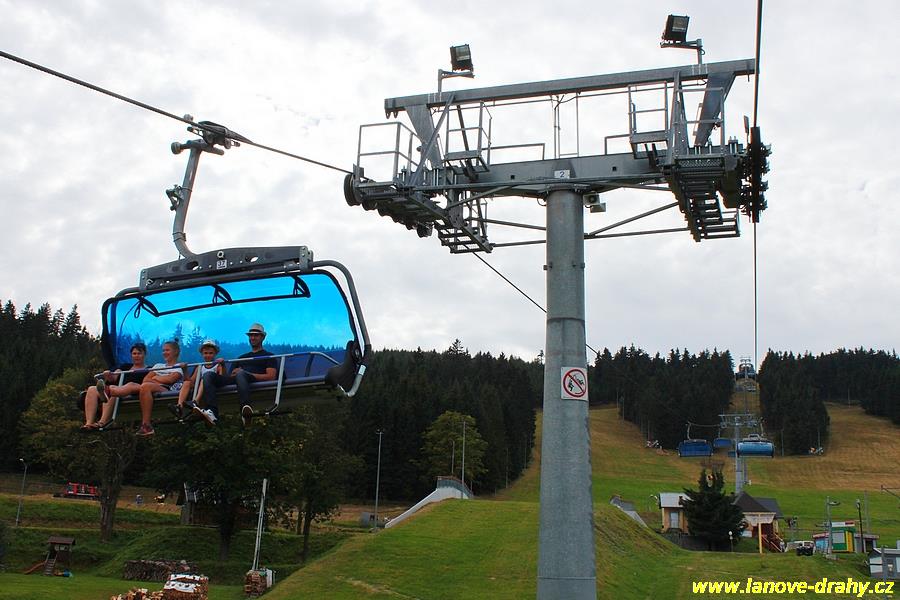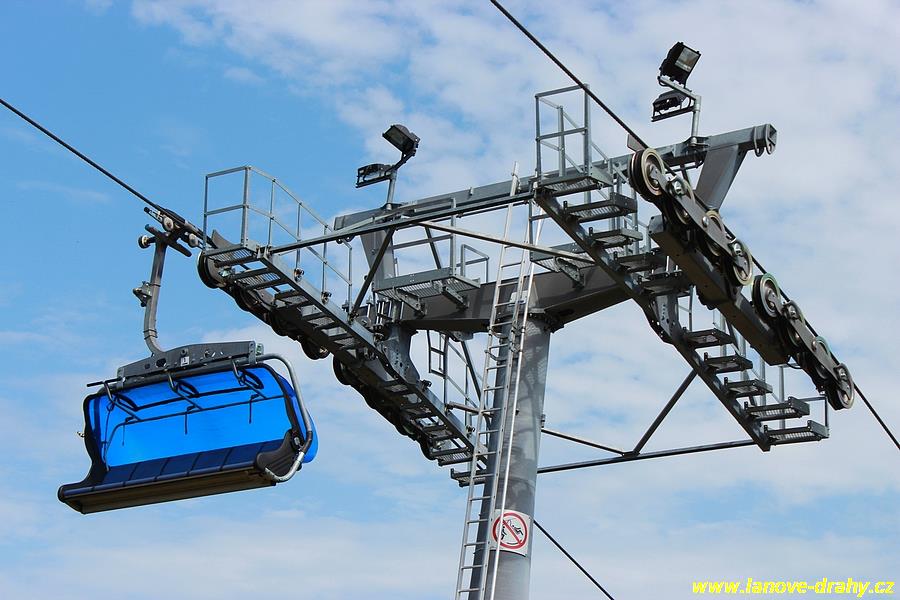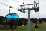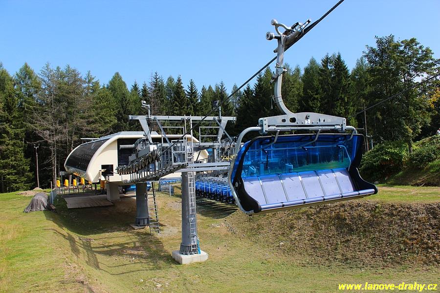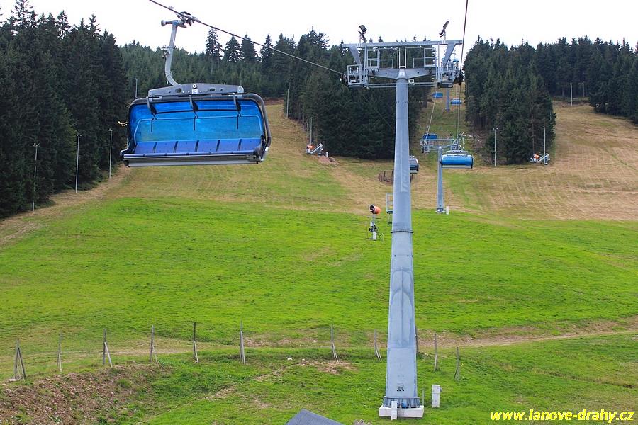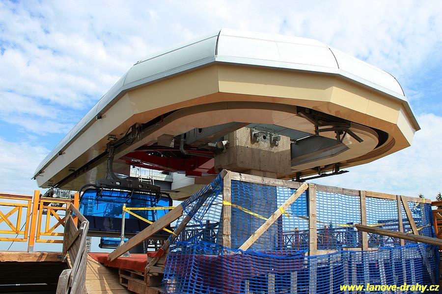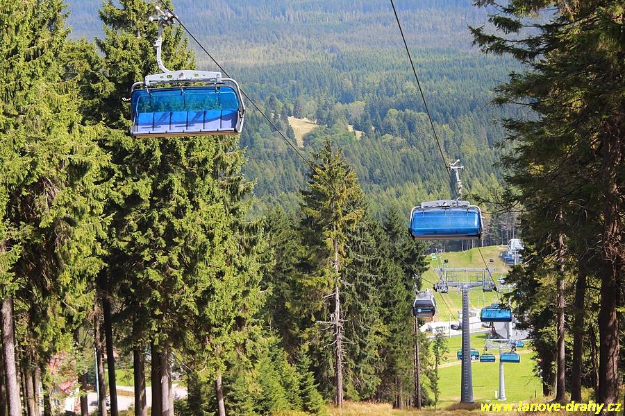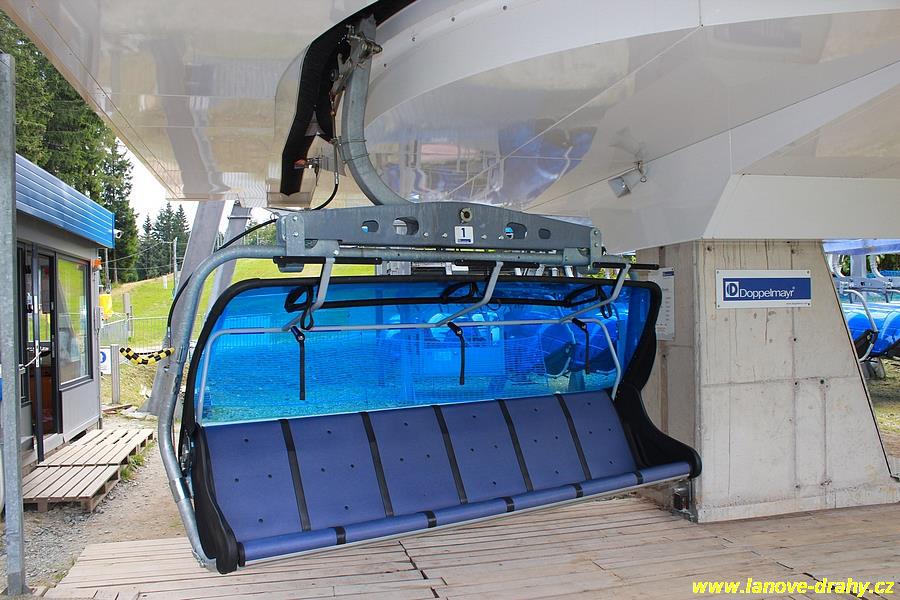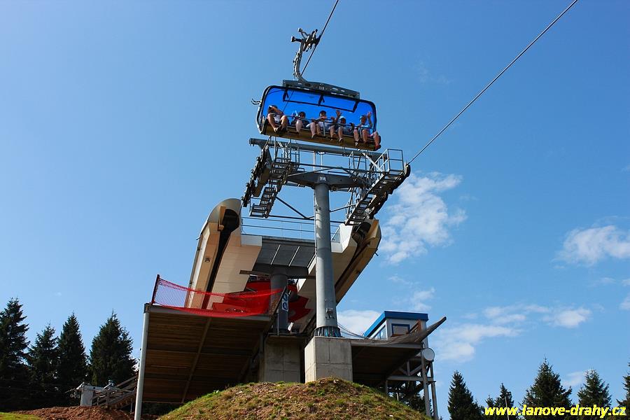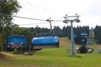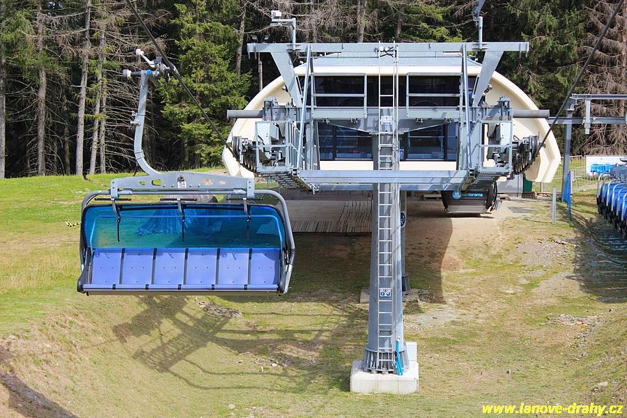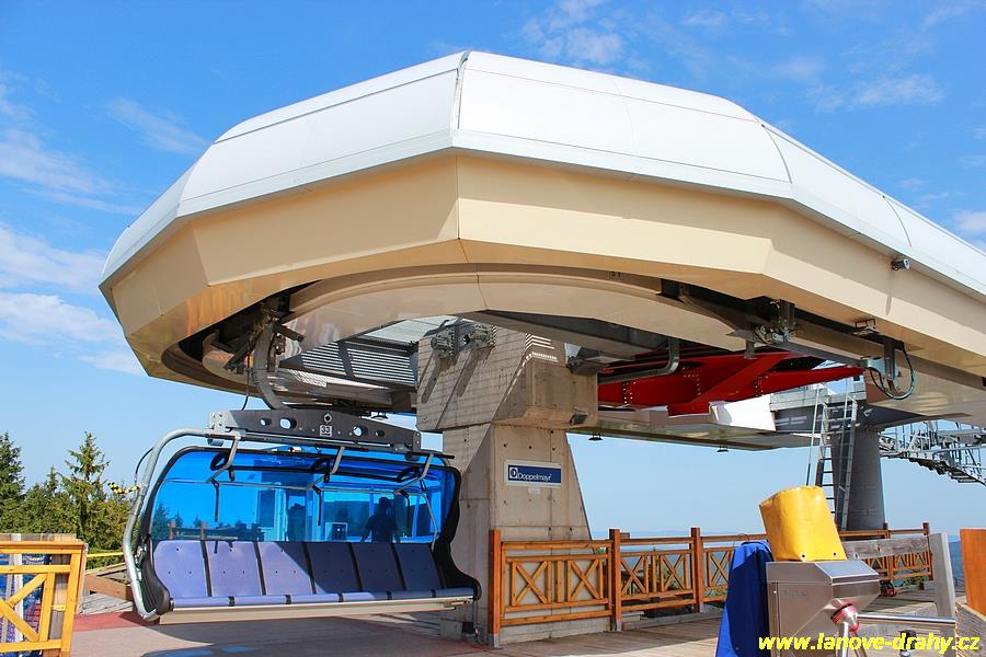 uchycením osmimístných kabinek a šestimístných sedaček s modrými bublinami |