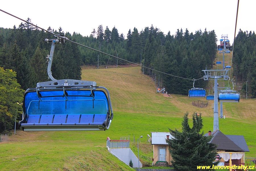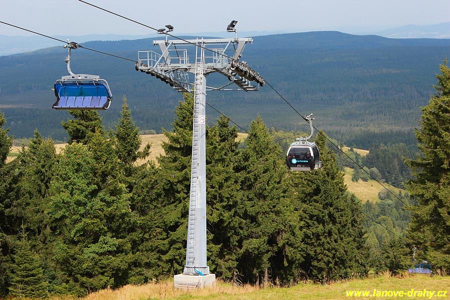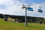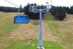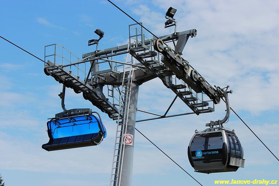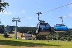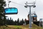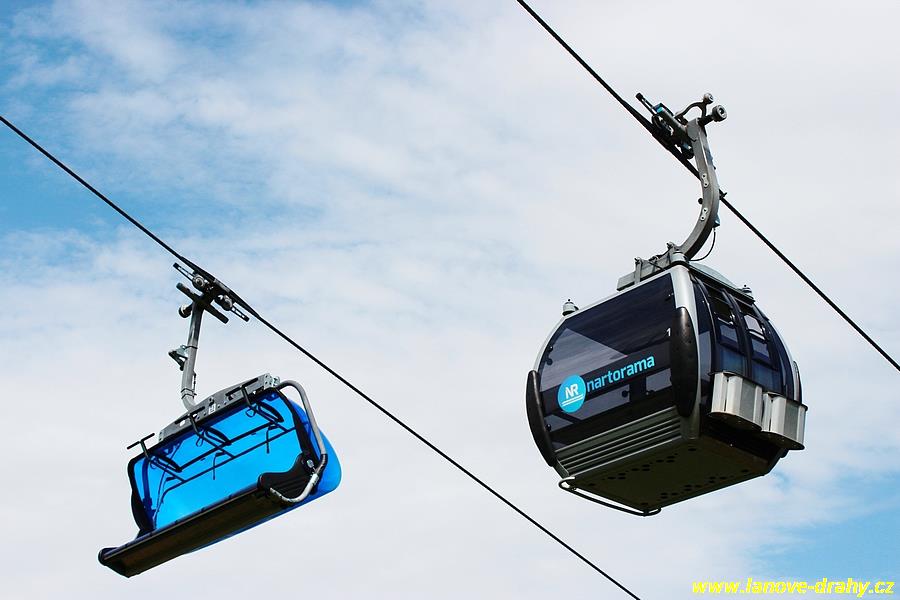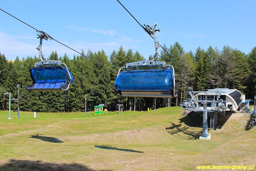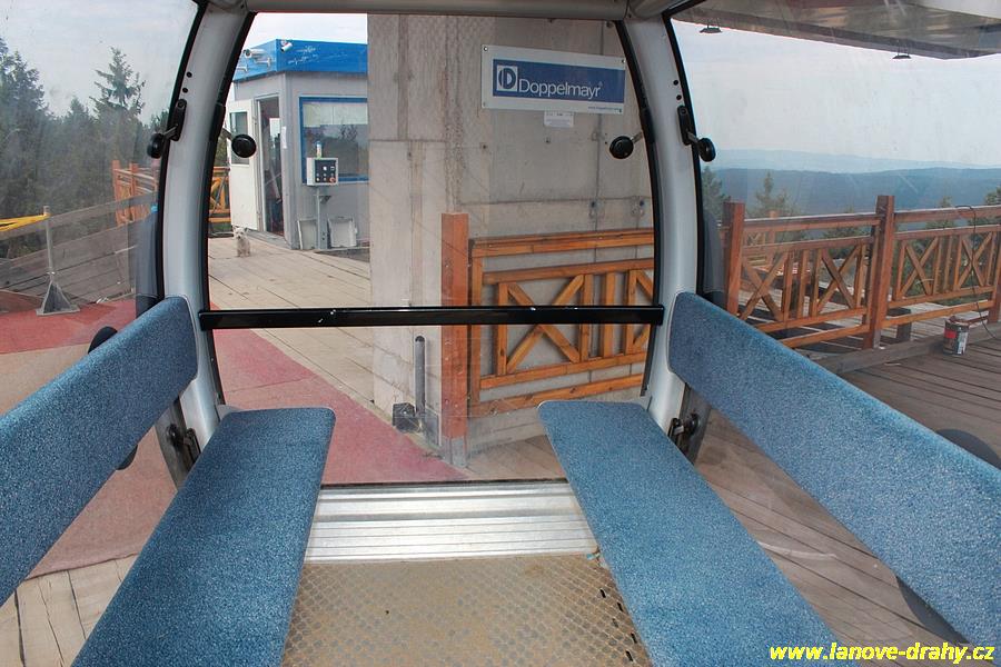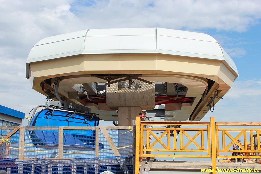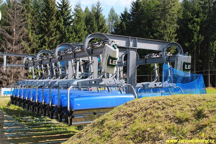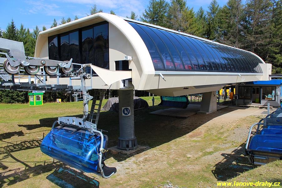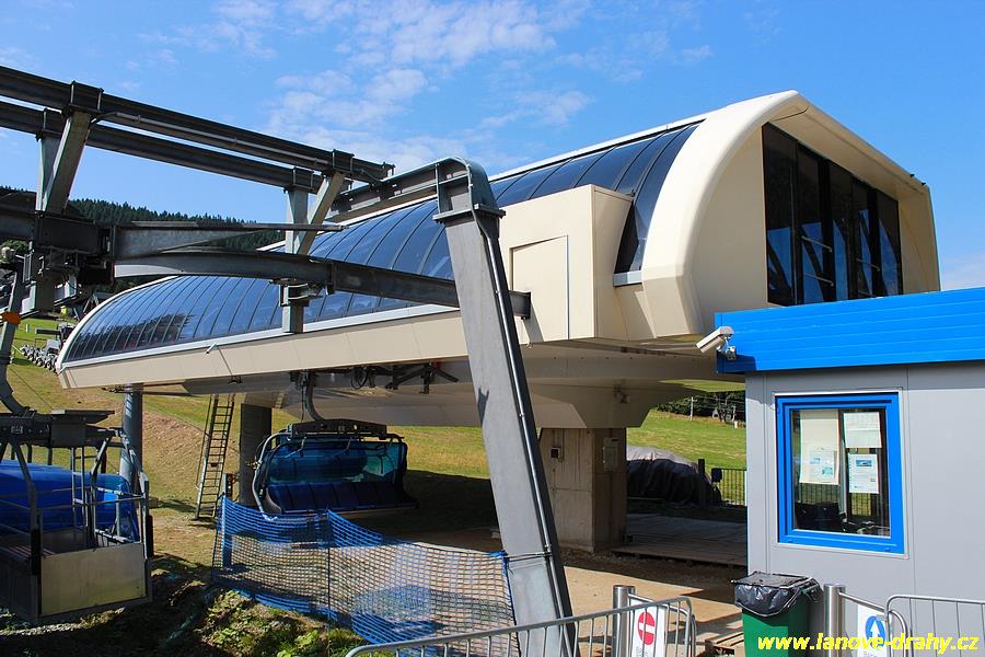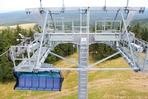 uchycením osmimístných kabinek a šestimístných sedaček s modrými bublinami |