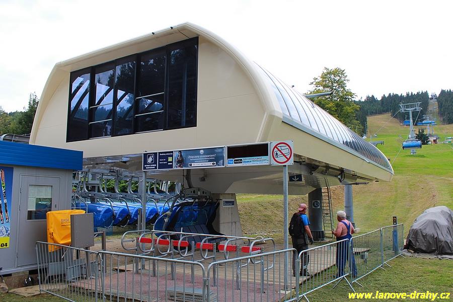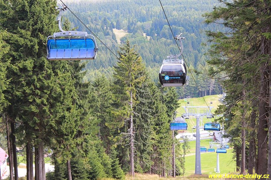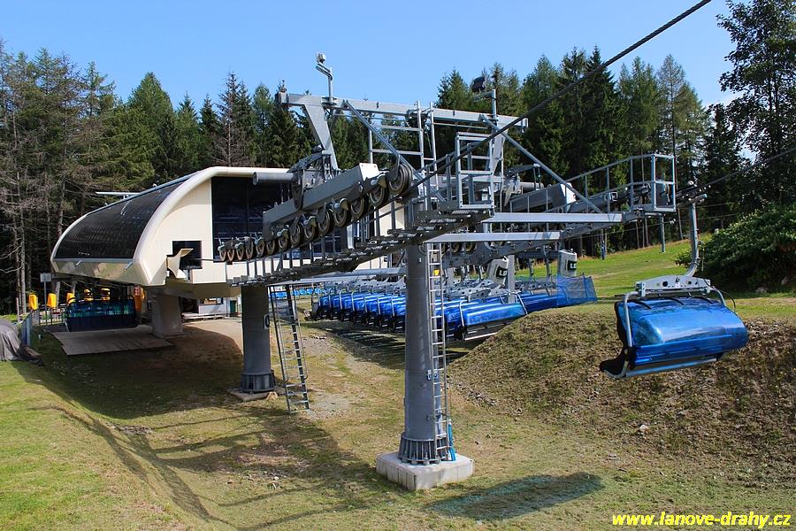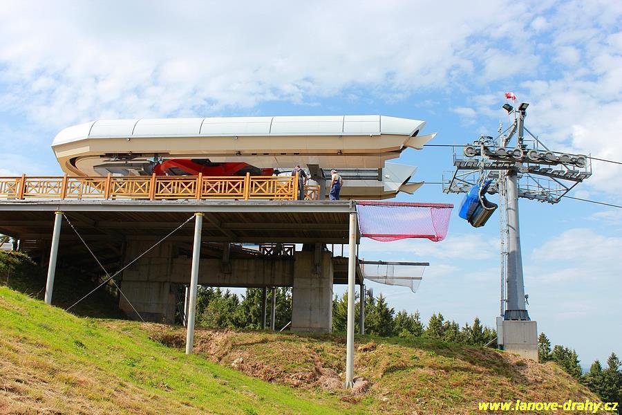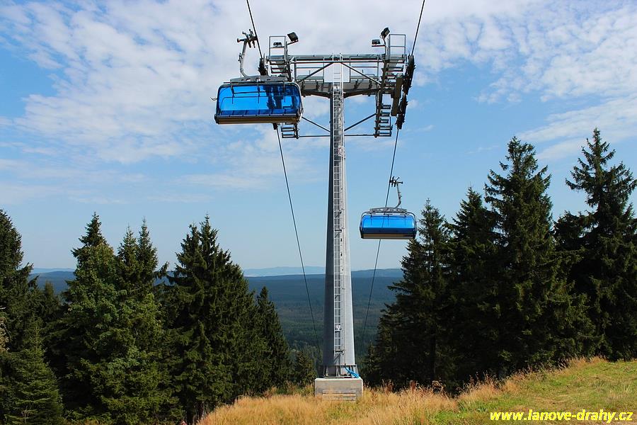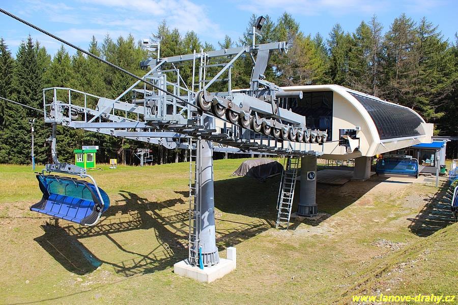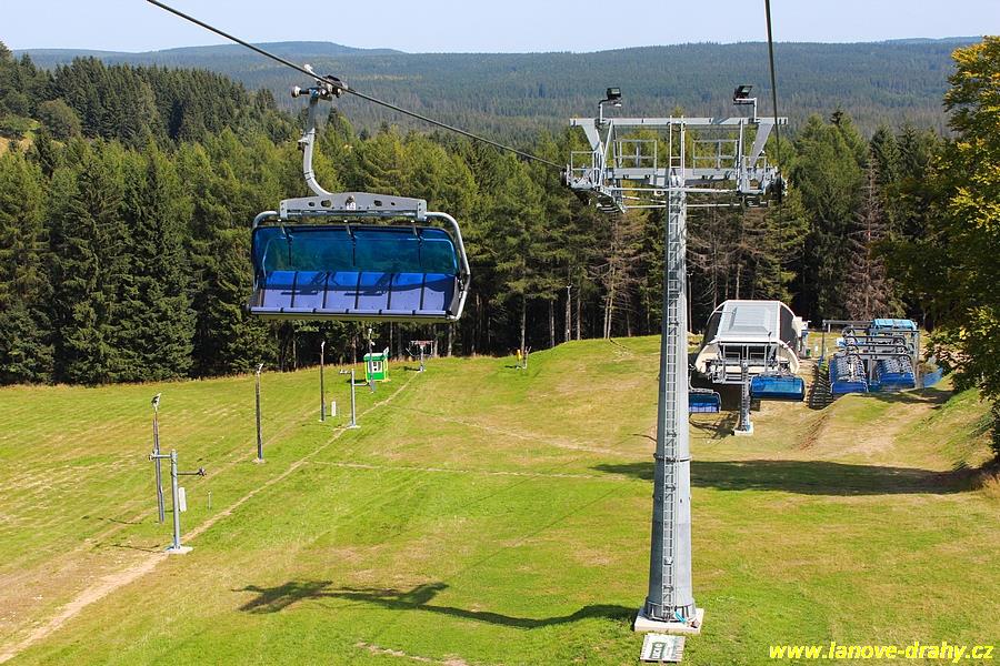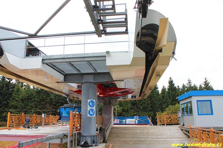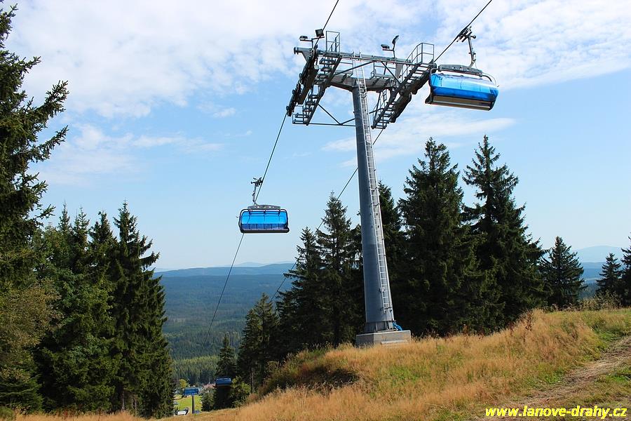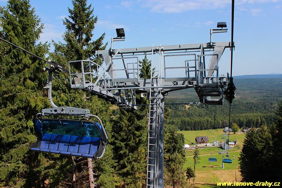 uchycením osmimístných kabinek a šestimístných sedaček s modrými bublinami |