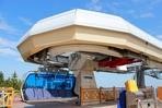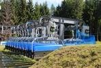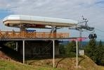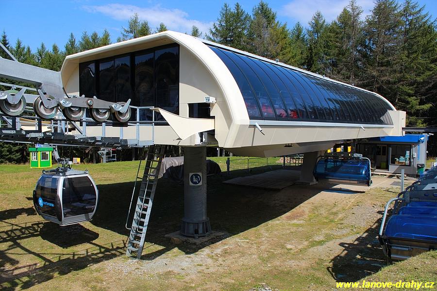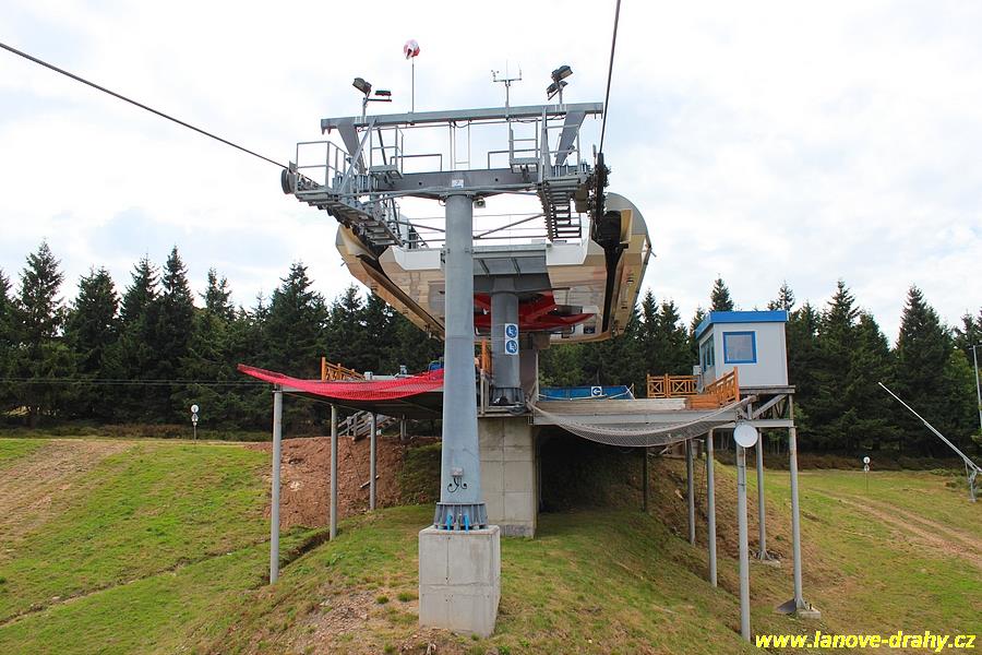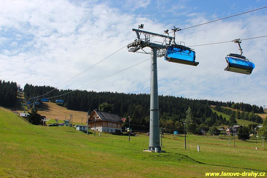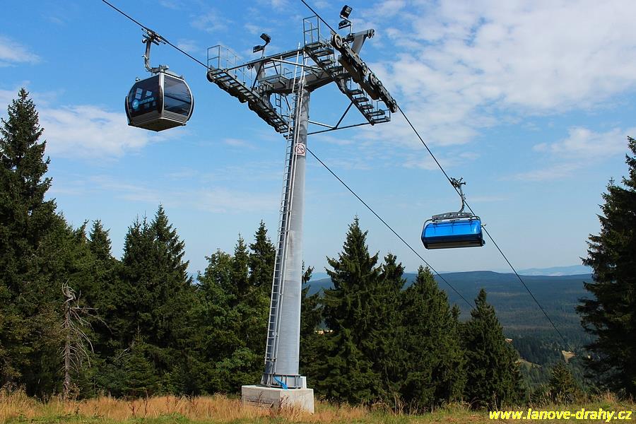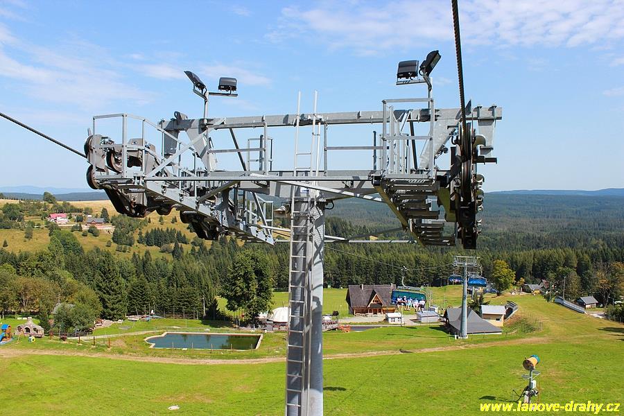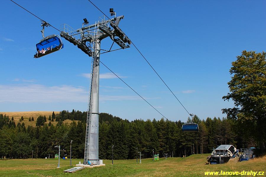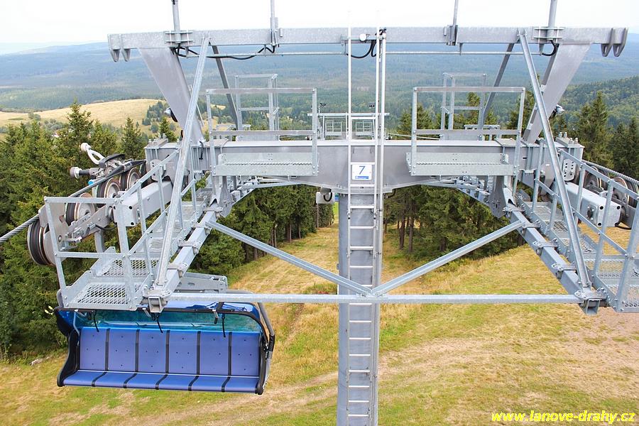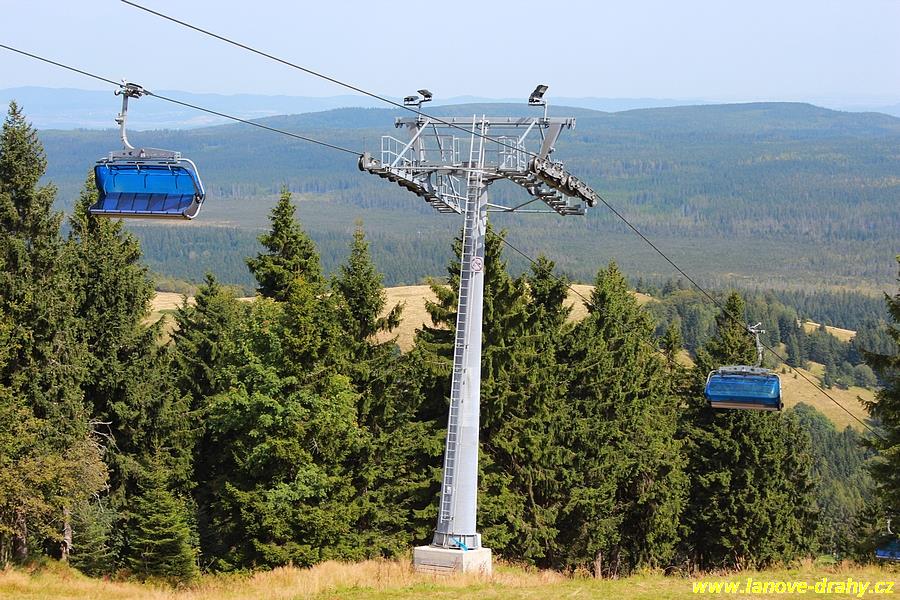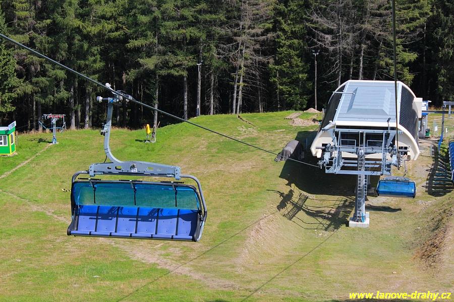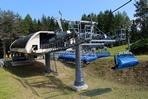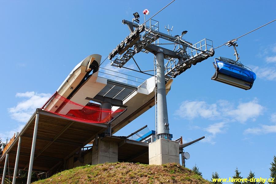 uchycením osmimístných kabinek a šestimístných sedaček s modrými bublinami |