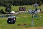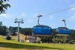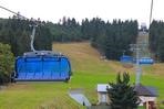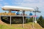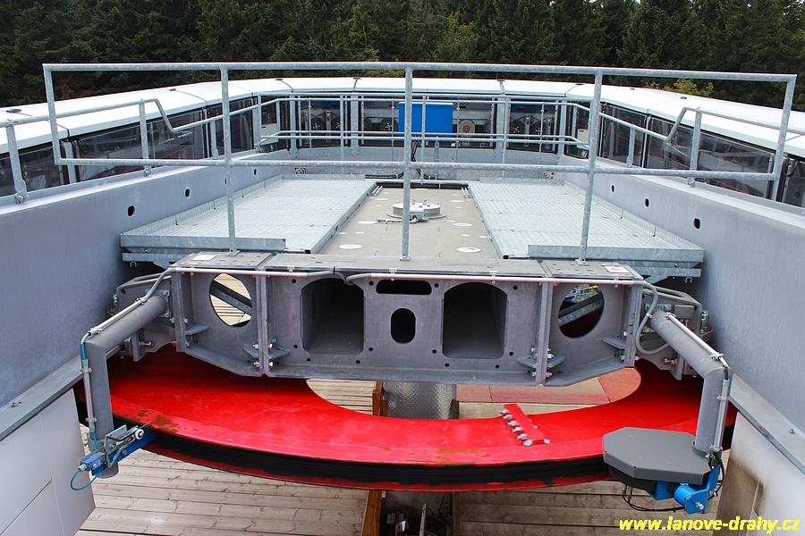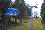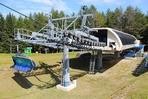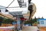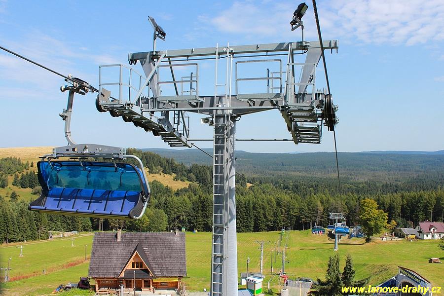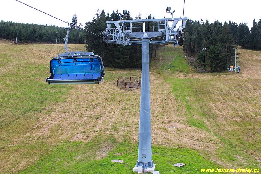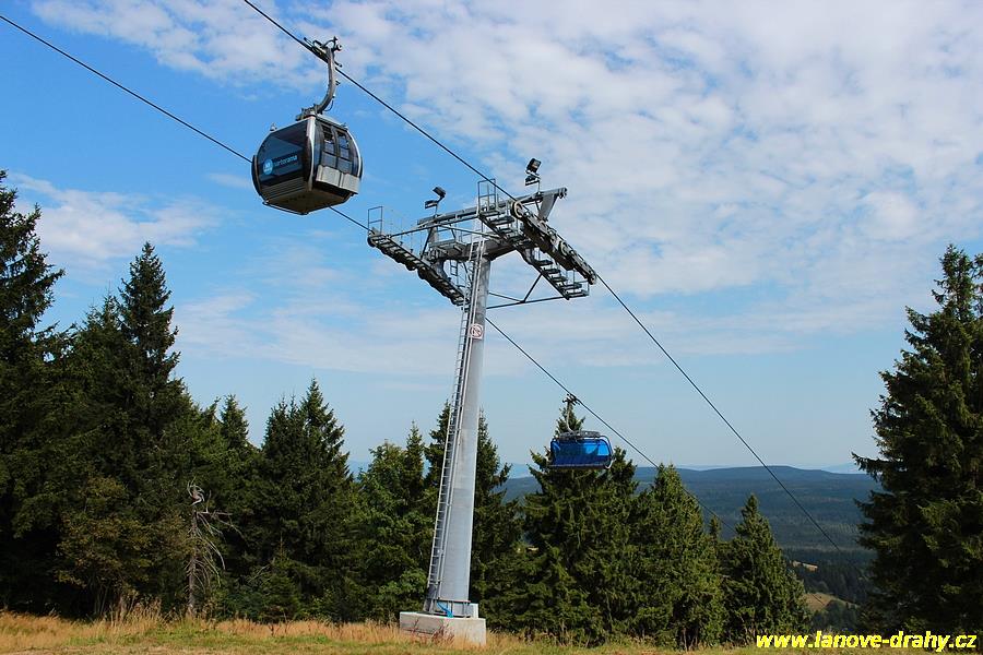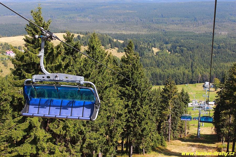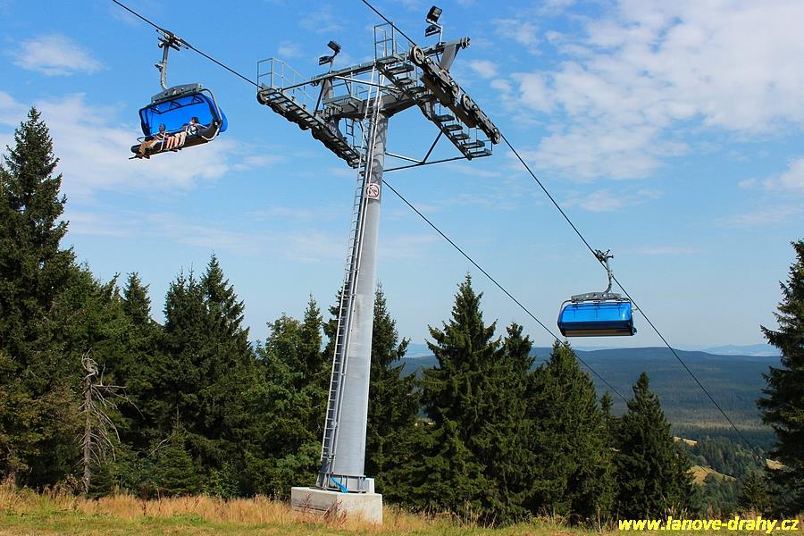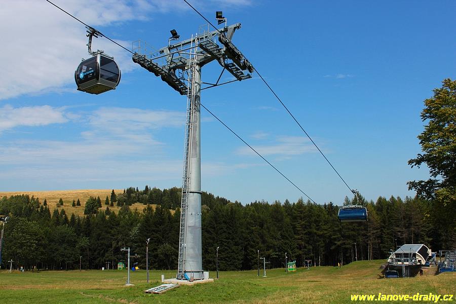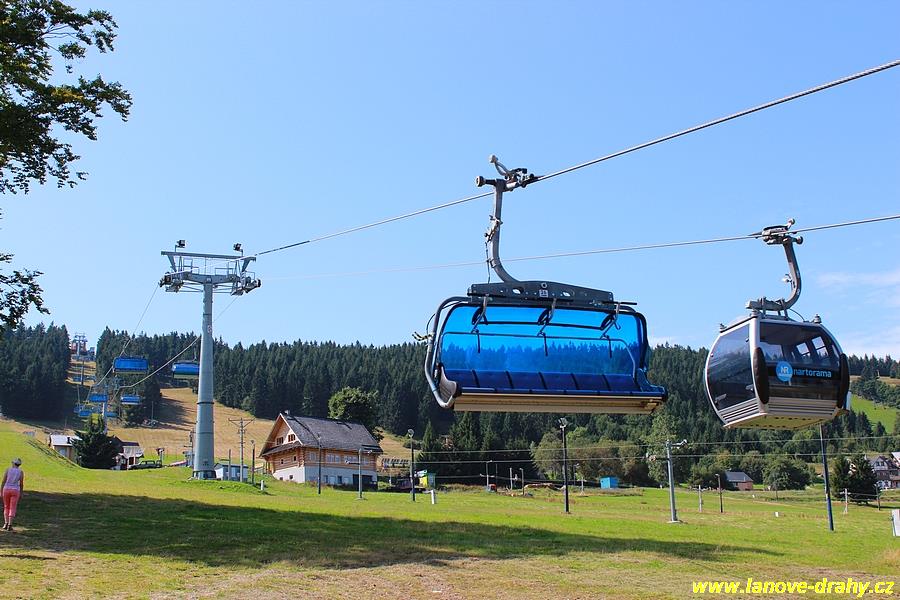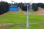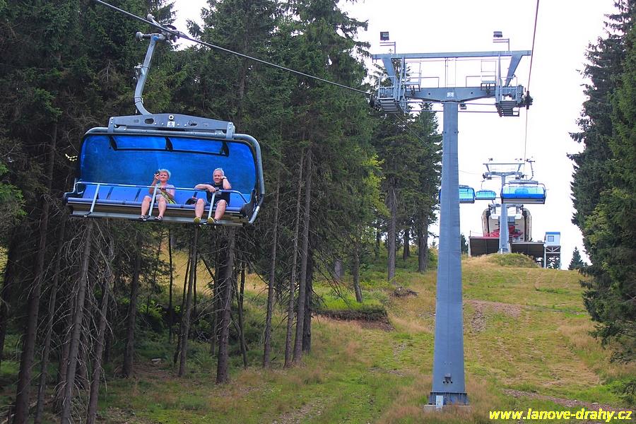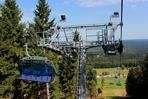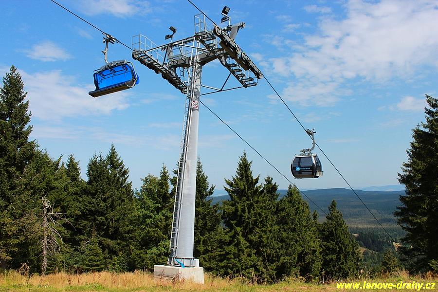 uchycením osmimístných kabinek a šestimístných sedaček s modrými bublinami |