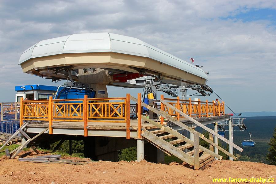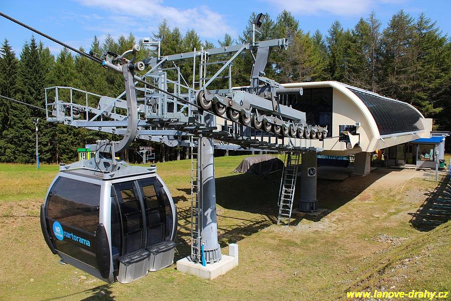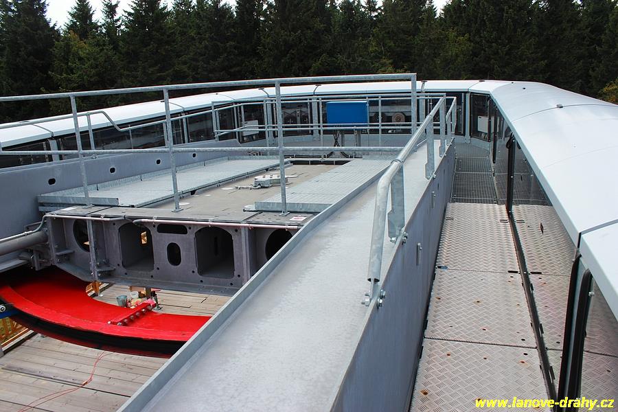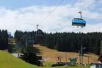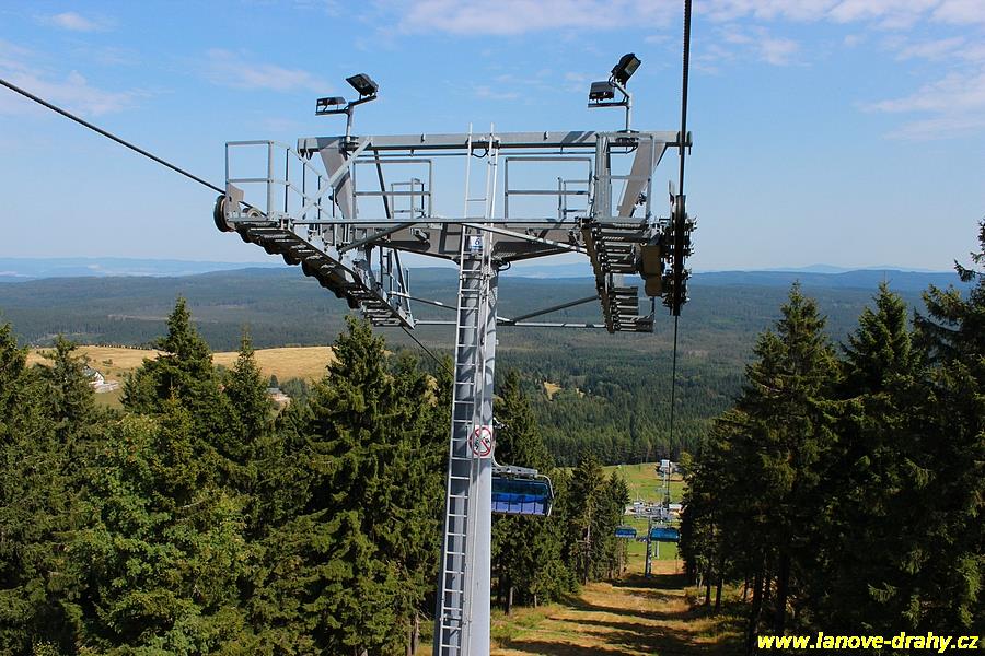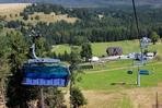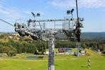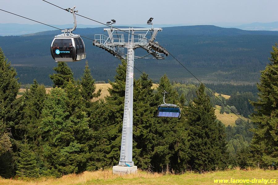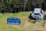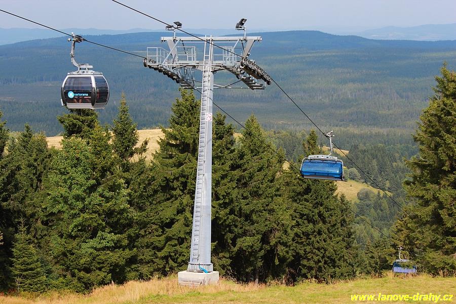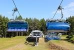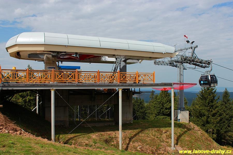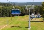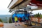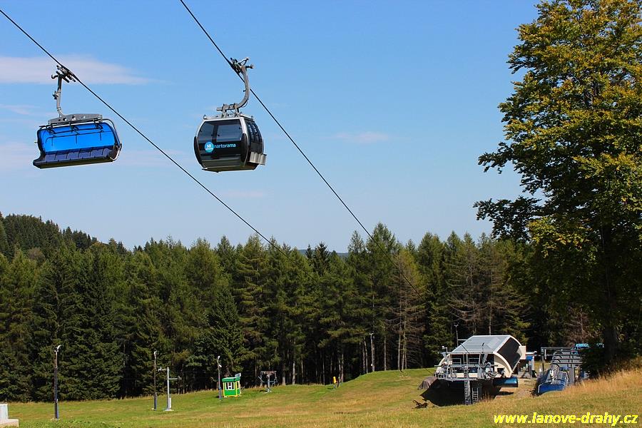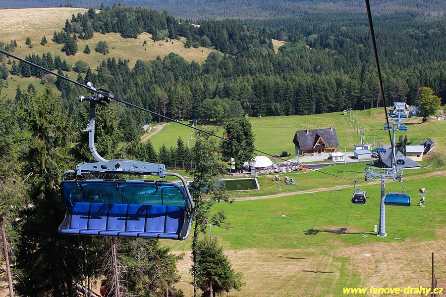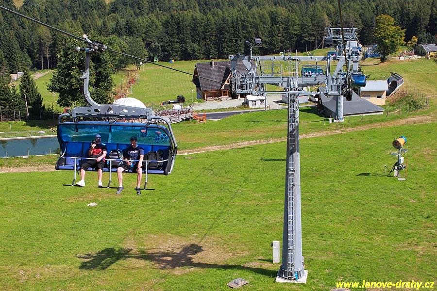 uchycením osmimístných kabinek a šestimístných sedaček s modrými bublinami |