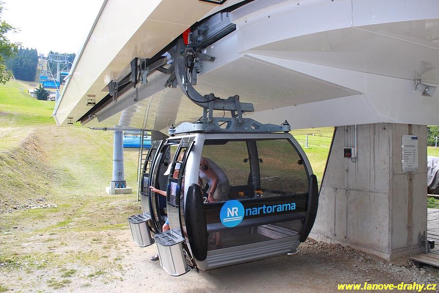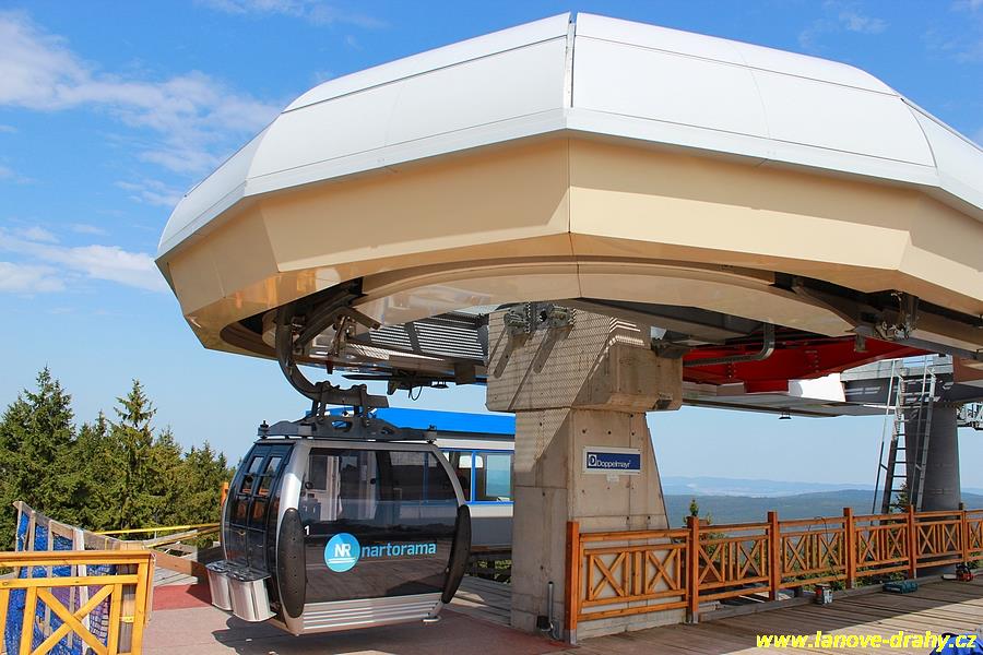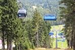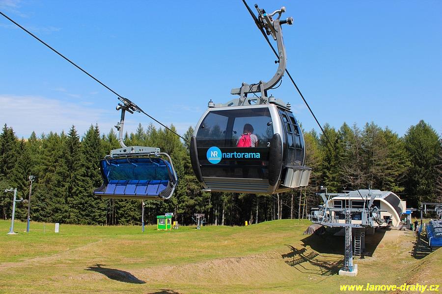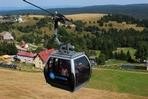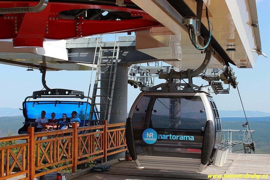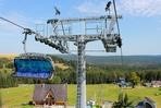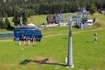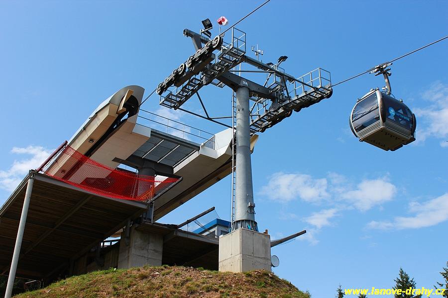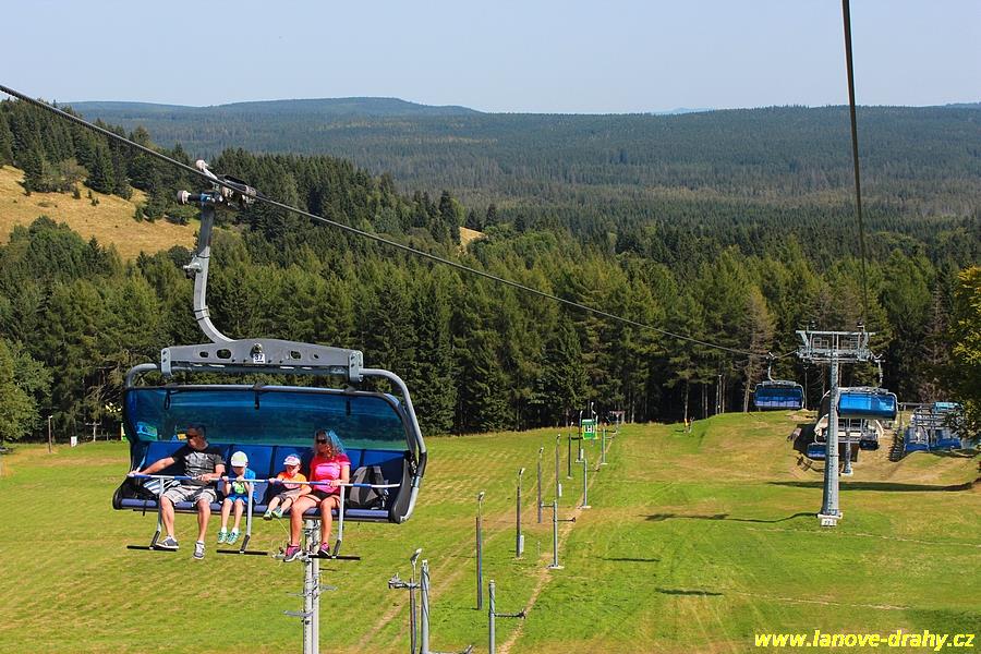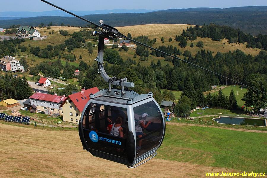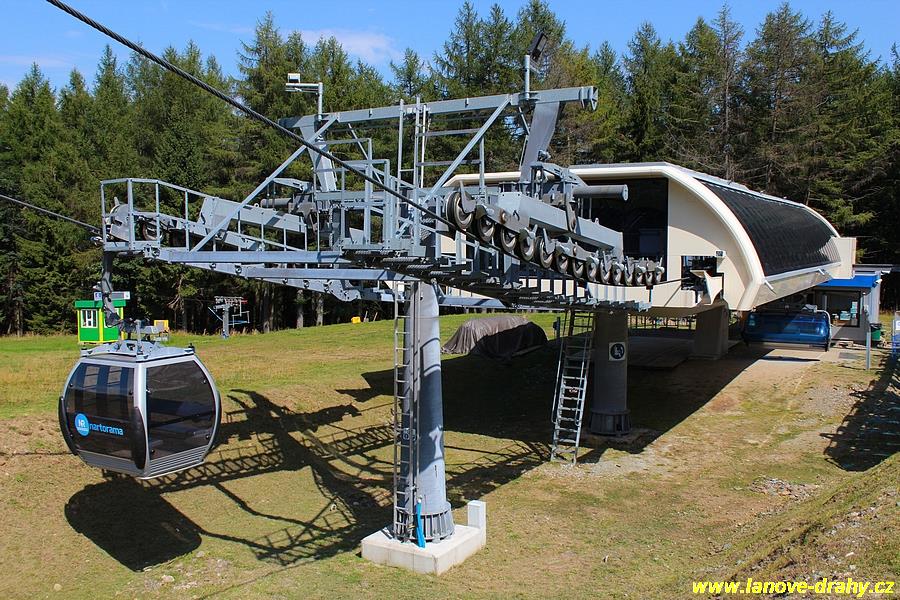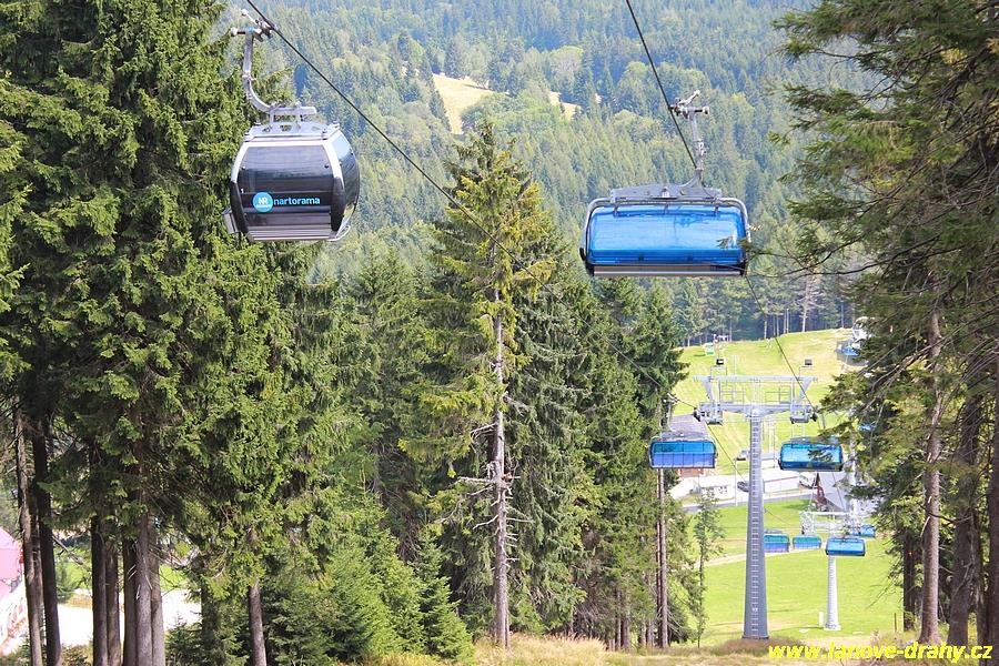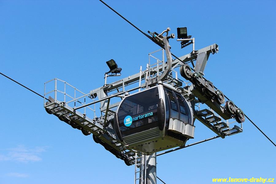 uchycením osmimístných kabinek a šestimístných sedaček s modrými bublinami |