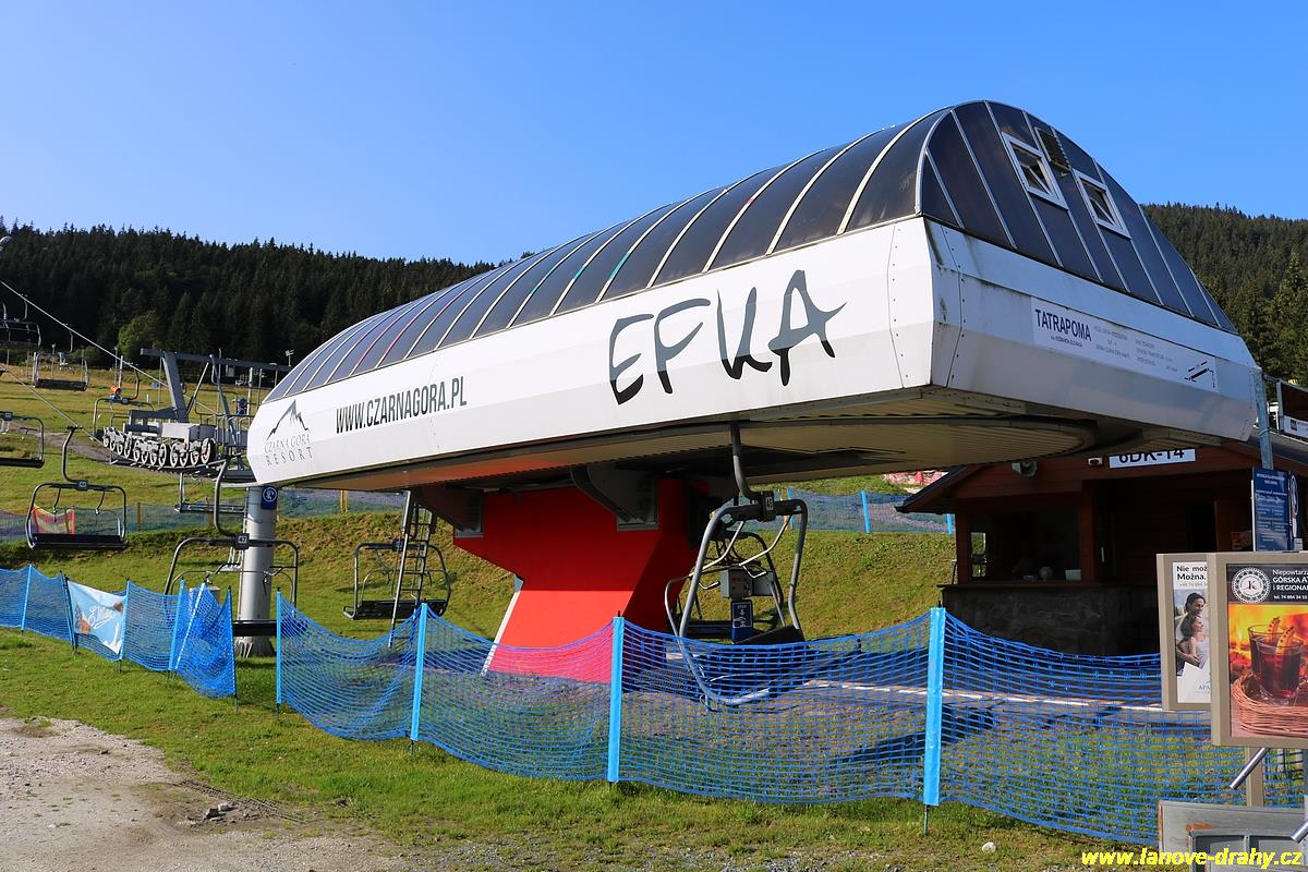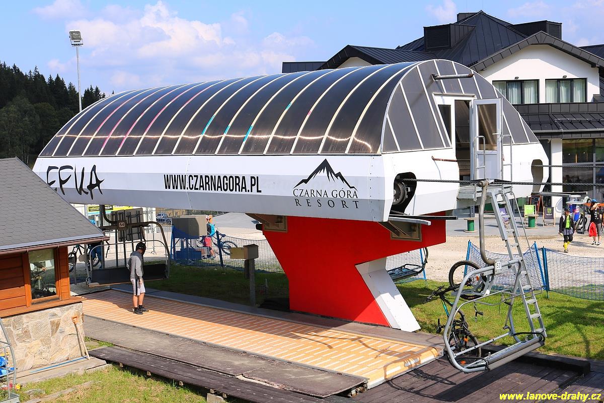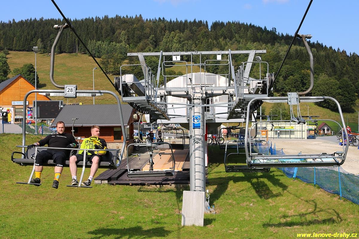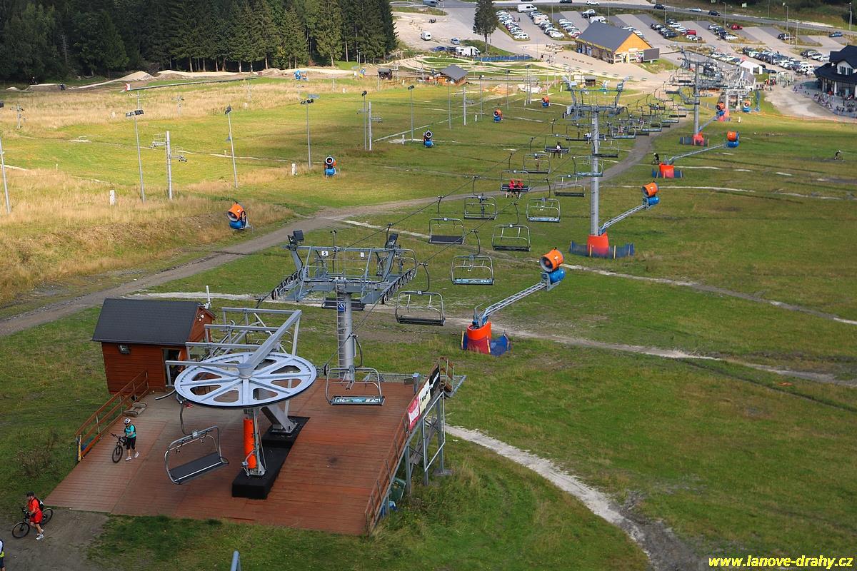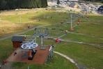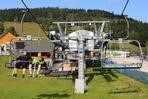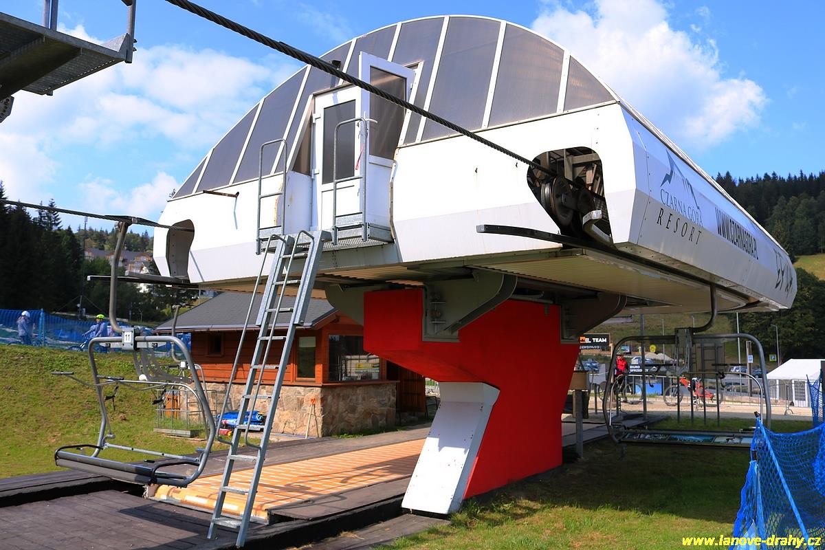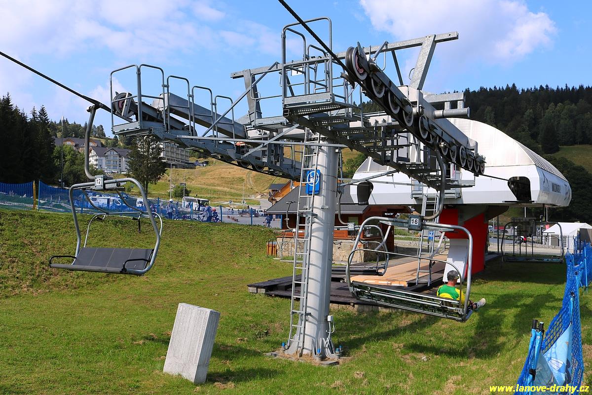 osobní visutá jednolanová dráha oběžného systému s pevným uchycením čtyřmístných sedaček a rozběhovým pásem |