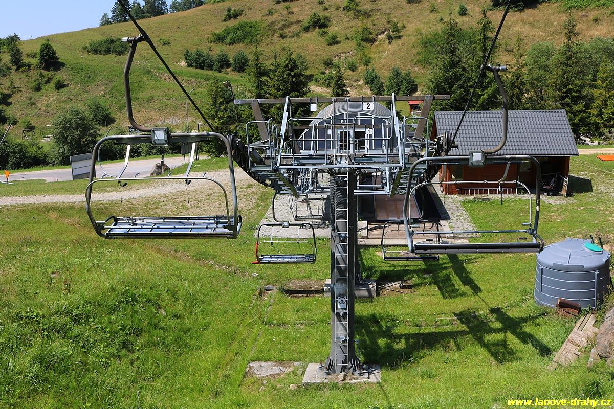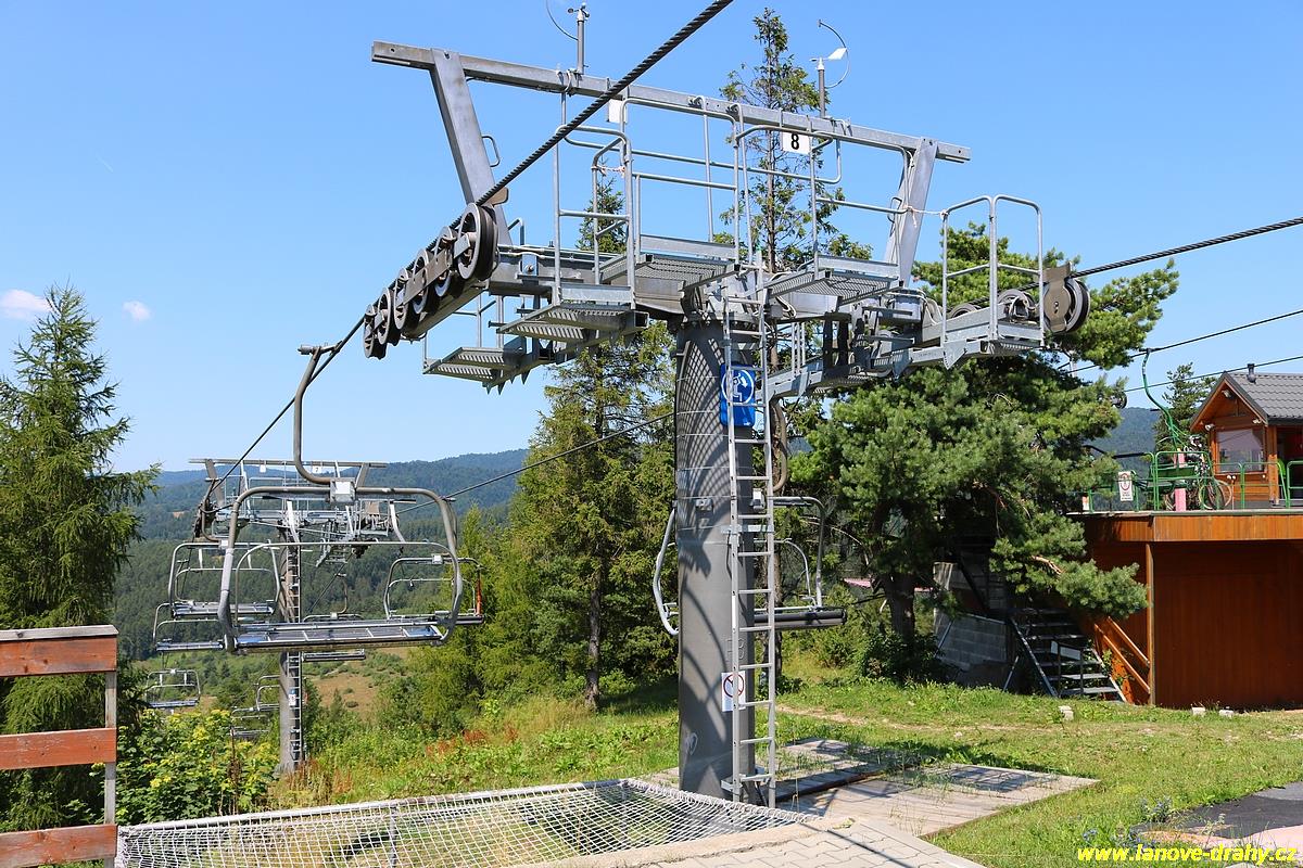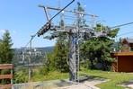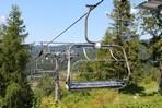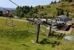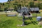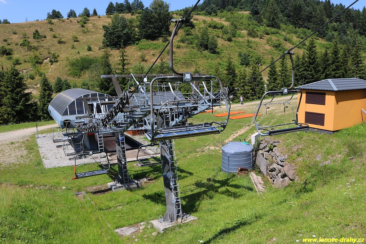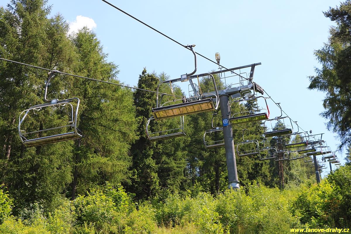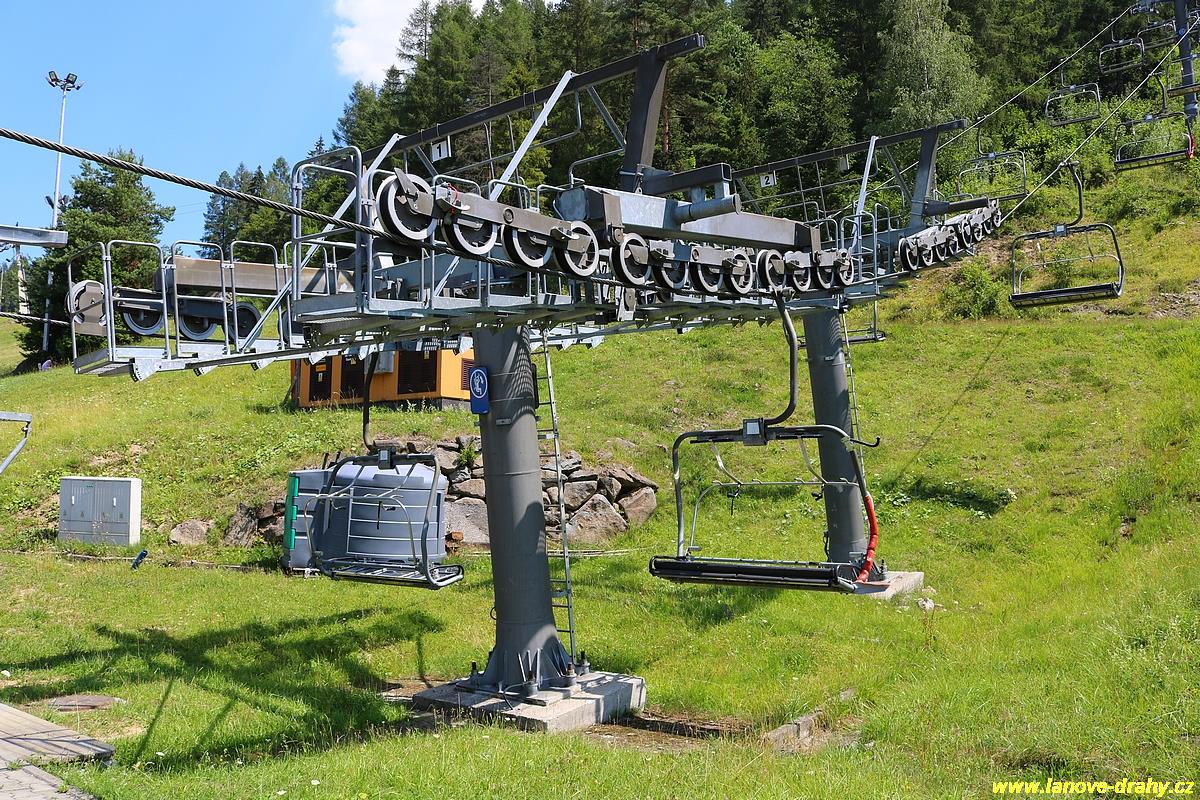 osobní visutá jednolanová dráha oběžného systému s pevným uchycením čtyřmístných sedaček a rozběhovým pásem |