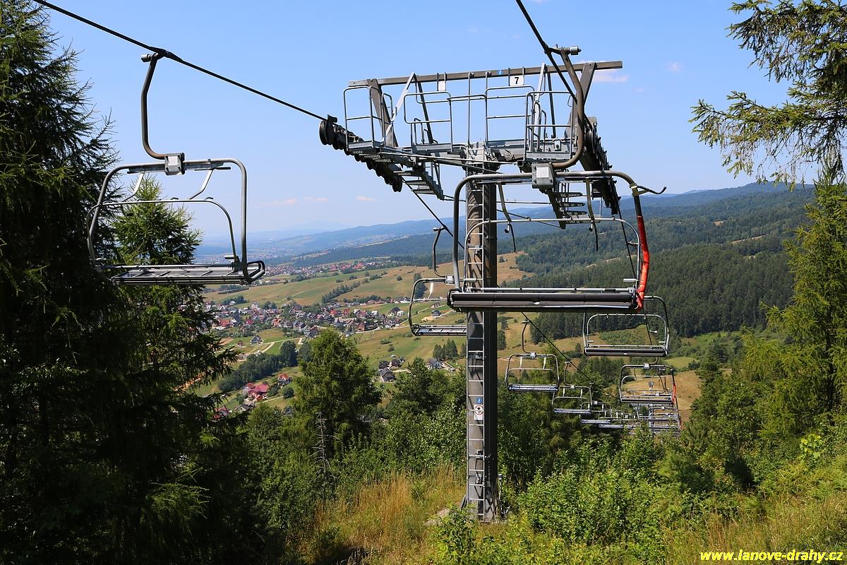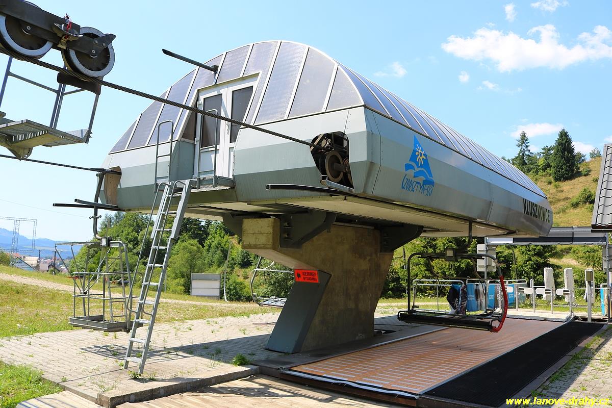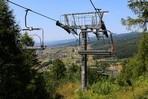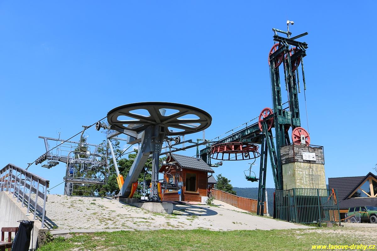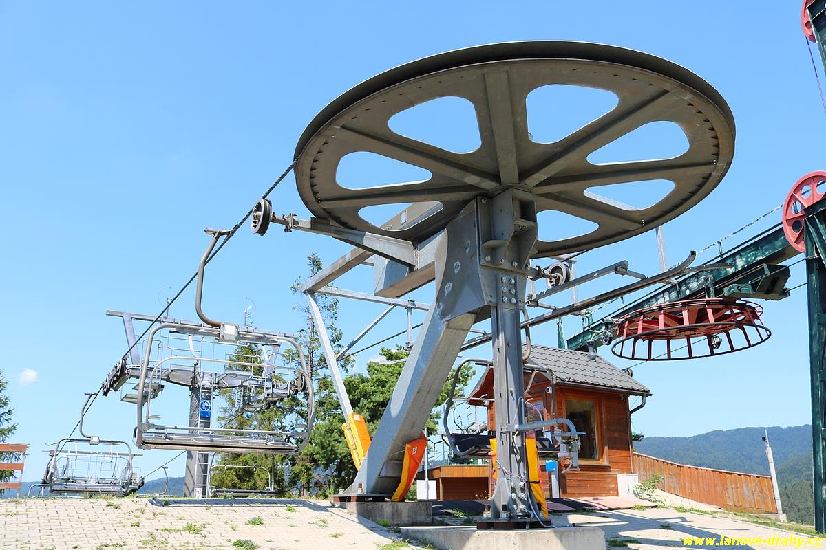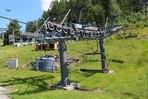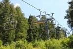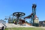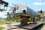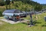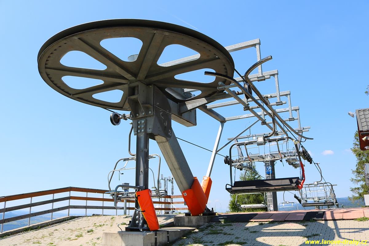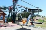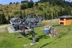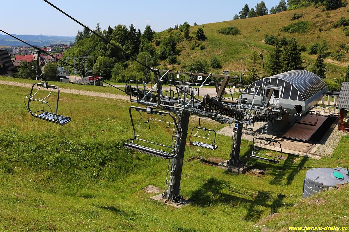 osobní visutá jednolanová dráha oběžného systému s pevným uchycením čtyřmístných sedaček a rozběhovým pásem |