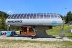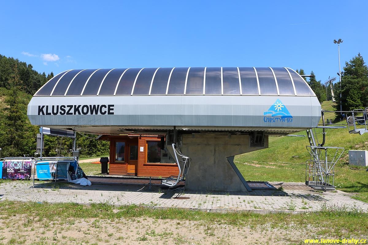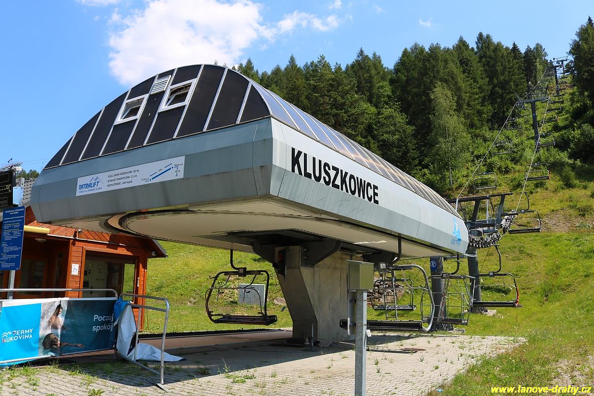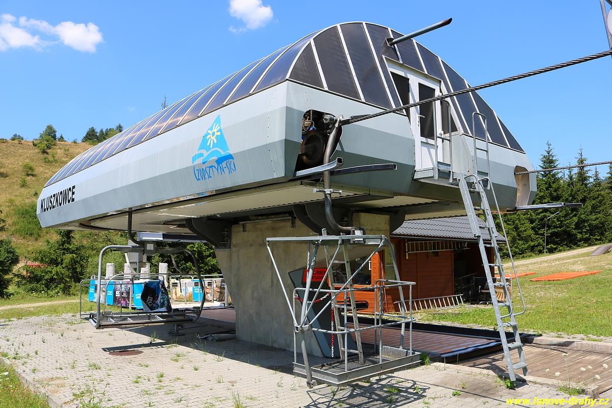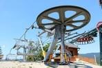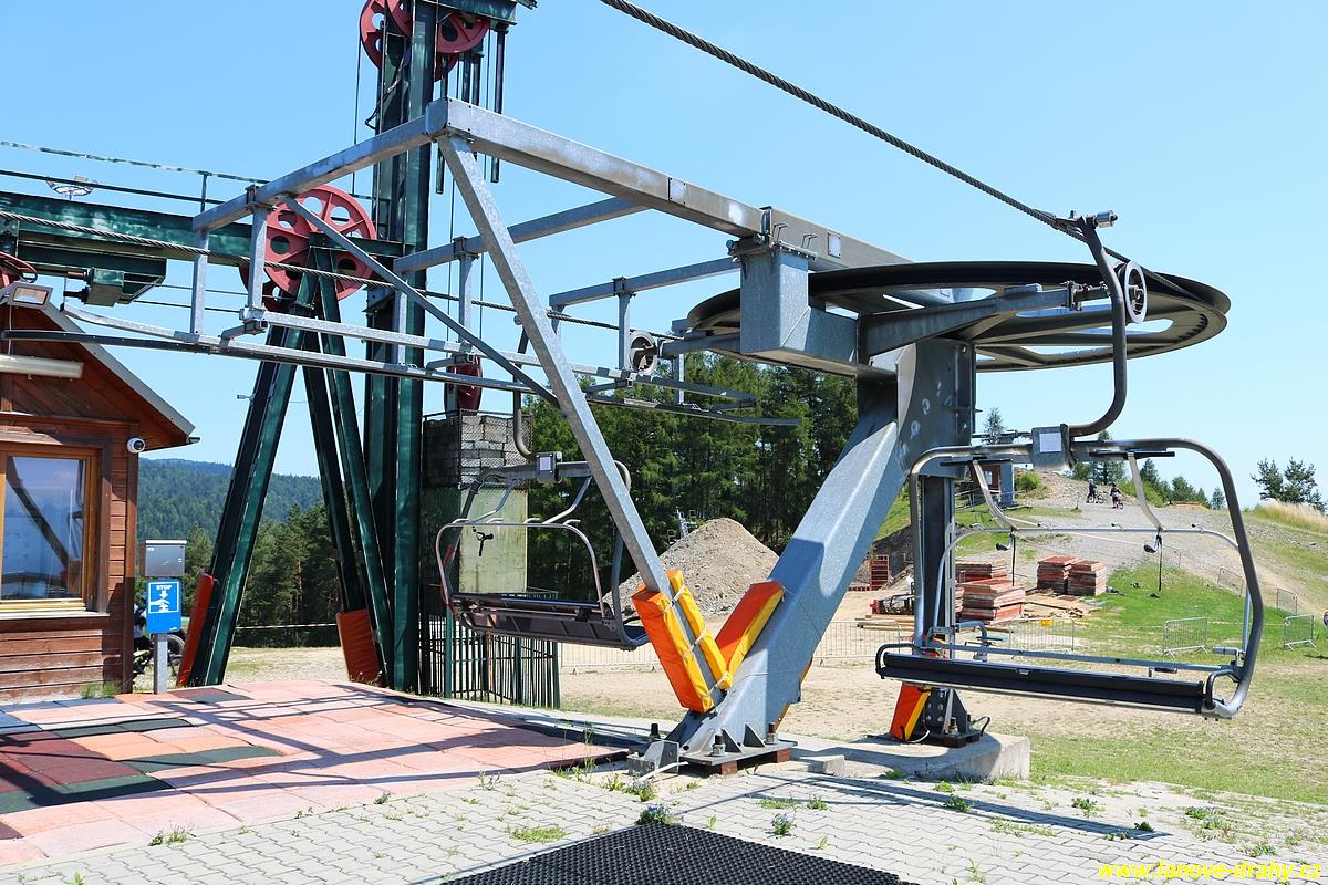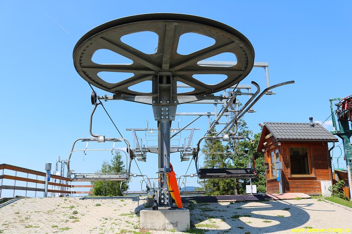 osobní visutá jednolanová dráha oběžného systému s pevným uchycením čtyřmístných sedaček a rozběhovým pásem |
