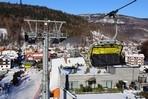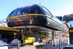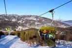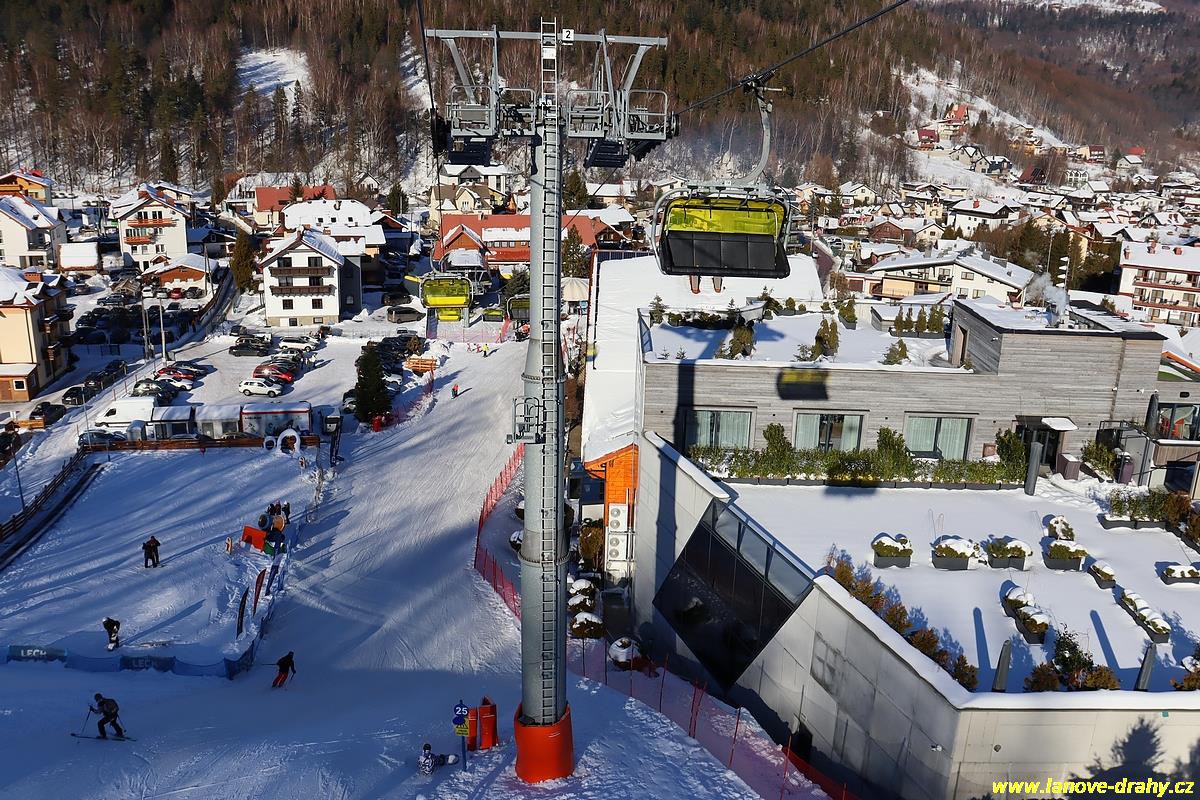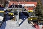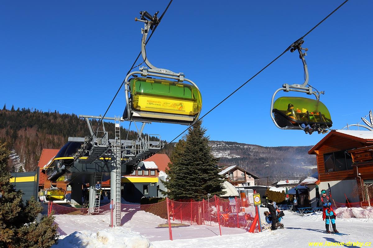 čtyřmístných sedaček se žlutými bublinami a s nástupním pásem |