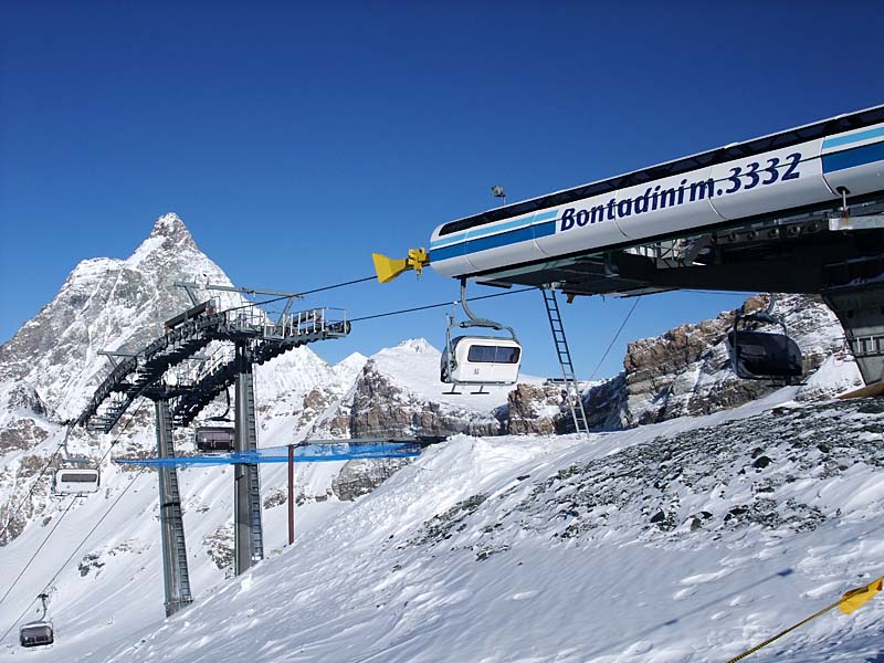 Poznámka: Sedačková lanovka "Bontadini" firmy Leitner vede na Theodulpass (3301 m.n.m.), který je spojnicí mezi italskou Cervinií a švýcarským Zermattem. Na fotografii pohled přes Theodulpass na Klein Matterhorn s vrcholovou stanicí lanovky z Trockener Steg.