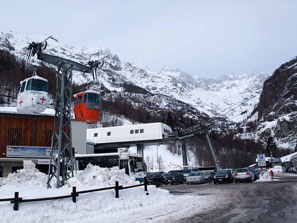 Poznámka: Dolní stanice kabinkové lanovky ve Valtournenche se skibusem a "pomníkem" původní kabinky.
