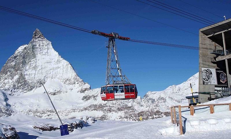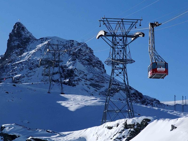 Poznámka: Původní kabinová lanovka firmy Von Roll zprovozněná v roce 1979 vede ze stanice Trockener Steg (2939 m.n.m.) na Klein Matterhorn (3883 m.n.m.). Pohled na kabinu lanovky s Matterhornem v pozadí.