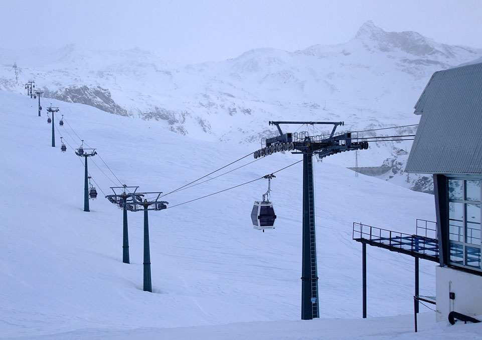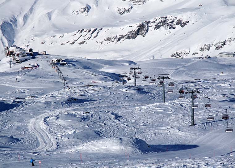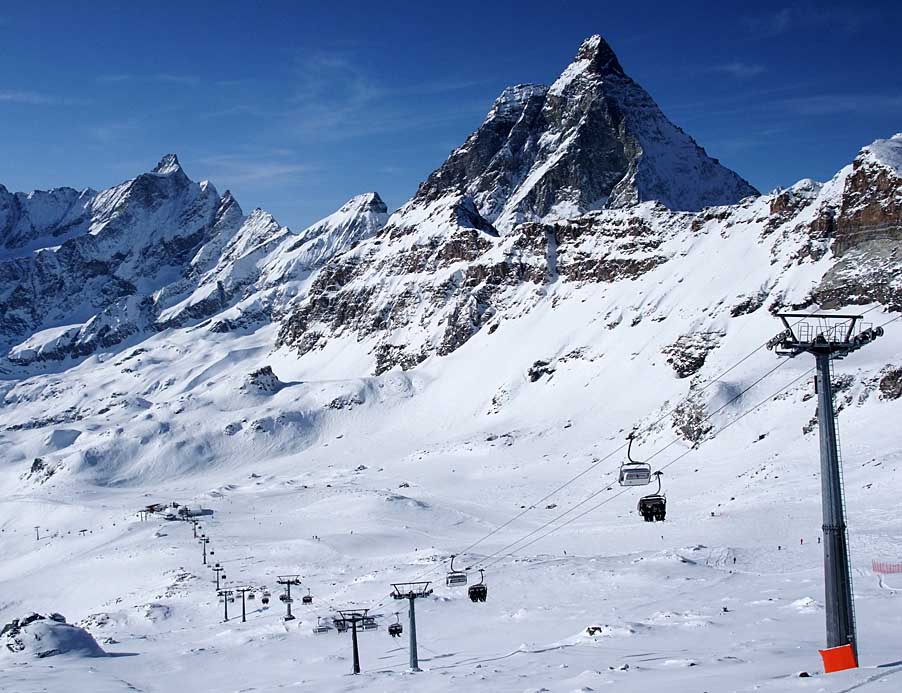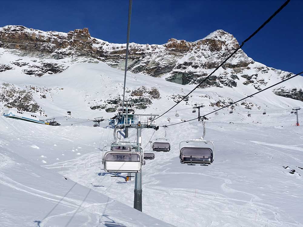 Poznámka: Sedačková lanovka "Bontadini" firmy Leitner vede na Theodulpass (3301 m.n.m.), který je spojnicí mezi italskou Cervinií a švýcarským Zermattem. Na fotografii pohled přes Theodulpass na Klein Matterhorn s vrcholovou stanicí lanovky z Trockener Steg.