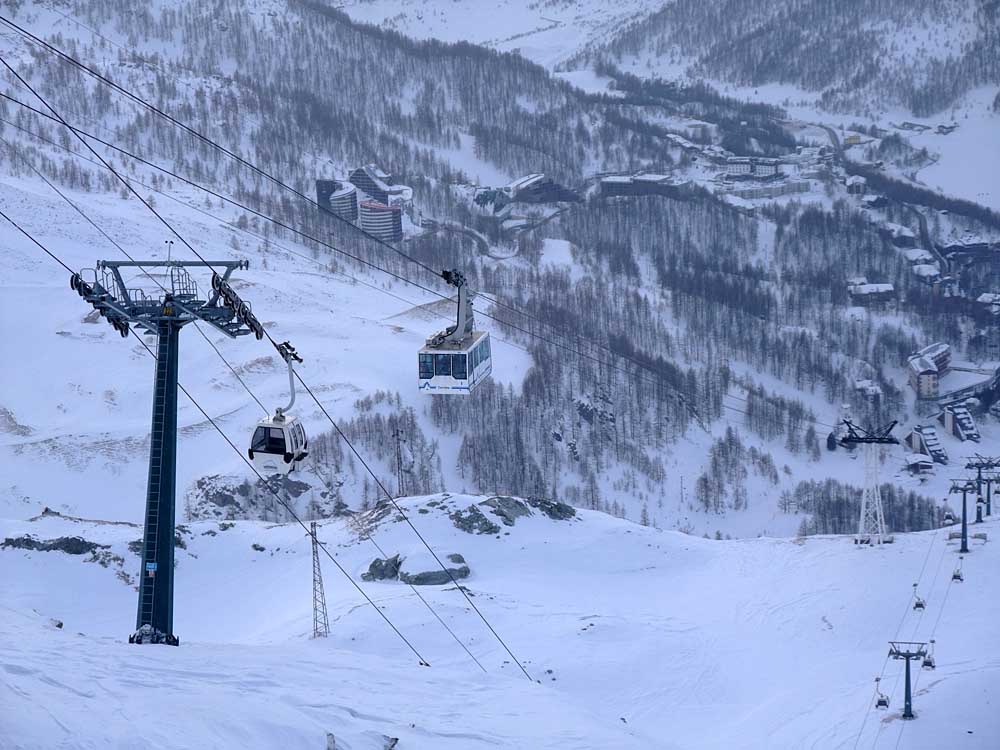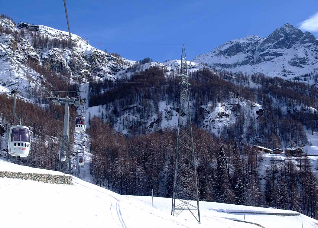 Poznámka: Spojovací lanovka "Du Col" areálů Valtournenche a Cervinia, pohled směr Valtournenche...