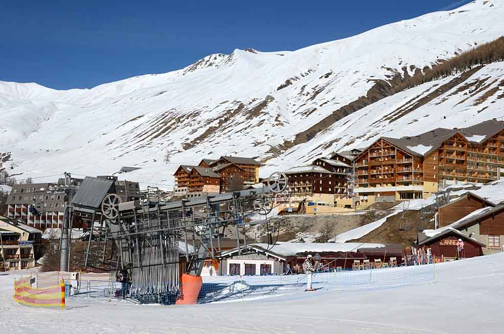 Poznámka: TSD6 Peguieou, jediná ze dvou odpojitelných sedaček v celém areálu, navazuje na TC Molanes s vrcholovou stanicí na Le Peguieou (2479 m.)
