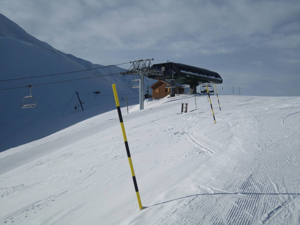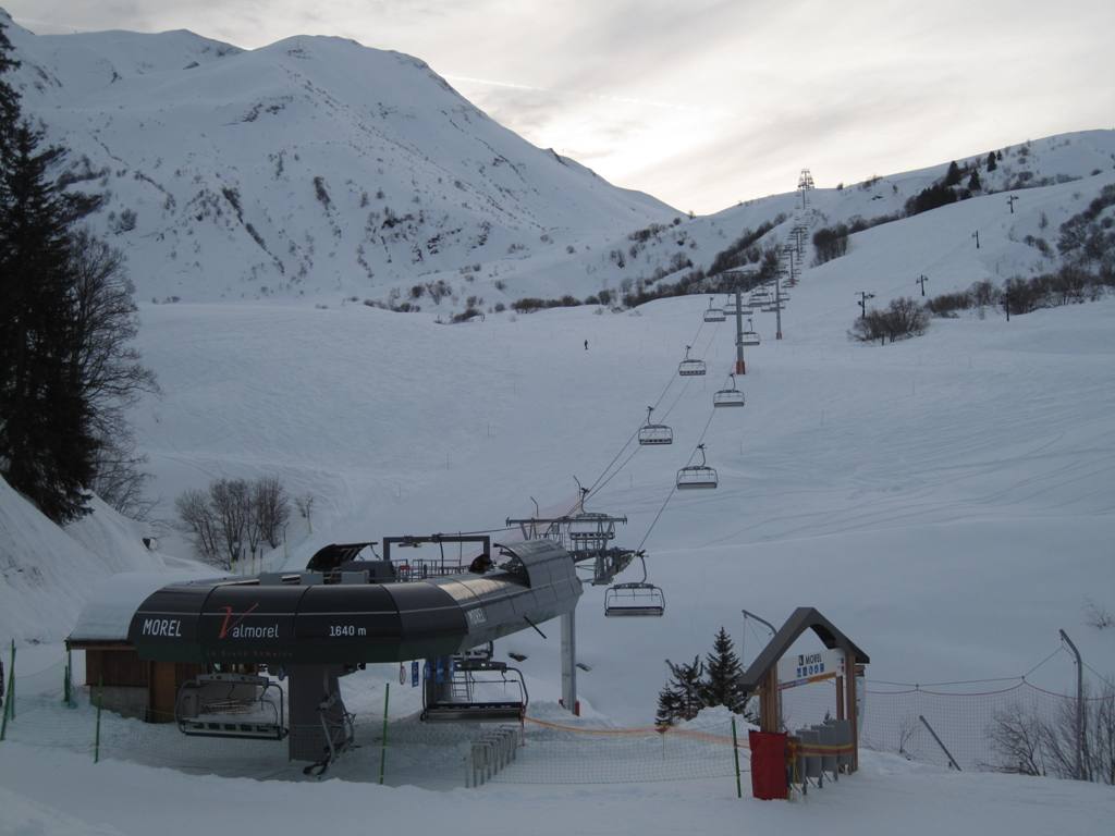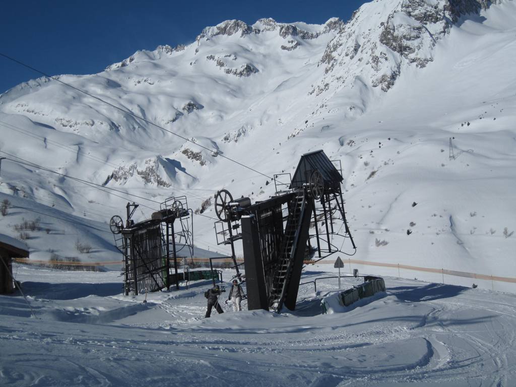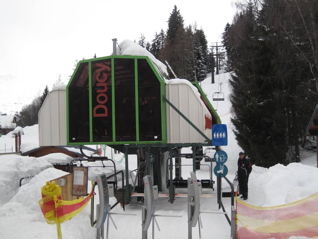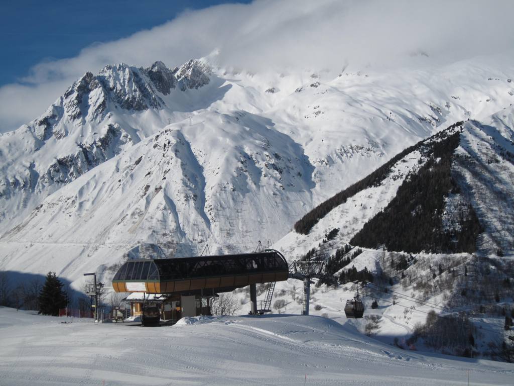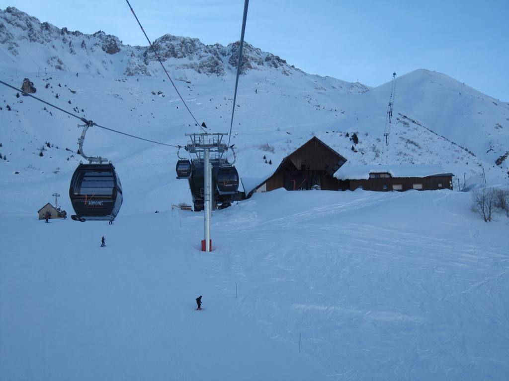 horní stanice kabinky Cellieres, trošku nepochopitelná investice, sjezdovka dolu nevede, ve vesnice u spodní stanice navíc nejsou ani ubytovací kapacity, na parkovišti tam většinou stály maximálně tři auta