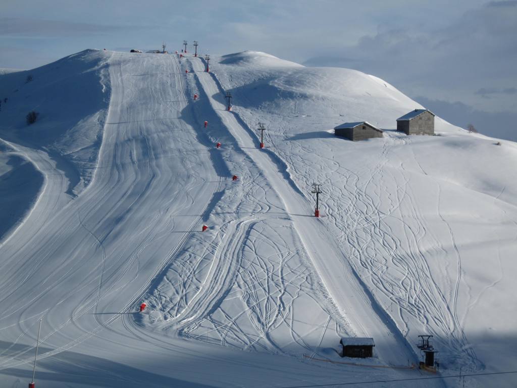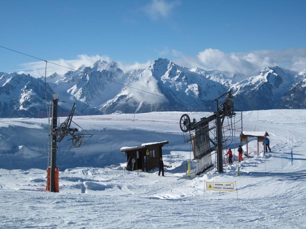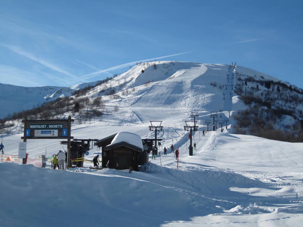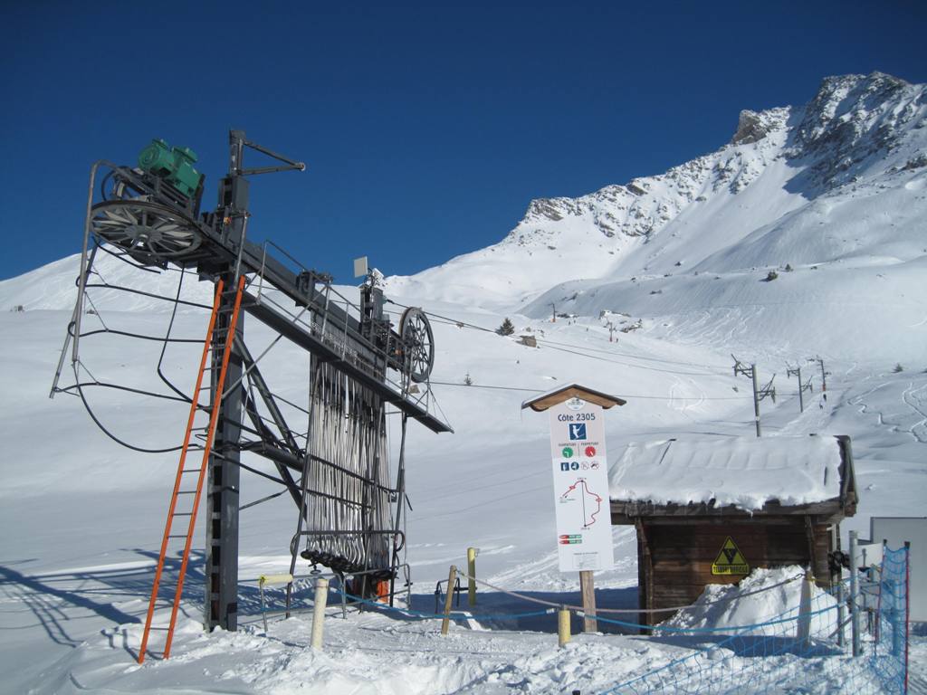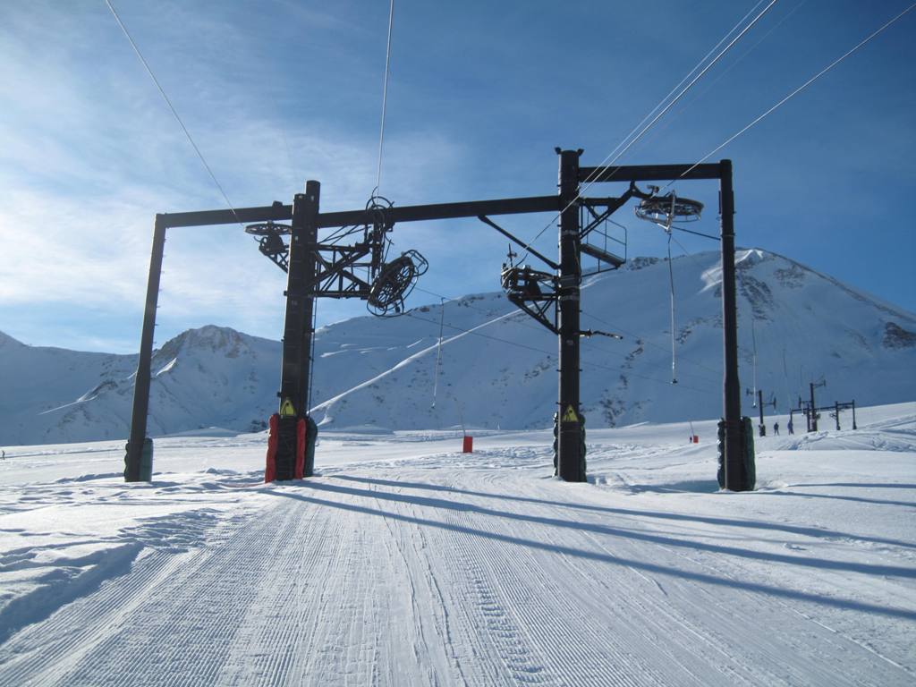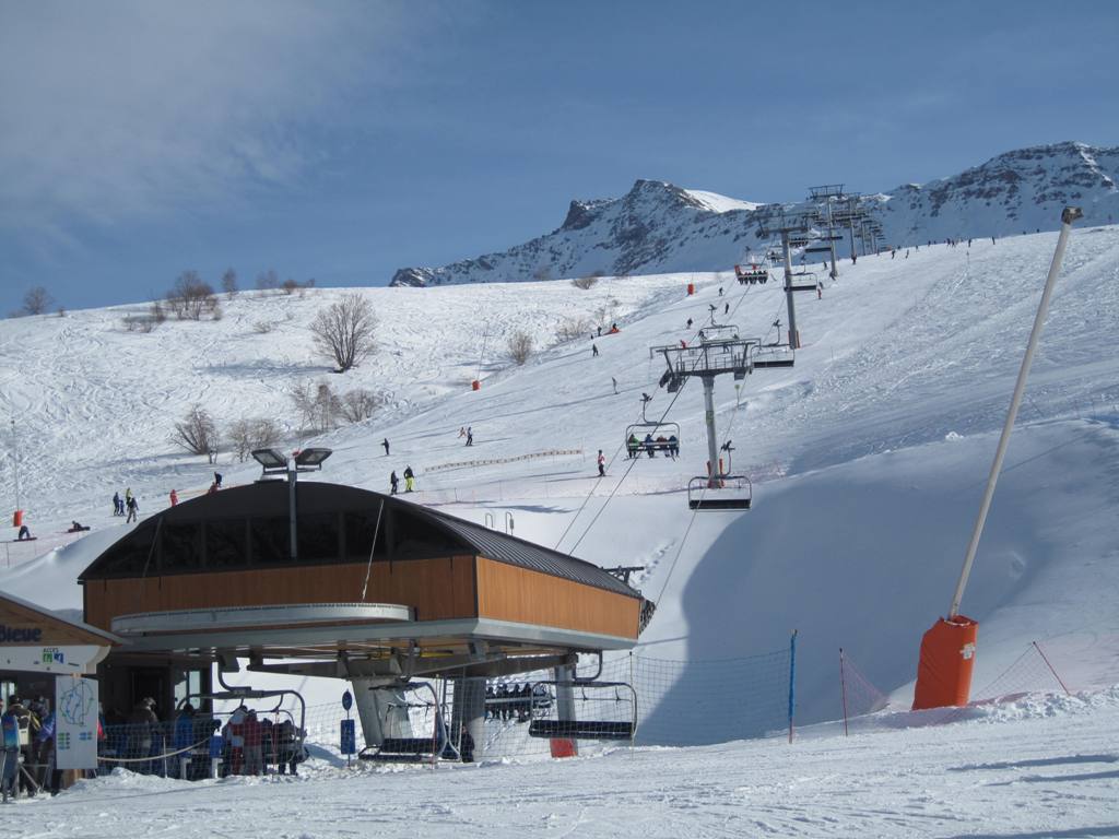 horní stanice kabinky Cellieres, trošku nepochopitelná investice, sjezdovka dolu nevede, ve vesnice u spodní stanice navíc nejsou ani ubytovací kapacity, na parkovišti tam většinou stály maximálně tři auta