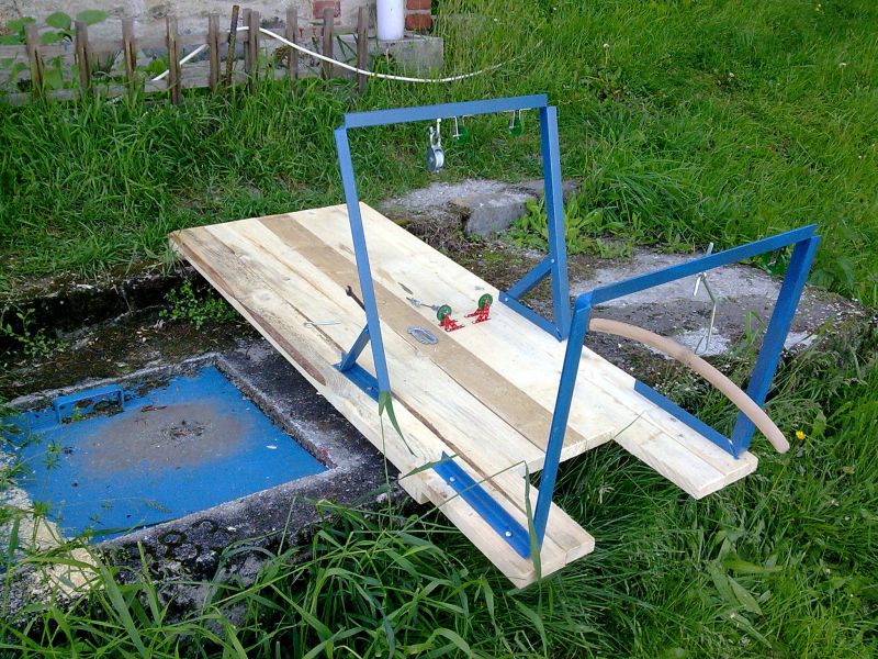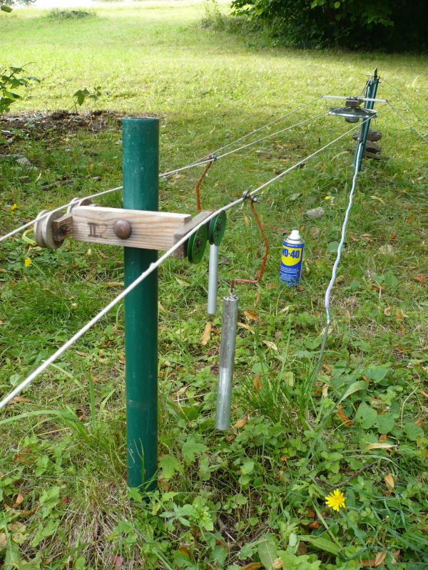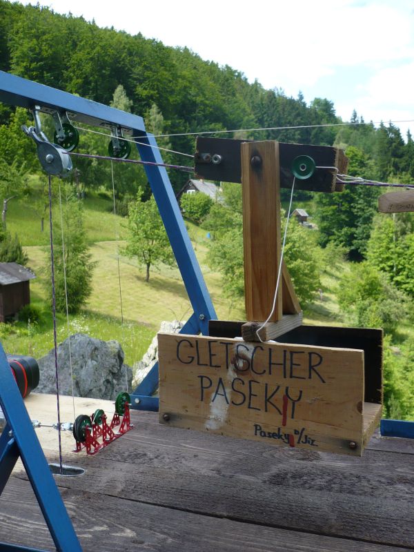 Poprvé jsem přispěl do vlákna o blbnutí s lanovkama, takže historii připomenu udtamtud: Visutá kabinovka se mi nejprve proháněla jen na nataženém provaze mezi stromy. Pak přišla úprava závěsu na jednostranný pro možnost jízdy přes podpěry, pak sbastlení horní stanice ze shnilého schodu. O pár let později již povedenější montáž dolní stanice. Vše poháněno jen taháním za tažný provázek-zde byl po léta největším kamenem úrazu pohon vyžadující plynulou regulaci, obousměrný chod a přívod elektrické energie do lokality hodné provozu této vistuté dráhy pod širým nebem. Až letos na jaře se realizace dočkal funkční a bezporuchový provoz lanovky 36 metrů dlouhé, poháněné akuvrtačkou-340 ot/min, rychlost ~0,75 m/s, napínání je prováděno závažím (15 kg) v horní stanici.