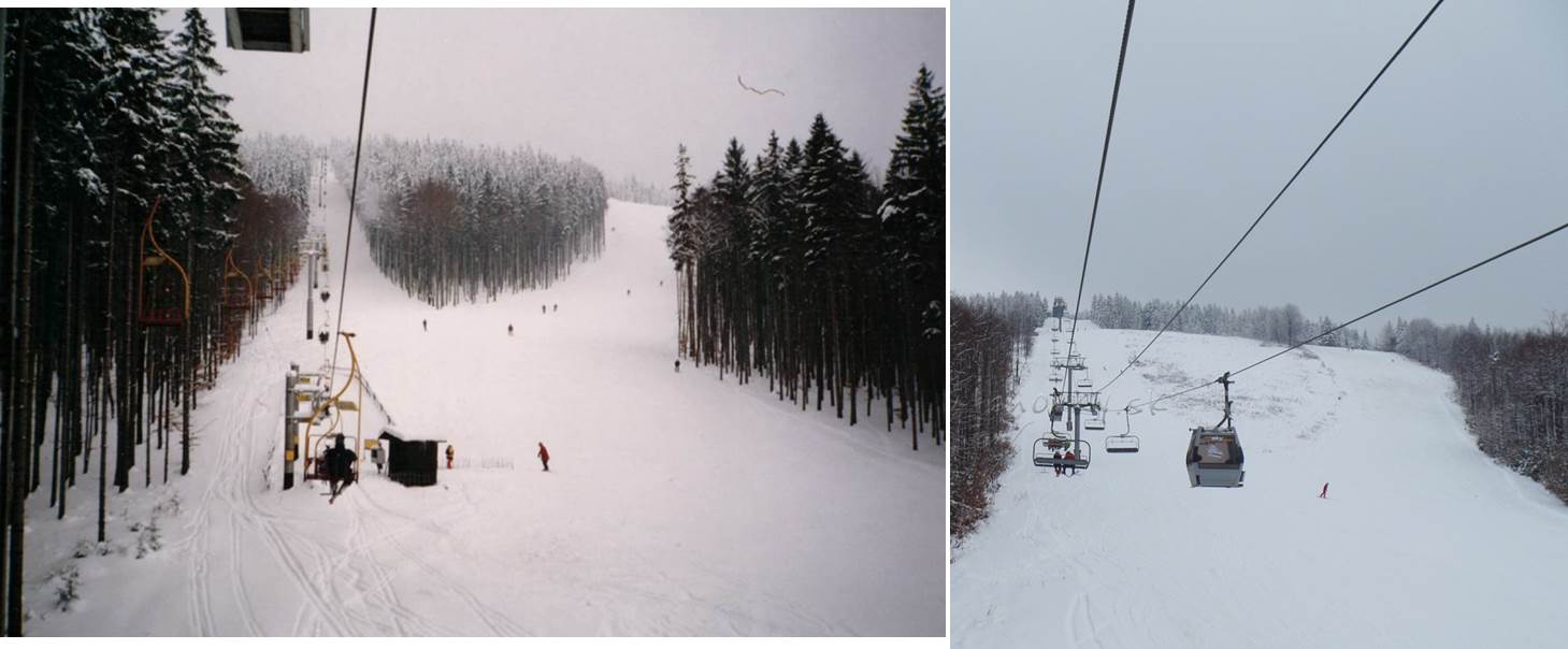 ve výrazně zalomené trase. Nalevo od tehdy výrazně užší sjezdovky Marguška II je patrný průsek zrušeného EPV, kdysi příležitostně provozovaného místní TJ.