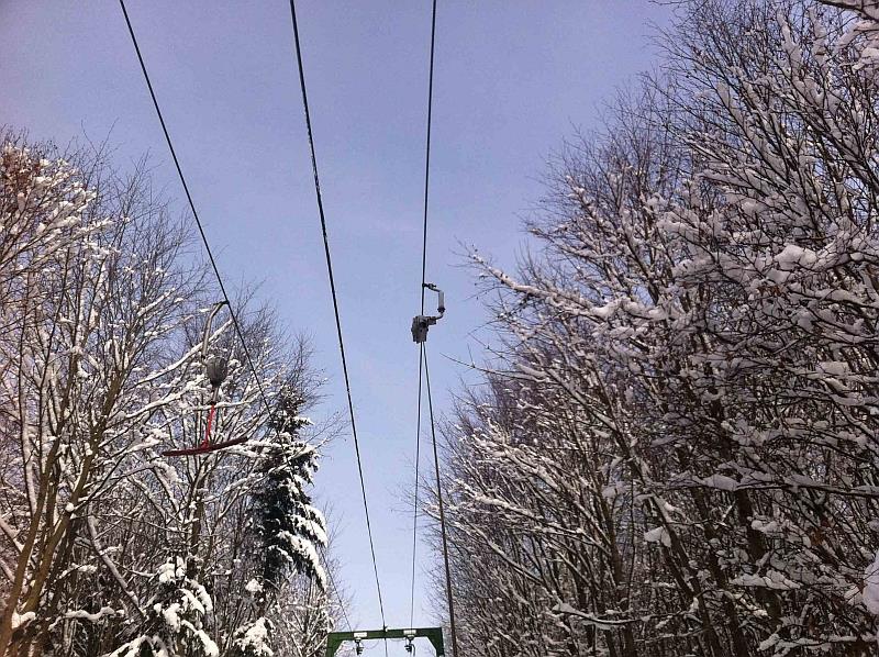 :arrow: Transporta tento rok už slaví 40 let. Na trasnportě se udělala jenom revize, žádné opravy nebo tak. Kotva už ale pomalu dosluhuje. V sobotu jim v jednom místě padalo lano z kladky. Takže někdy nejezdila i půl hodiny a jet dolů bylo jako vhodit lístek do loterie, protože jinak jste museli nahoru šlapat. Naštěstí já měl vždy štěstí. další problém je v této situaci: dole není ani telefon na horní boudu a na mobil není dole signál :D . Dolů naštěstí jezdili zkušení lyžaři, takže při čekání než se kladka opravila byla super nálada.