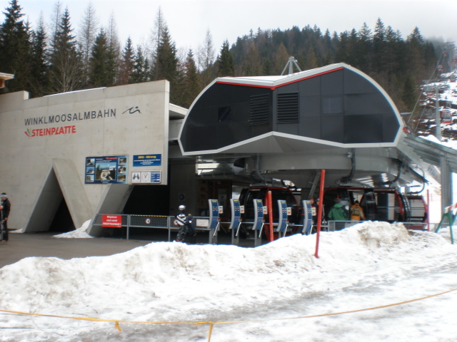 Pohled k horní stanici Schattbergbahn, vidět je i horní stanice původní kyvadlovky, kdysi největší v Rakousku (100-místné kabiny)