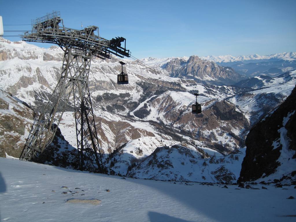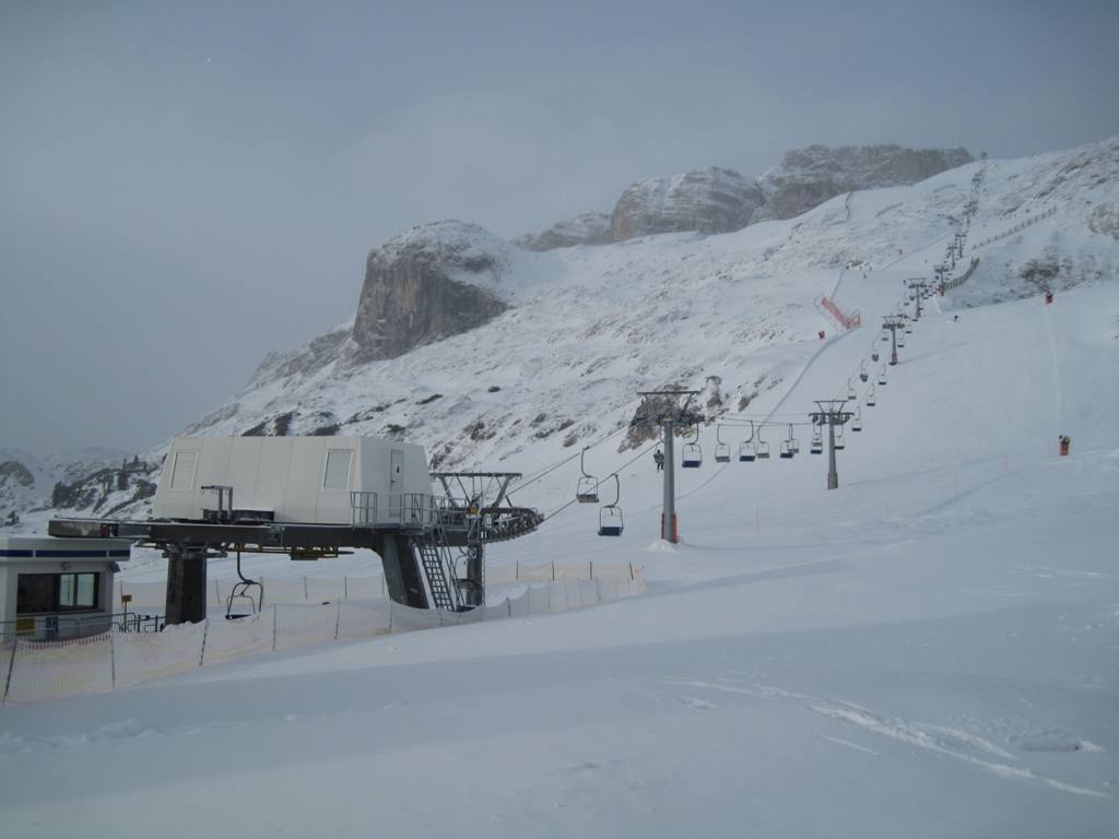 Dvousedačka Portados (výrobce Nascivera) z Arabby, bohužel po zrušení navazující dvousedačky Carpazza už není možnost pokračovat odtud směrem na Belvedere. Musí se využít kabin.